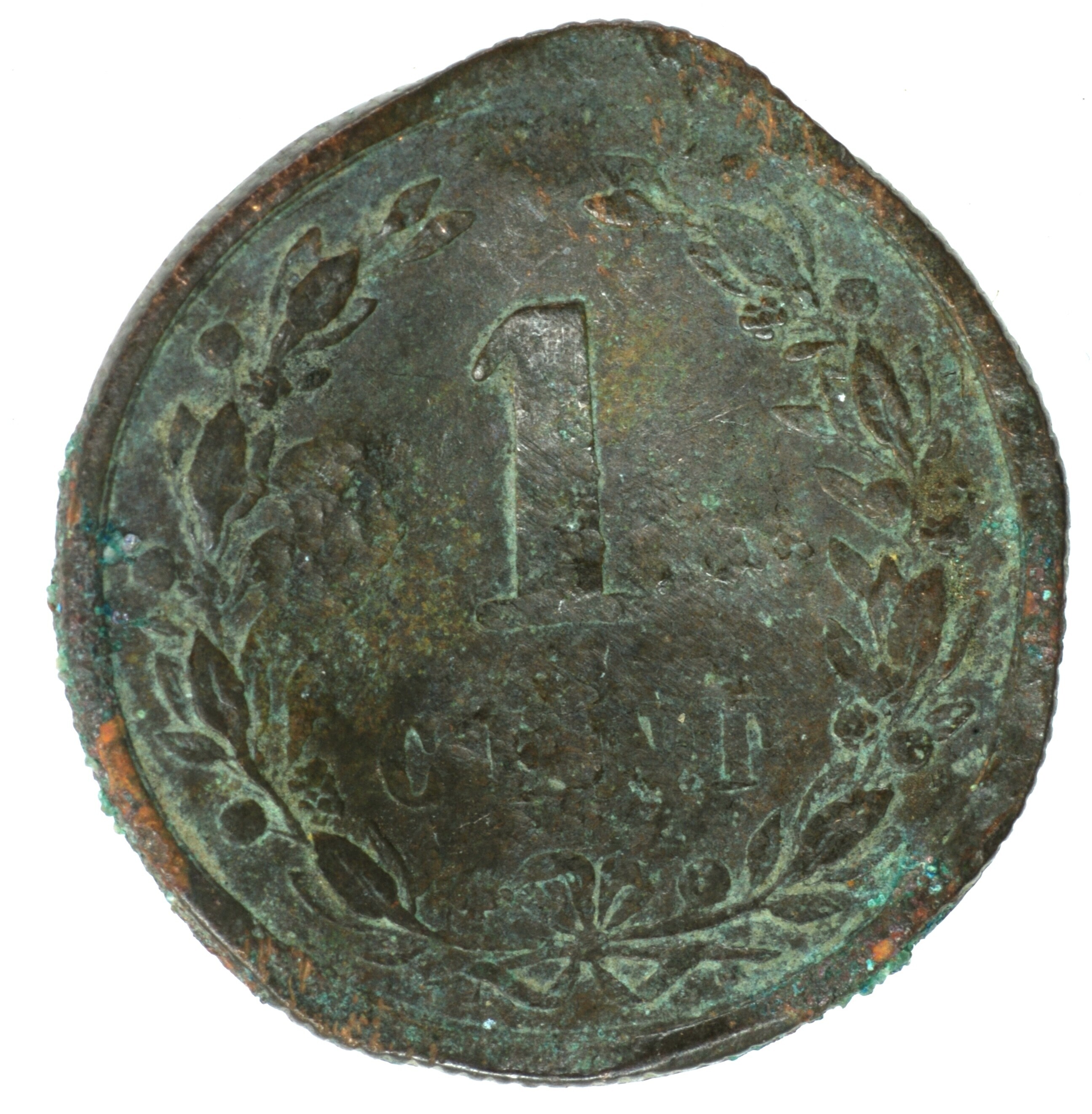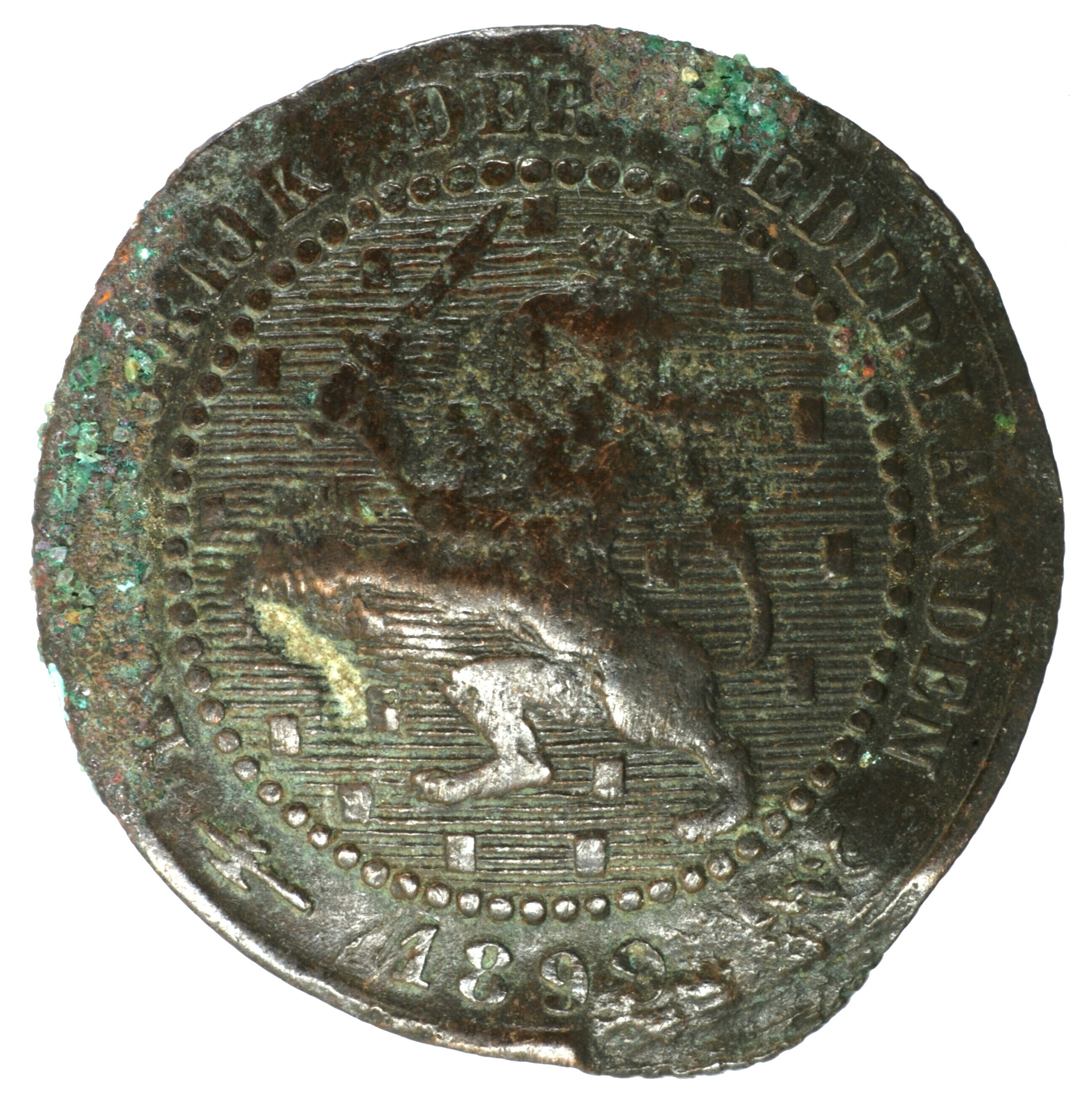 Cent; Nederland Koninkrijk (1813-heden); Wilhelmina (1890-1948); vz.: klimmende leeuw naar links met zwaard en pijlenbundel op een veld van azuur met zeventien blokken binnen parelcirkel, met omschrift (hellebaard) KONINGRIJK DER NEDERLANDEN (mercuriusstaf) 1899; kz.: binnen een krans van twee samengebonden oranjetakken in twee regels: 1 / CENT; muntplaats: Utrecht; gewicht: 2.49 gram; referentie: Schulman 967