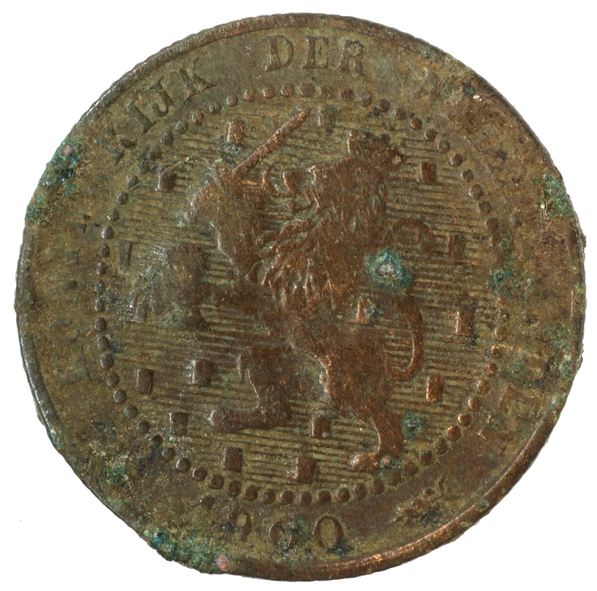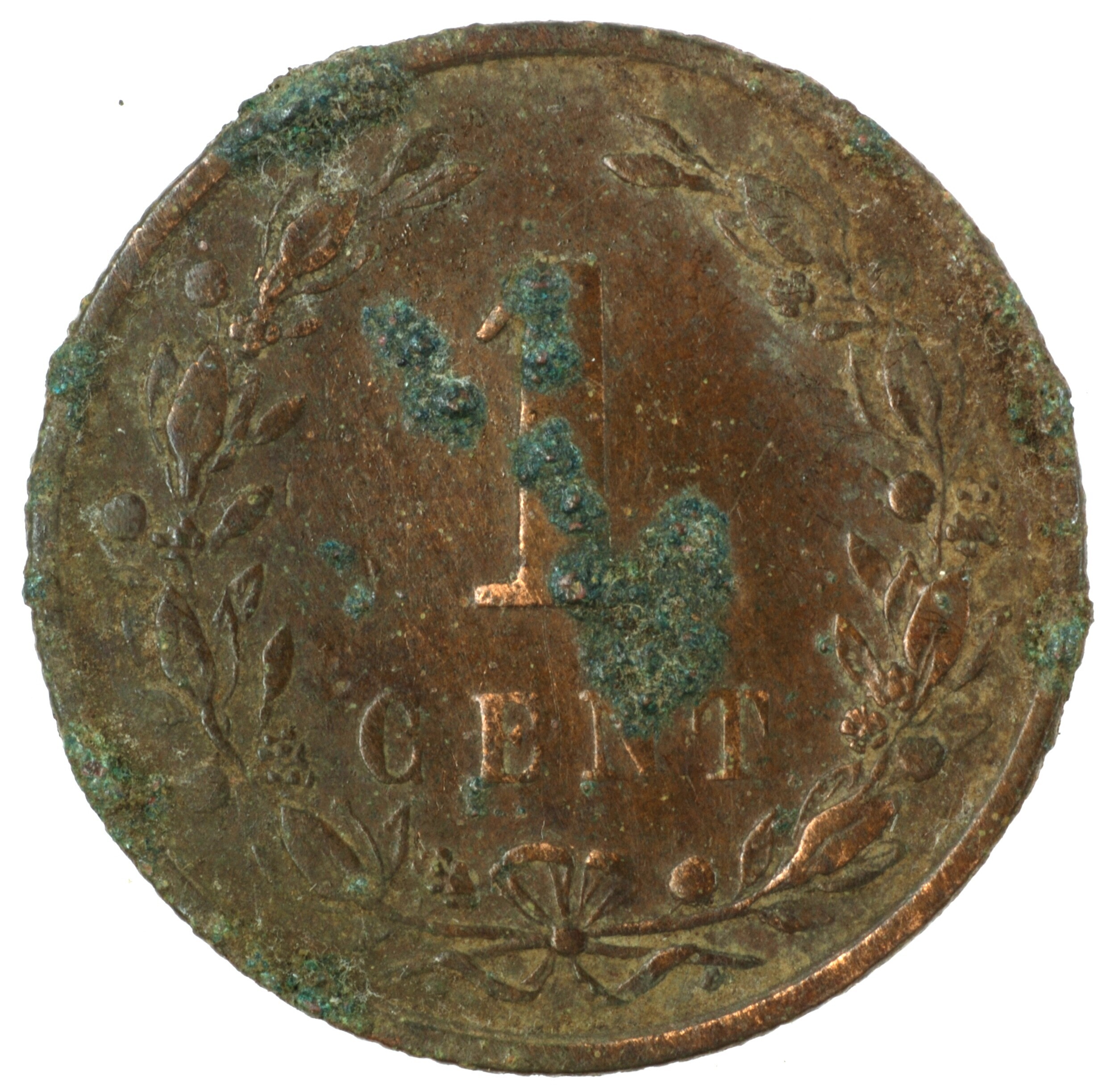 Cent; Nederland Koninkrijk (1813-heden); Wilhelmina (1890-1948); vz.: klimmende leeuw naar links met zwaard en pijlenbundel op een veld van azuur met zeventien blokken binnen parelcirkel, met omschrift (hellebaard) KONINGRIJK DER NEDERLANDEN (mercuriusstaf) 1900; kz.: binnen een krans van twee samengebonden oranjetakken in twee regels: 1 / CENT; muntplaats: Utrecht; gewicht: 2.57 gram; referentie: Schulman 968