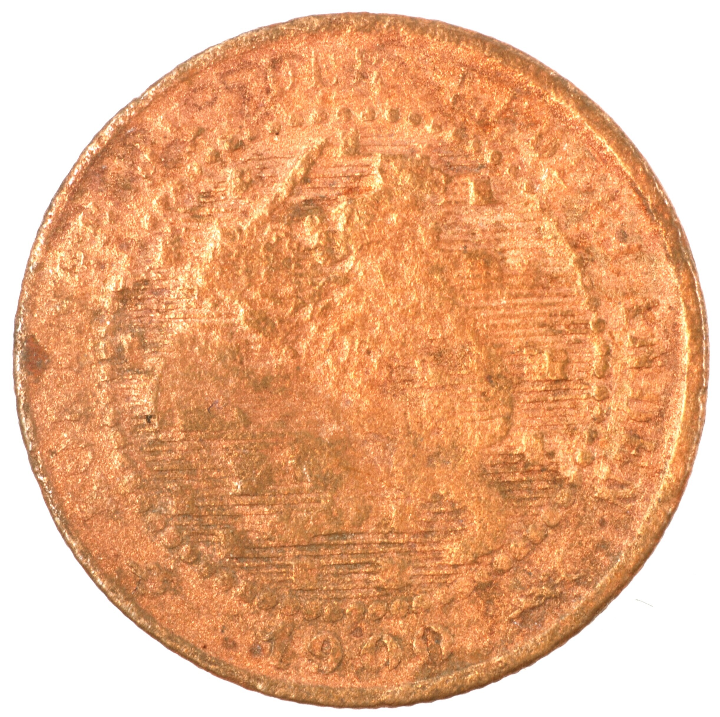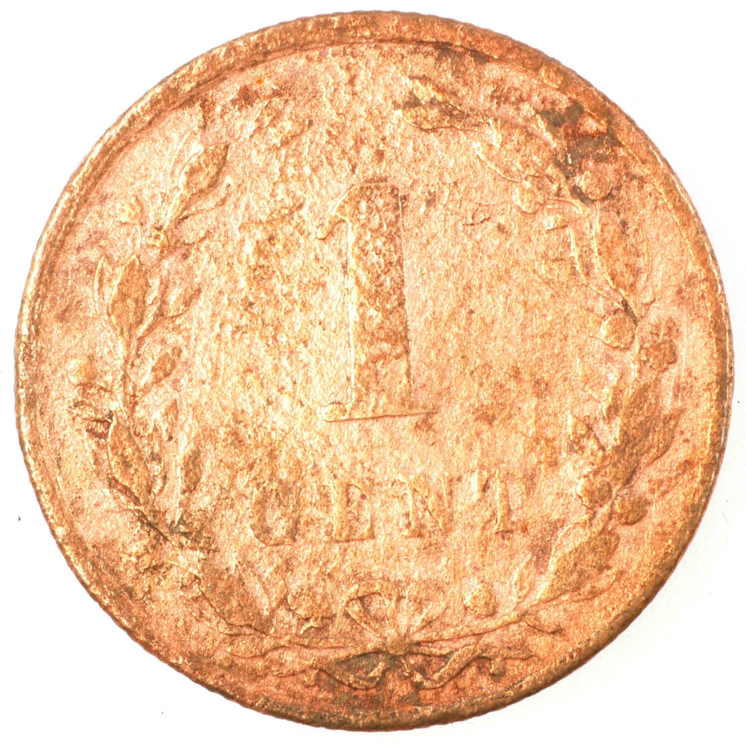 Cent; Nederland Koninkrijk (1813-heden); Wilhelmina (1890-1948); vz.: klimmende leeuw naar links met zwaard en pijlenbundel op een veld van azuur met zeventien blokken binnen parelcirkel, met omschrift (hellebaard) KONINGRIJK DER NEDERLANDEN (mercuriusstaf) 1900; kz.: binnen een krans van twee samengebonden oranjetakken in twee regels: 1 / CENT; muntplaats: Utrecht; gewicht: 2.30 gram; referentie: Schulman 968