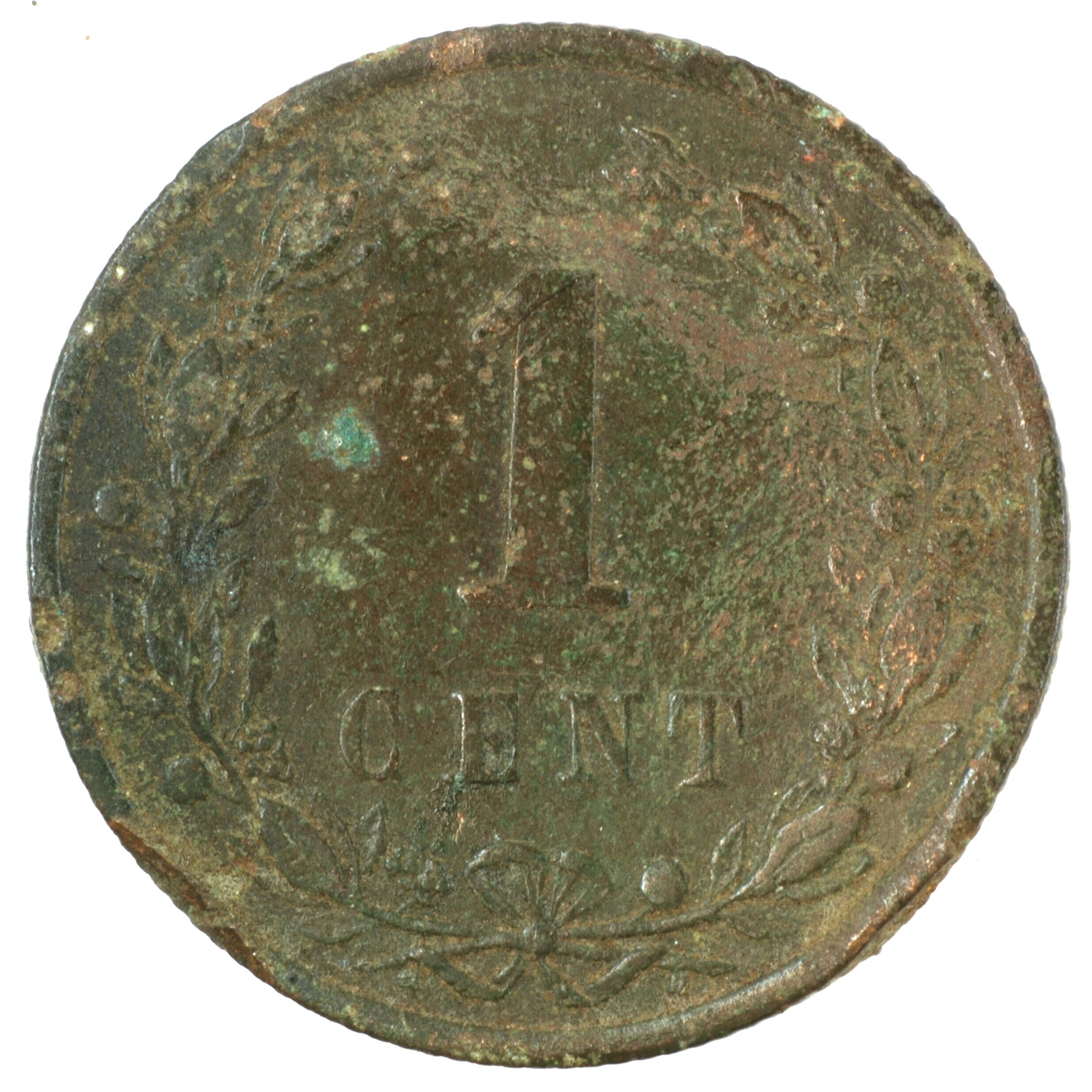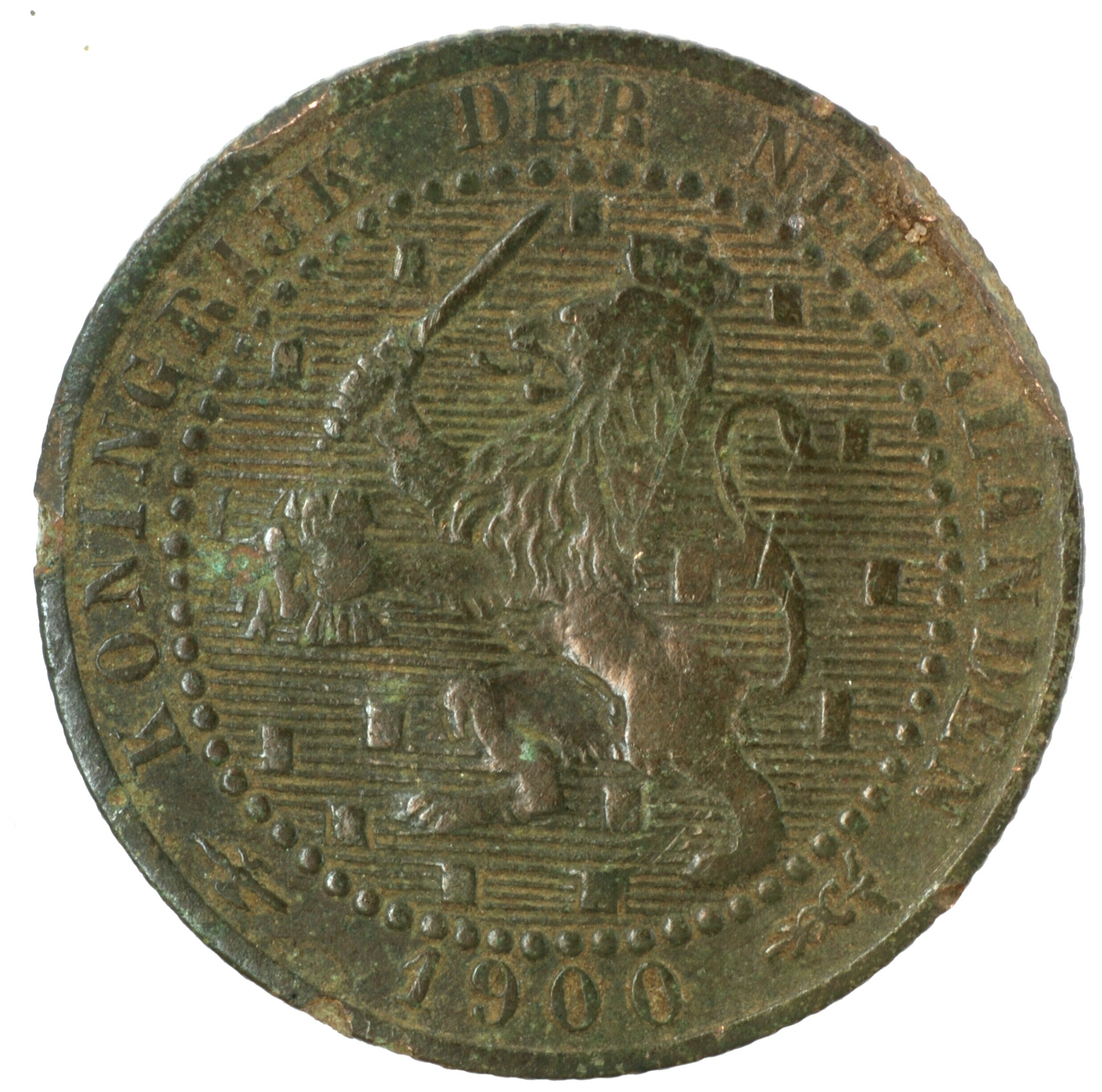 Cent; Nederland Koninkrijk (1813-heden); Wilhelmina (1890-1948); vz.: klimmende leeuw naar links met zwaard en pijlenbundel op een veld van azuur met zeventien blokken binnen parelcirkel, met omschrift (hellebaard) KONINGRIJK DER NEDERLANDEN (mercuriusstaf) 1900; kz.: binnen een krans van twee samengebonden oranjetakken in twee regels: 1 / CENT; muntplaats: Utrecht; gewicht: 2.33 gram; referentie: Schulman 968