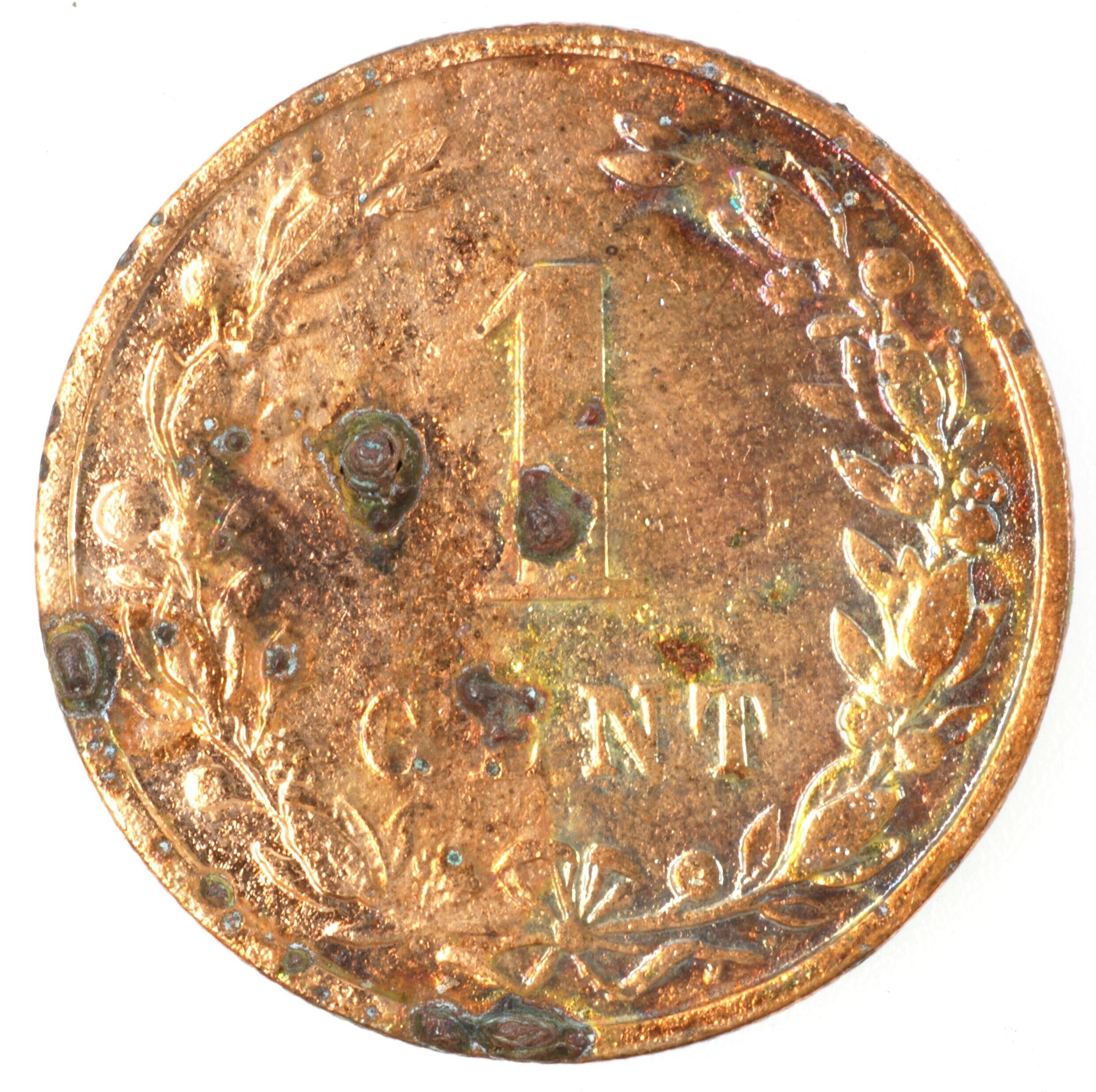 Cent; Nederland Koninkrijk (1813-heden); Wilhelmina (1890-1948); vz.: klimmende leeuw naar links met zwaard en pijlenbundel op een veld van azuur met tien blokken binnen parelcirkel, met omschrift (hellebaard) KONINGRIJK DER NEDERLANDEN (mercuriusstaf) 1901; kz.: binnen een krans van twee samengebonden oranjetakken in twee regels: 1 / CENT; muntplaats: Utrecht; gewicht: 2.19 gram; referentie: Schulman 970