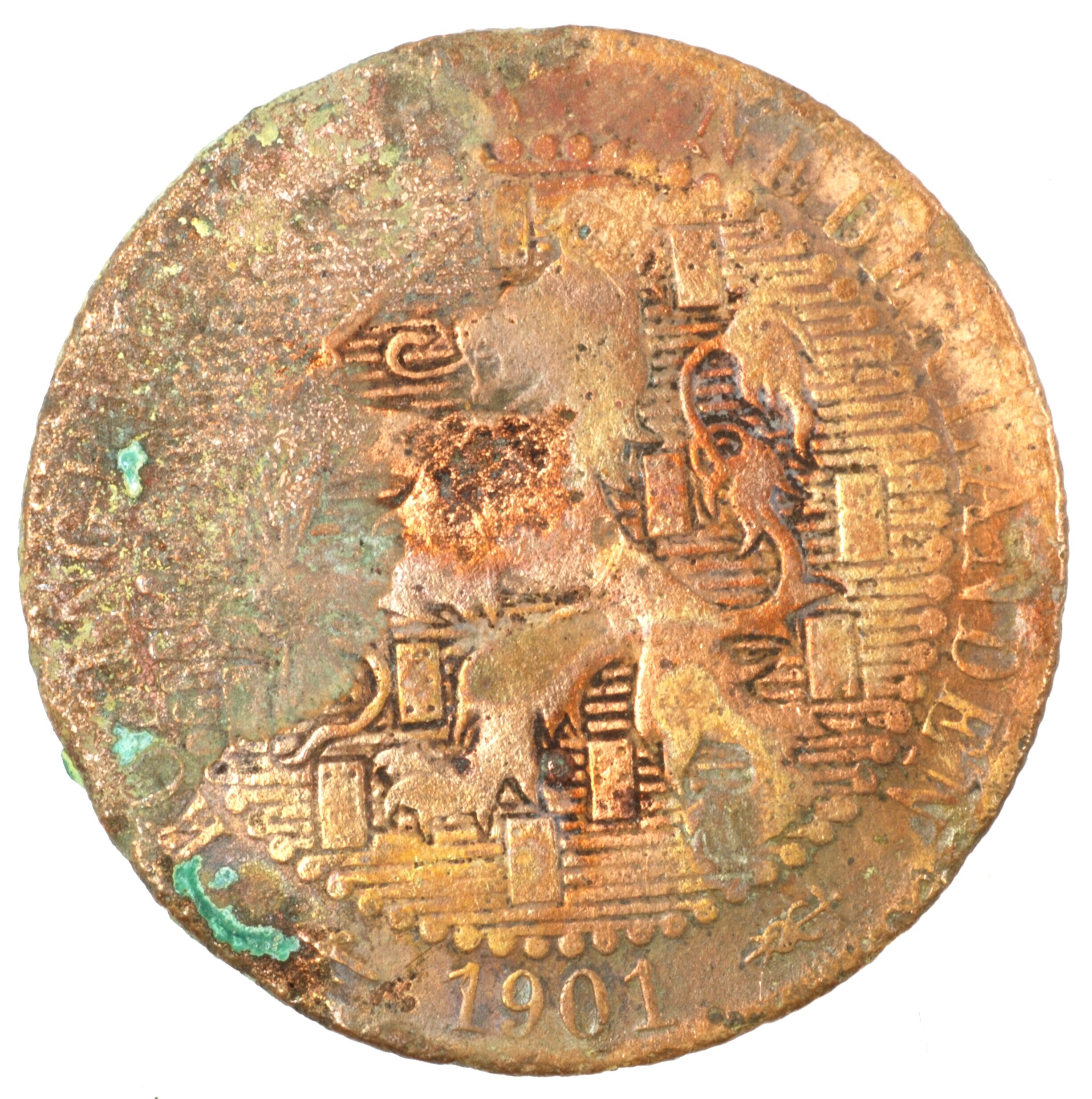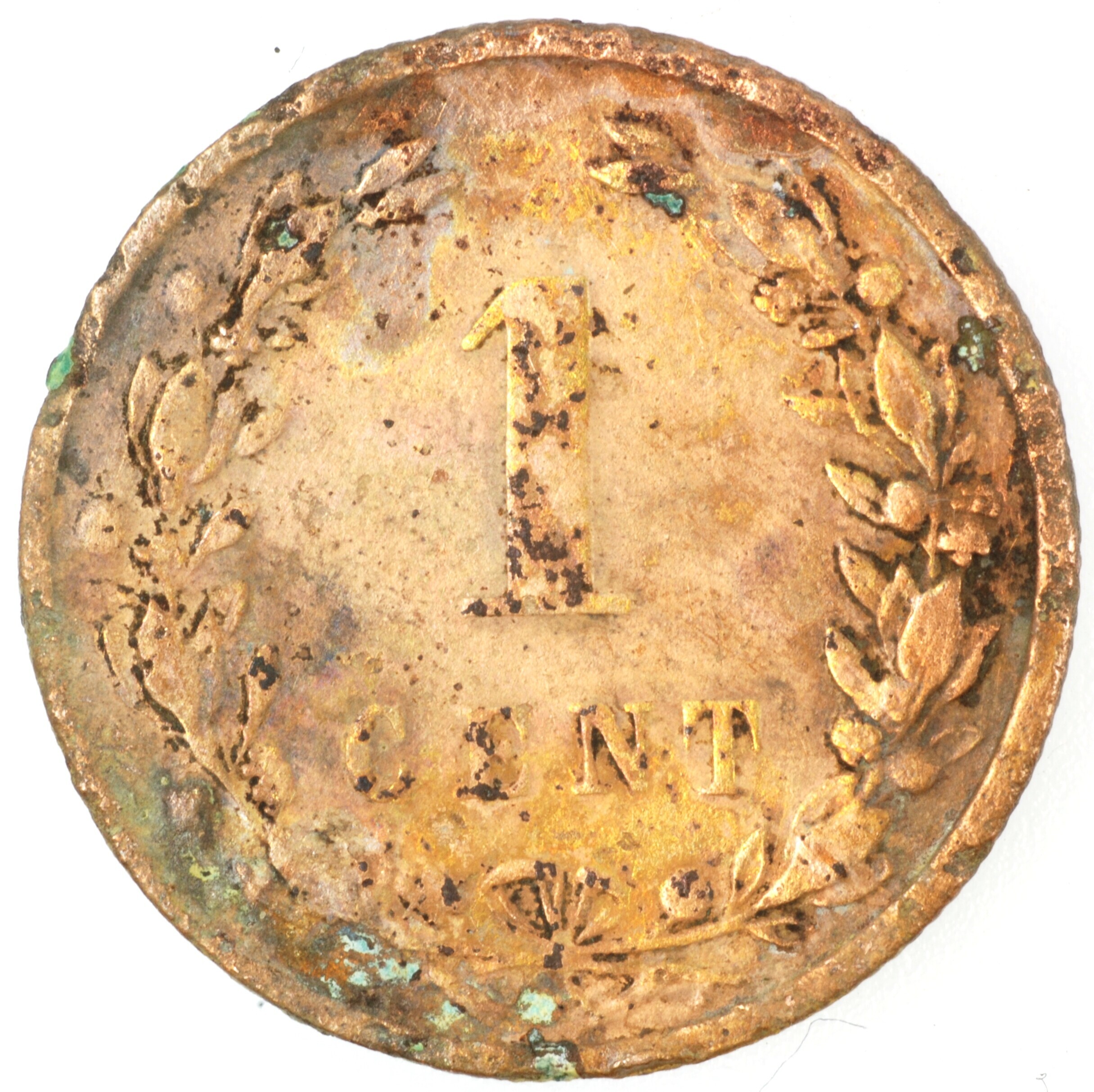 Cent; Nederland Koninkrijk (1813-heden); Wilhelmina (1890-1948); vz.: klimmende leeuw naar links met zwaard en pijlenbundel op een veld van azuur met zeventien blokken binnen parelcirkel, met omschrift (hellebaard) KONINKRIJK [DER] NEDERLANDEN (mercuriusstaf) 1900; kz.: binnen een krans van twee samengebonden oranjetakken in twee regels: 1 / CENT; muntplaats: Utrecht; gewicht: 2.22 gram; referentie: Schulman 969
