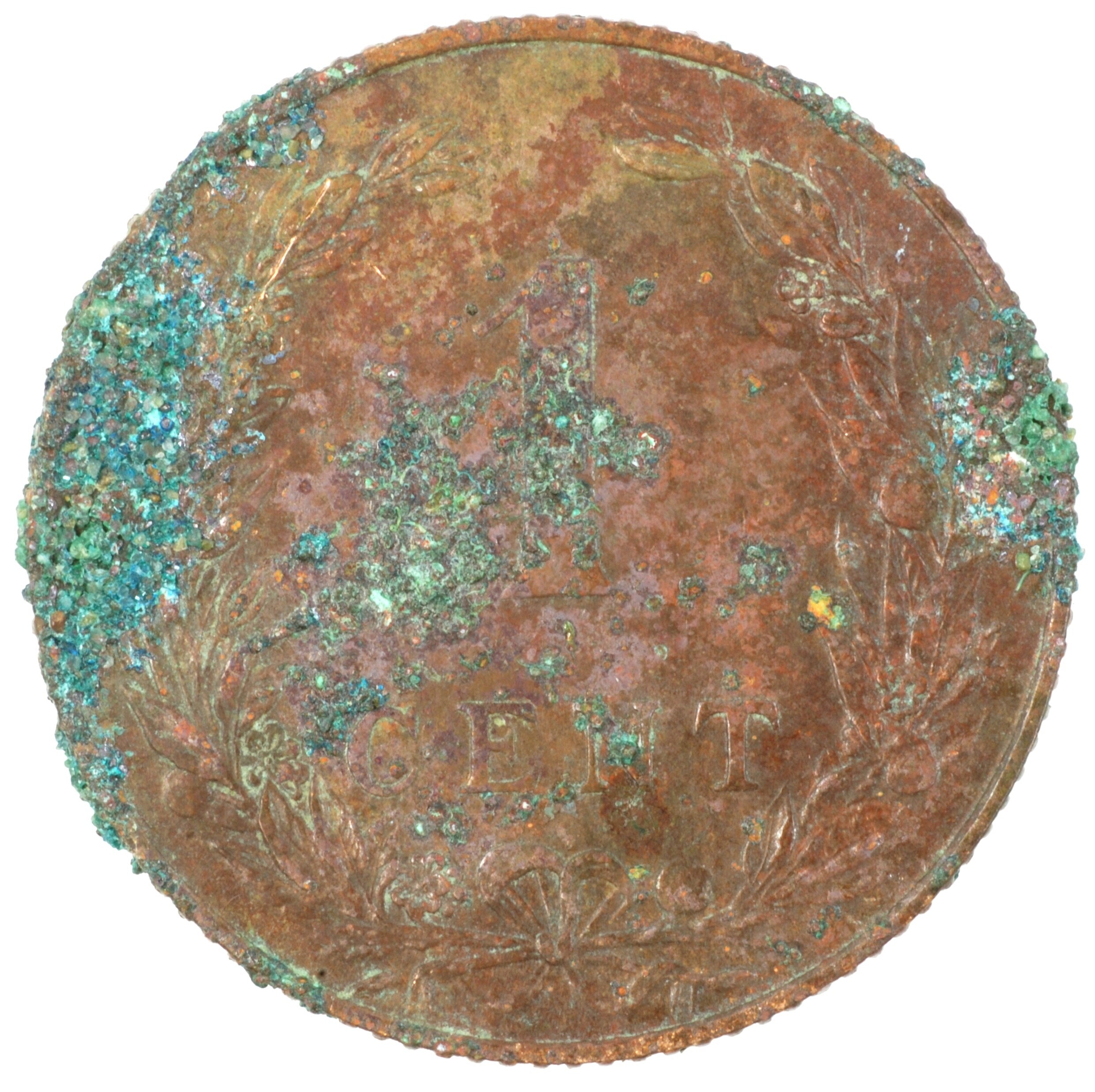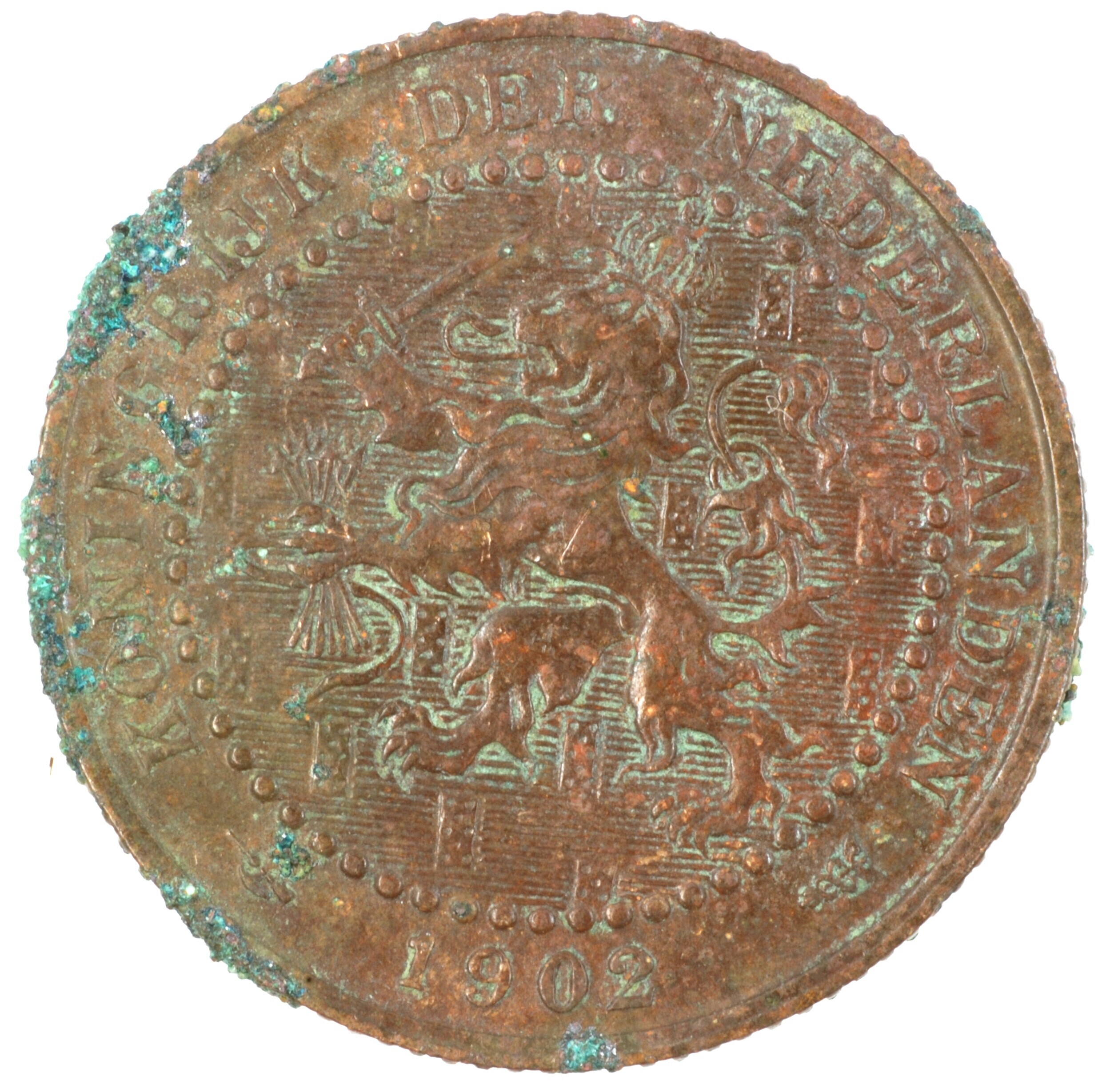 Cent; Nederland Koninkrijk (1813-heden); Wilhelmina (1890-1948); vz.: klimmende leeuw naar links met zwaard en pijlenbundel op een veld van azuur met vijftien blokken binnen parelcirkel, met omschrift (hellebaard) KONINGRIJK DER NEDERLANDEN (mercuriusstaf) 1902; kz.: binnen een krans van twee samengebonden oranjetakken in twee regels: 1 / CENT; muntplaats: Utrecht; gewicht: 2.48 gram; referentie: Schulman 971