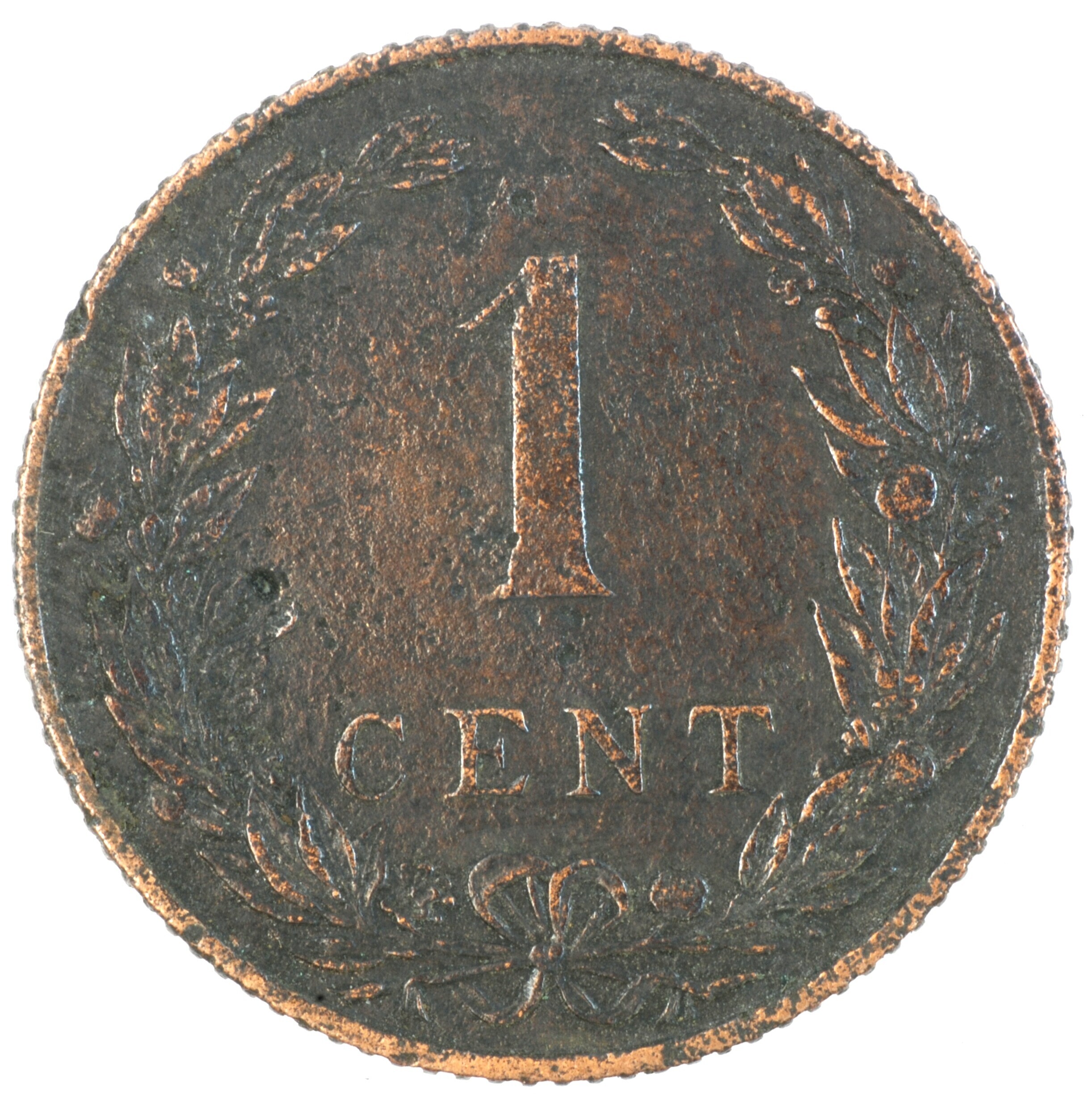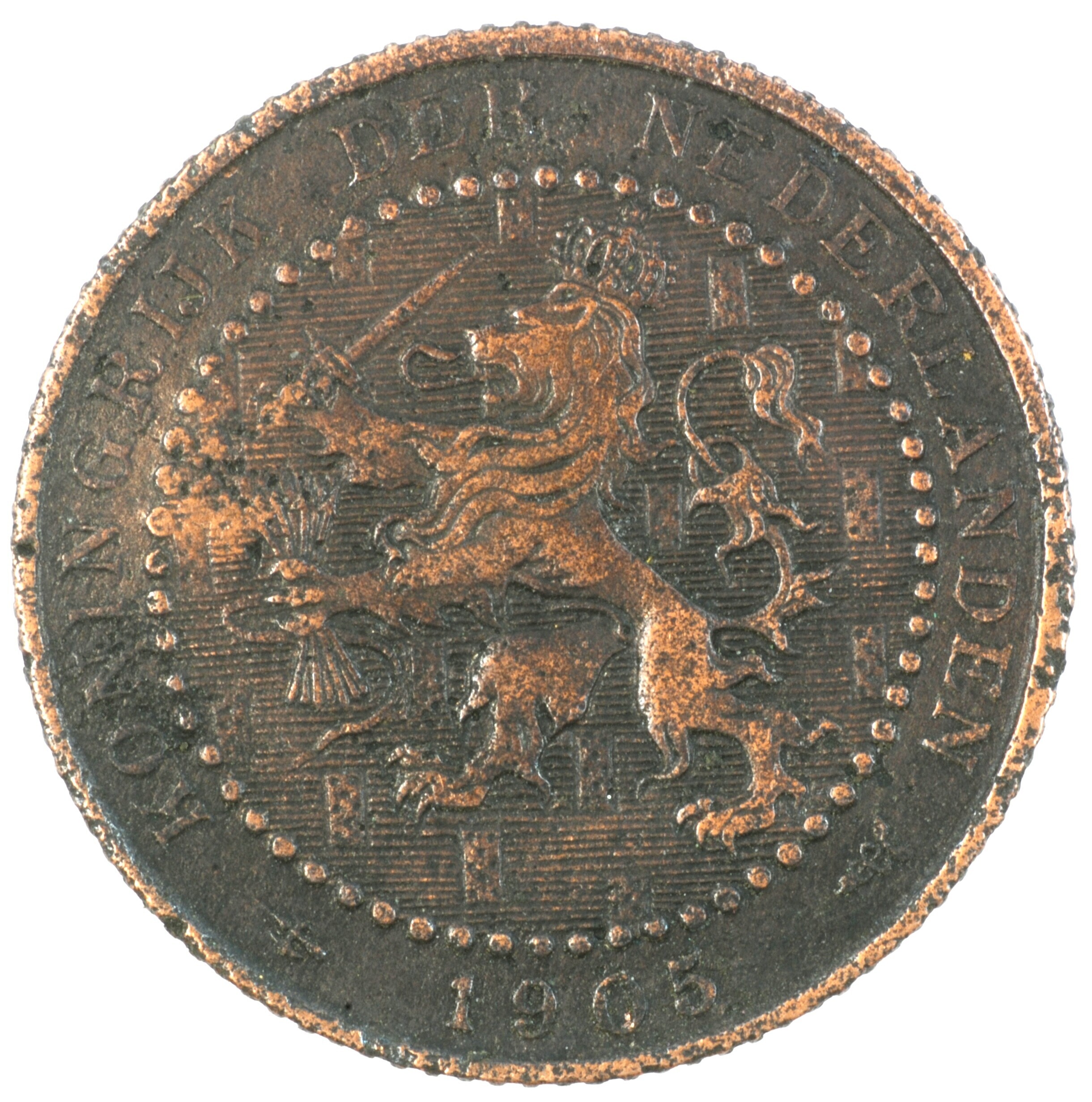 Cent; Nederland Koninkrijk (1813-heden); Wilhelmina (1890-1948); vz.: klimmende leeuw naar links met zwaard en pijlenbundel op een veld van azuur met vijftien blokken binnen parelcirkel, met omschrift (hellebaard) KONINGRIJK DER NEDERLANDEN (mercuriusstaf) 1905; kz.: binnen een krans van twee samengebonden oranjetakken in twee regels: 1 / CENT; muntplaats: Utrecht; 2.44 gram; referentie: Schulman 973