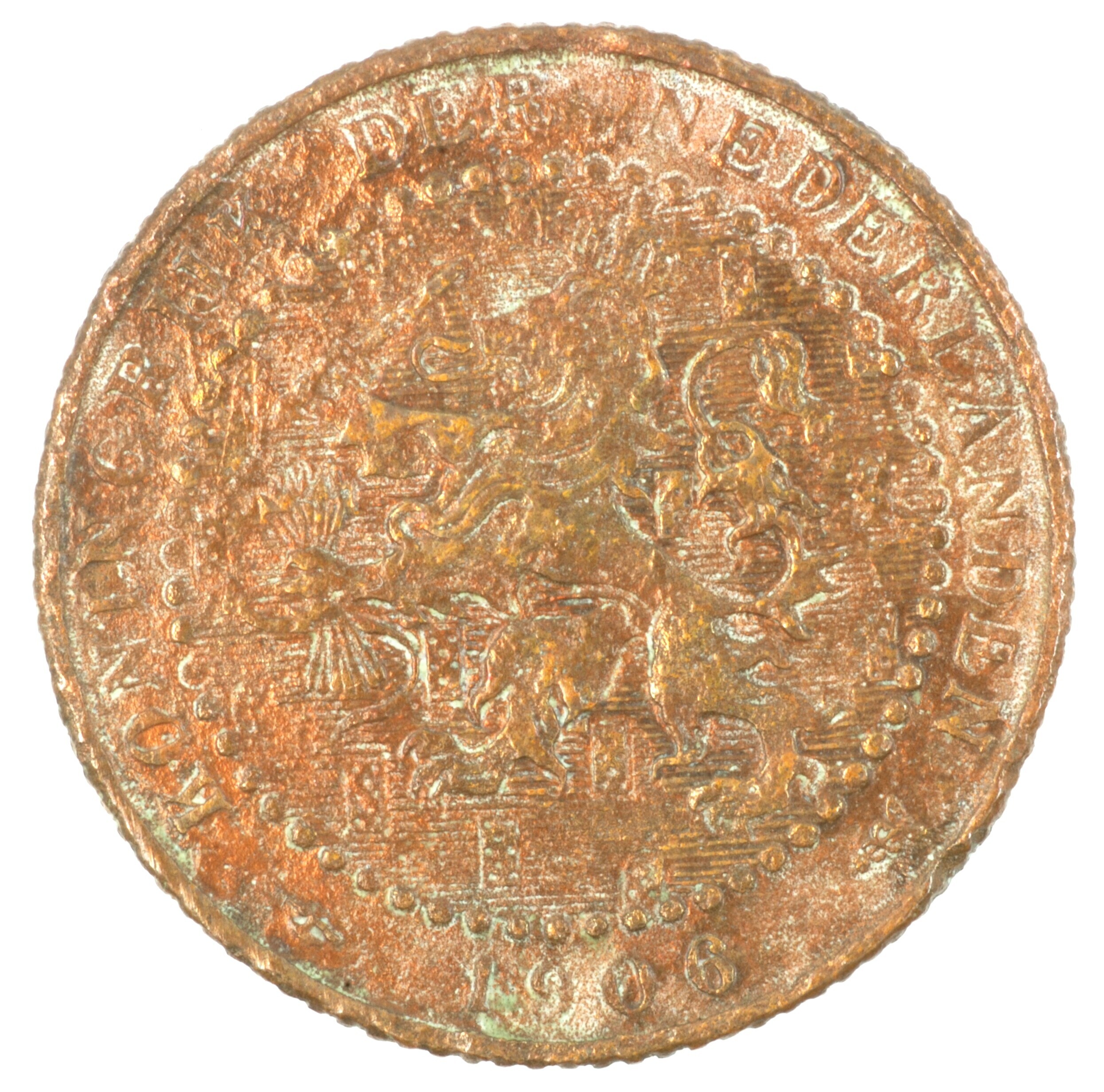 Cent; Nederland Koninkrijk (1813-heden); Wilhelmina (1890-1948); vz.: klimmende leeuw naar links met zwaard en pijlenbundel op een veld van azuur met vijftien blokken binnen parelcirkel, met omschrift (hellebaard) KONINGRIJK DER NEDERLANDEN (mercuriusstaf) 1906; kz.: binnen een krans van twee samengebonden oranjetakken in twee regels: 1 / CENT; muntplaats: Utrecht; 2.17 gram; referentie: Schulman 974