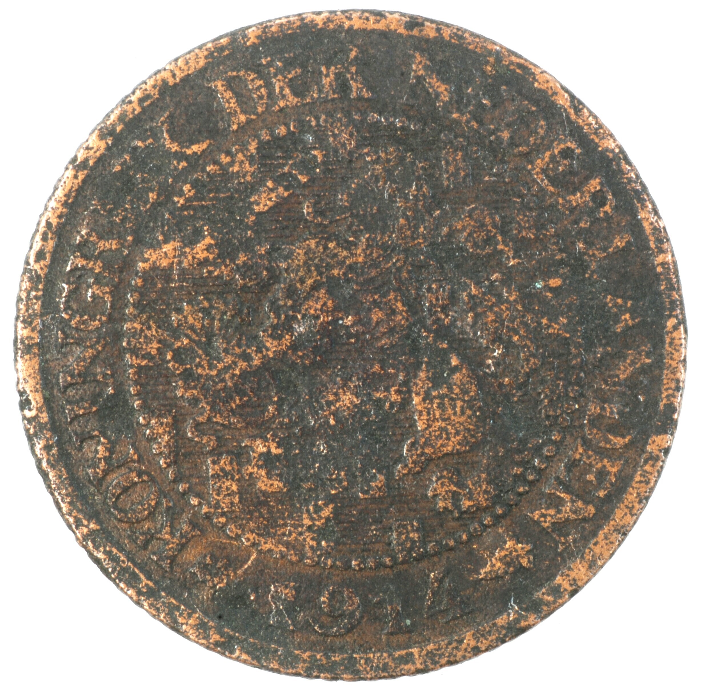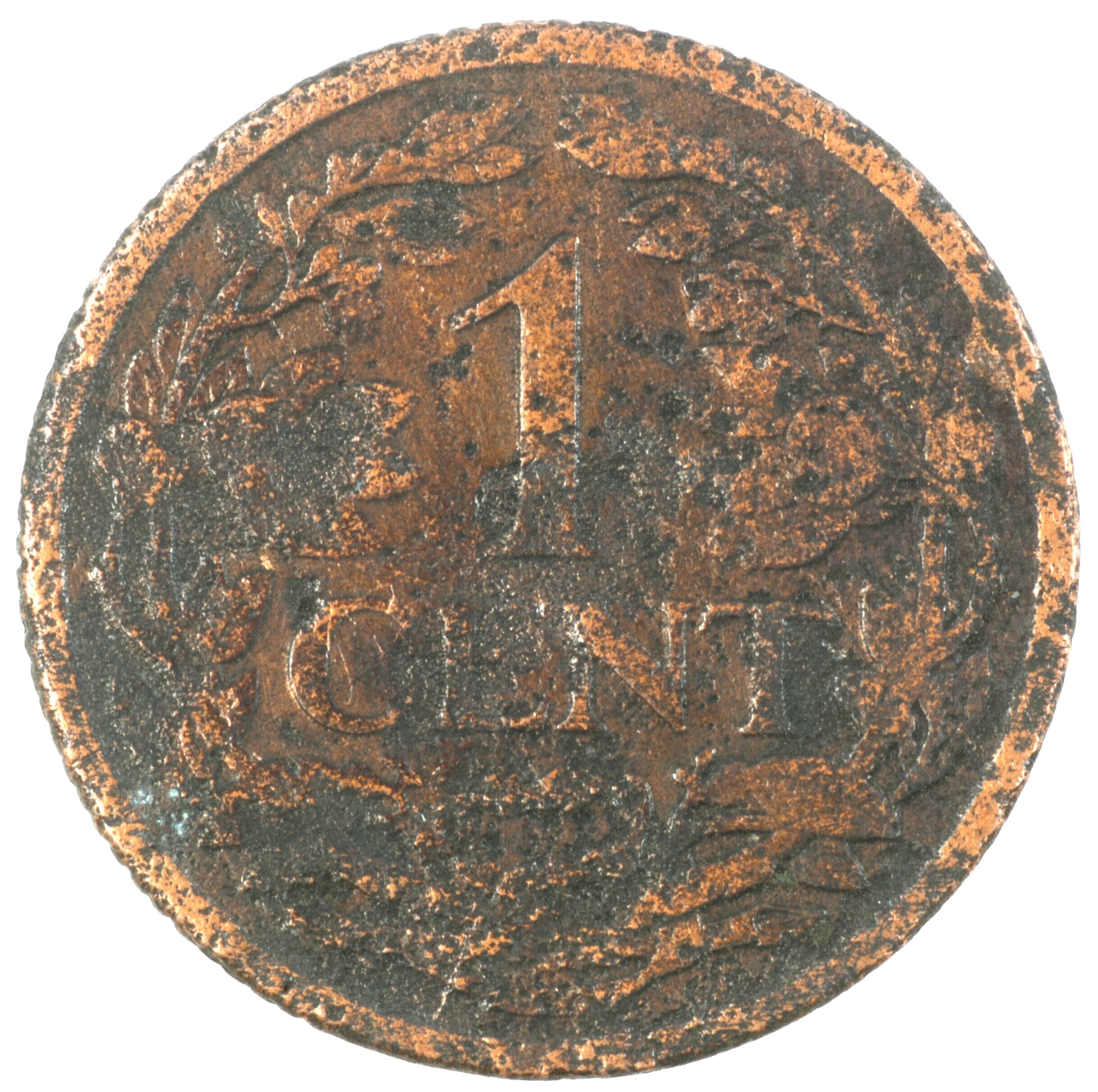 Cent; Nederland Koninkrijk (1813-heden); Wilhelmina (1890-1948); vz.: klimmende leeuw naar links met zwaard en pijlenbundel op een veld van azuur met zeventien blokken binnen parelcirkel, met omschrift (zeepaardje) KONINGRIJK DER NEDERLANDEN (mercuriusstaf) 1914; kz.: binnen een krans van twee samengebonden oranjetakken in twee regels: 1 / CENT; muntplaats: Utrecht; 2.39 gram; referentie: Schulman 977