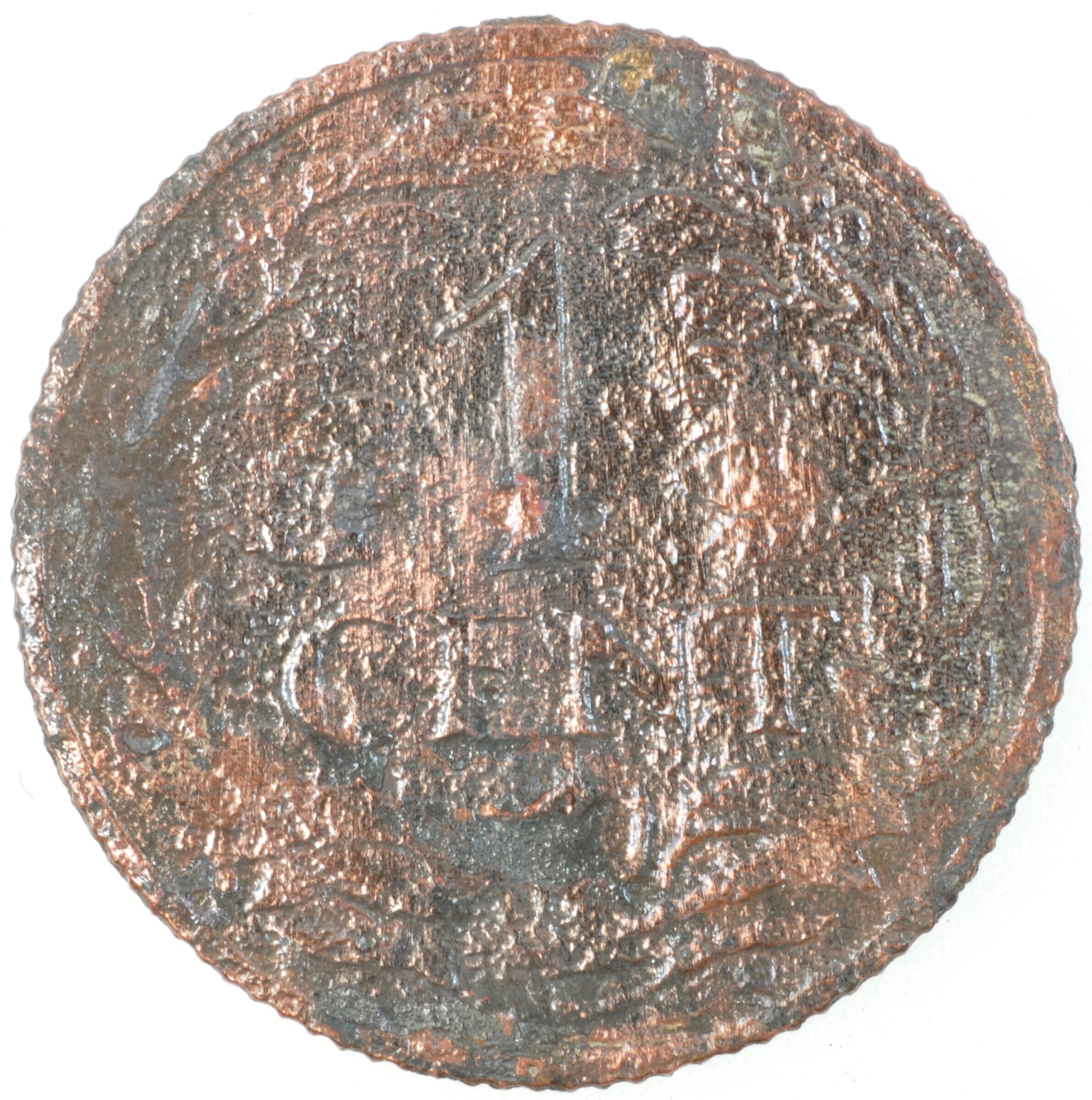 Cent; Nederland Koninkrijk (1813-heden); Wilhelmina (1890-1948); vz.: klimmende leeuw naar links met zwaard en pijlenbundel op een veld van azuur met zeventien blokken binnen parelcirkel, met omschrift (zeepaardje) KONINGR[IJ]K DER NEDERLA[N]DEN (mercuriusstaf) 1915; kz.: binnen een krans van twee samengebonden oranjetakken in twee regels: 1 / CENT; muntplaats: Utrecht; 1.97 gram; referentie: Schulman 978