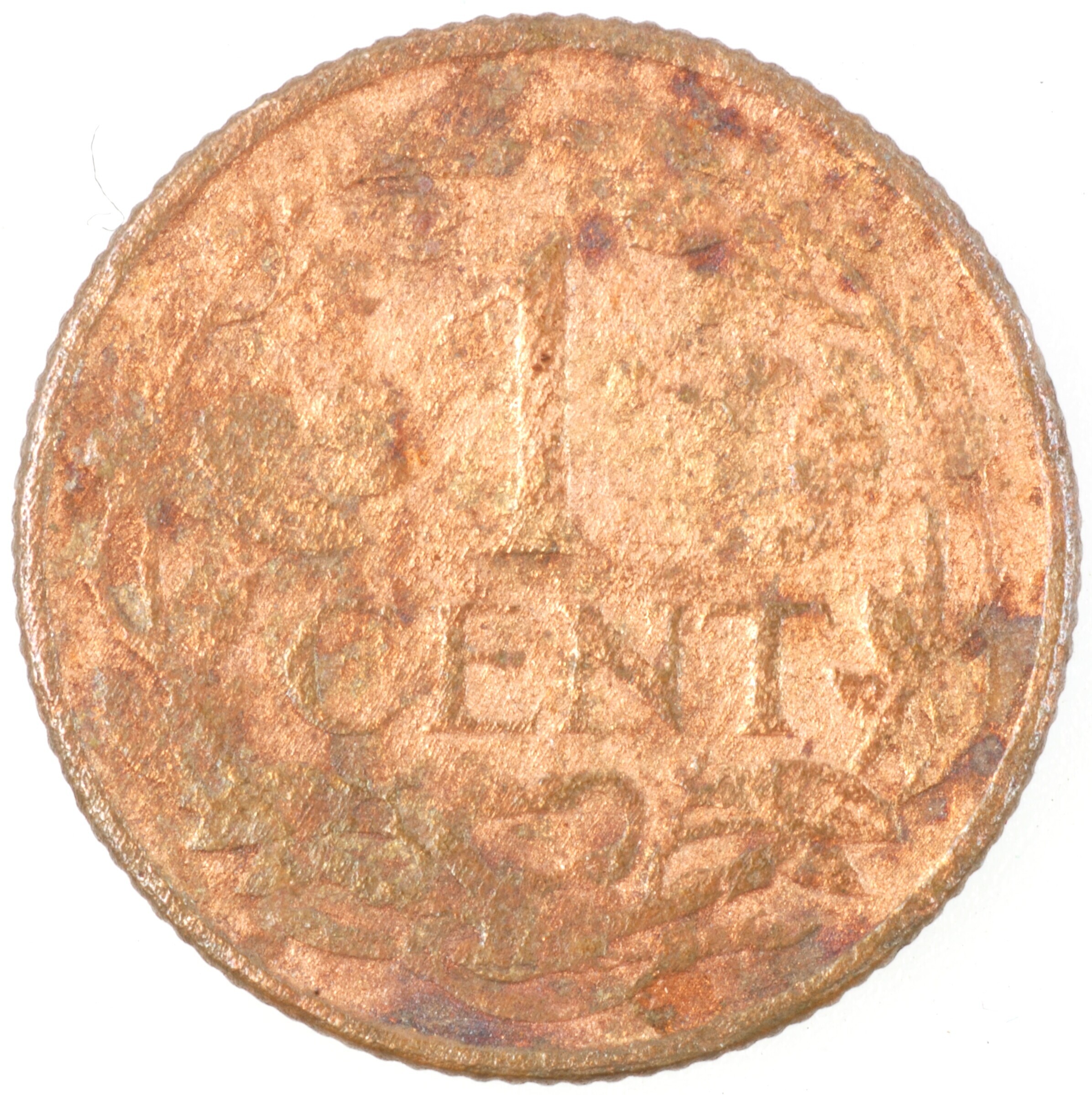 Cent; Nederland Koninkrijk (1813-heden); Wilhelmina (1890-1948); vz.: klimmende leeuw naar links met zwaard en pijlenbundel op een veld van azuur met zeventien blokken binnen parelcirkel, met omschrift (zeepaardje) KONINGRIJK DER NEDERLANDEN (mercuriusstaf) 1917; kz.: binnen een krans van twee samengebonden oranjetakken in twee regels: 1 / CENT; muntplaats: Utrecht; 2.08 gram; referentie: Schulman 980
