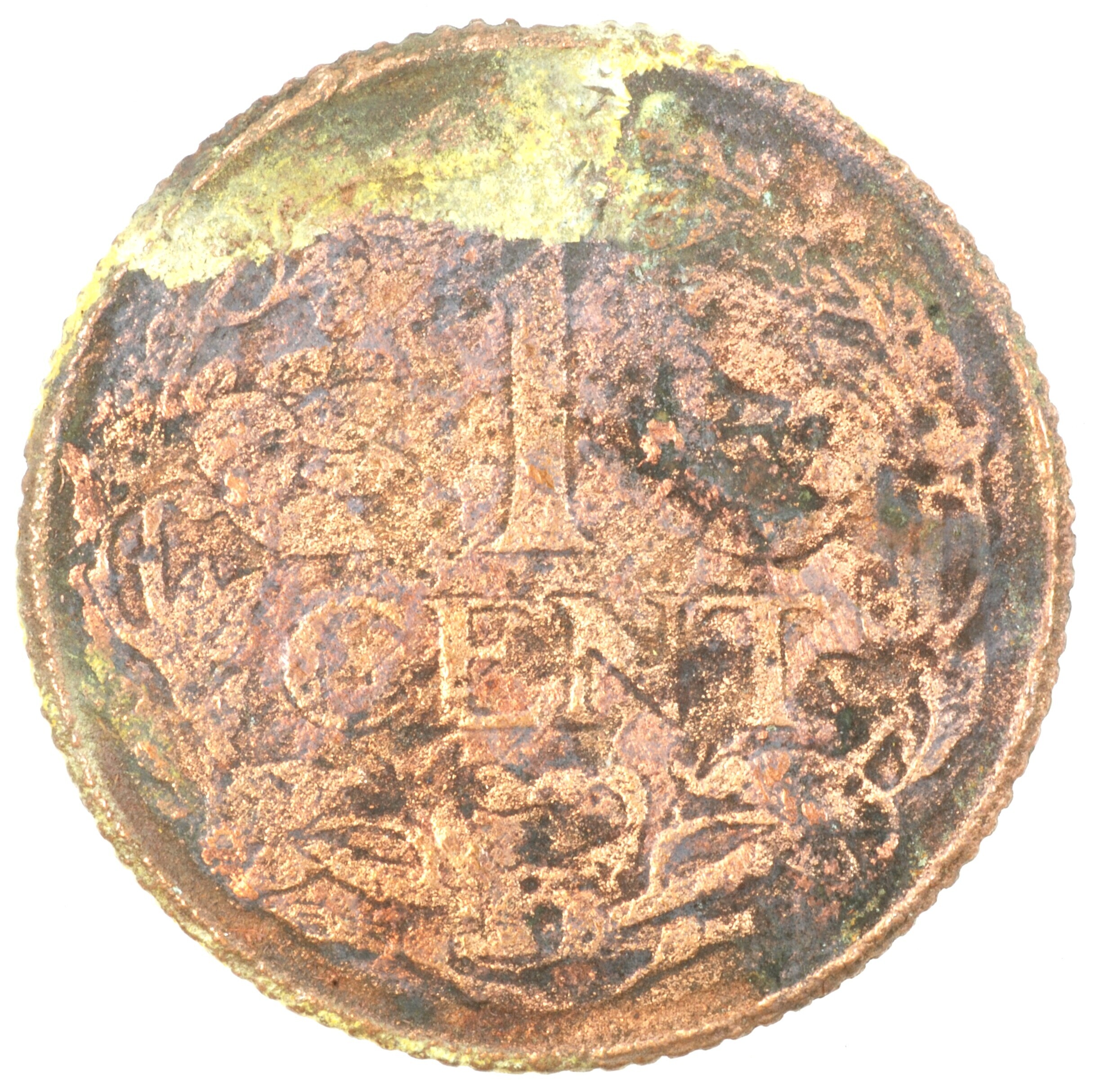 Cent; Nederland Koninkrijk (1813-heden); Wilhelmina (1890-1948); vz.: klimmende leeuw naar links met zwaard en pijlenbundel op een veld van azuur met zeventien blokken binnen parelcirkel, met omschrift (zeepaardje) KONINGRIJK DER NEDERLANDEN (mercuriusstaf) 1917; kz.: binnen een krans van twee samengebonden oranjetakken in twee regels: 1 / CENT; muntplaats: Utrecht; 2.10 gram; referentie: Schulman 980