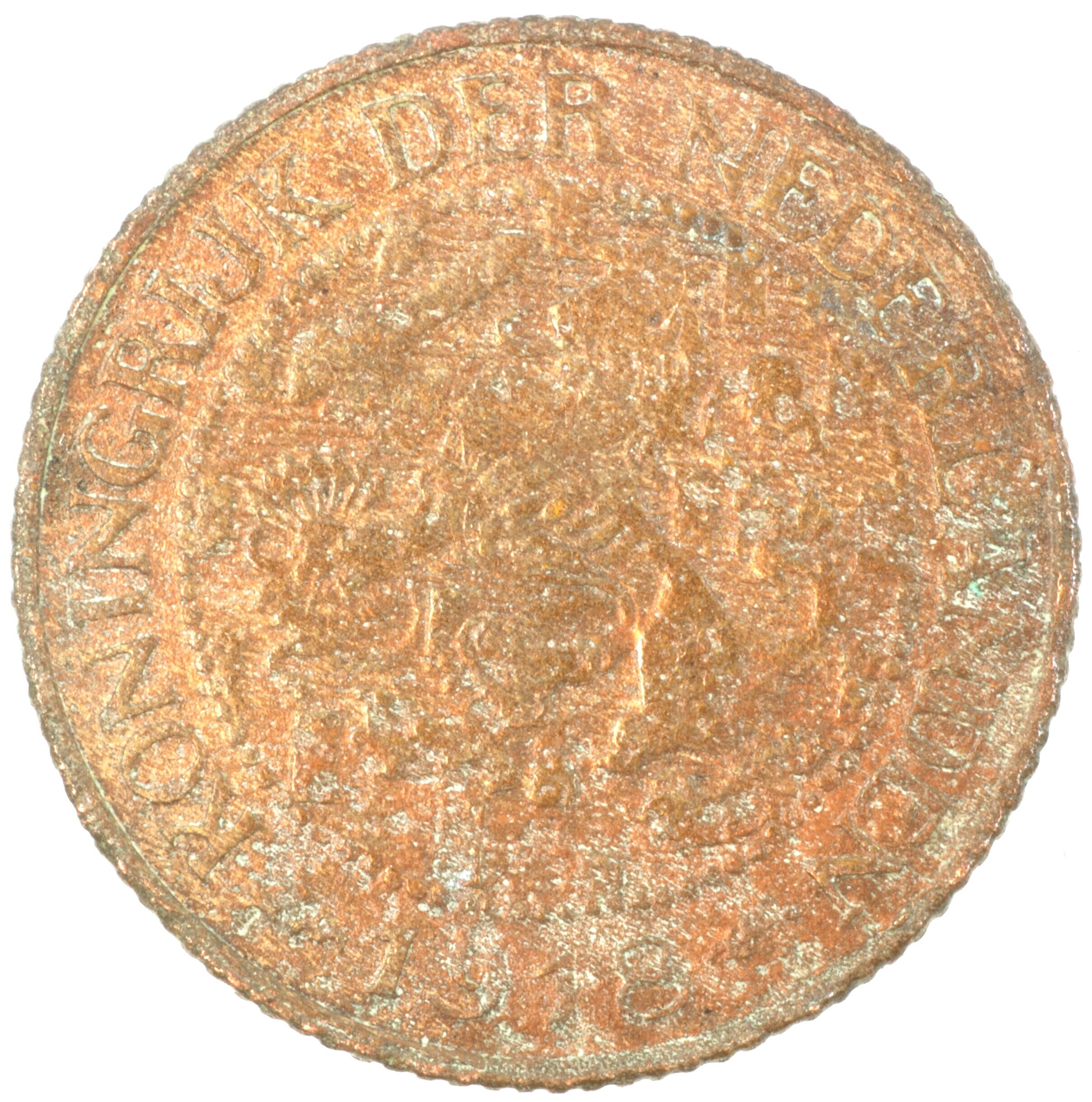 Cent; Nederland Koninkrijk (1813-heden); Wilhelmina (1890-1948); vz.: klimmende leeuw naar links met zwaard en pijlenbundel op een veld van azuur met zeventien blokken binnen parelcirkel, met omschrift (zeepaardje) KONINGRIJK DER NEDERLANDEN (mercuriusstaf) 1918; kz.: binnen een krans van twee samengebonden oranjetakken in twee regels: 1 / CENT; muntplaats: Utrecht; 2.37 gram; referentie: Schulman 981