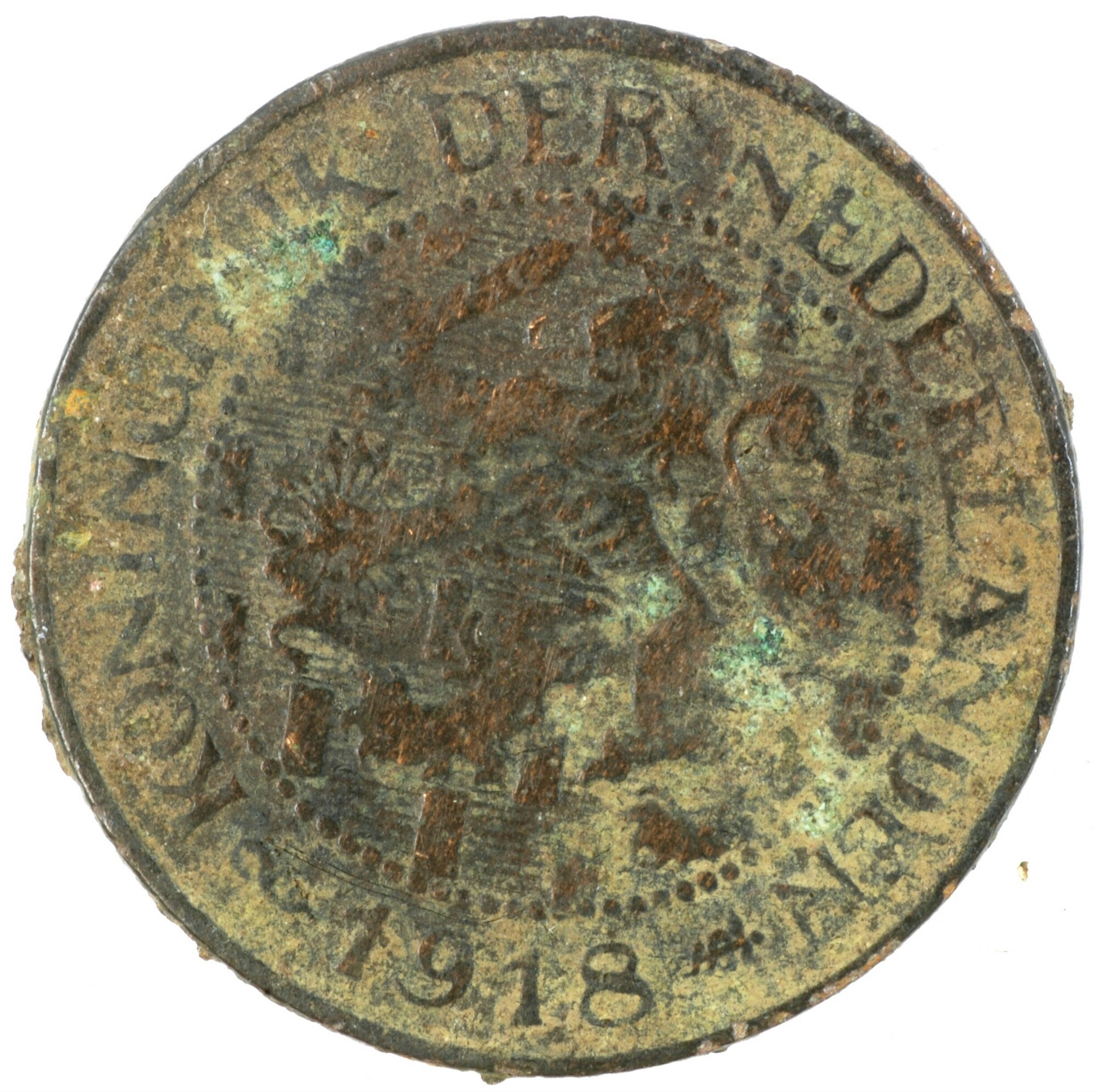 Cent; Nederland Koninkrijk (1813-heden); Wilhelmina (1890-1948); vz.: klimmende leeuw naar links met zwaard en pijlenbundel op een veld van azuur met zeventien blokken binnen parelcirkel, met omschrift (zeepaardje) KONINGRIJK DER NEDERLANDEN (mercuriusstaf) 1918; kz.: binnen een krans van twee samengebonden oranjetakken in twee regels: 1 / CENT; muntplaats: Utrecht; 2.39 gram; referentie: Schulman 981