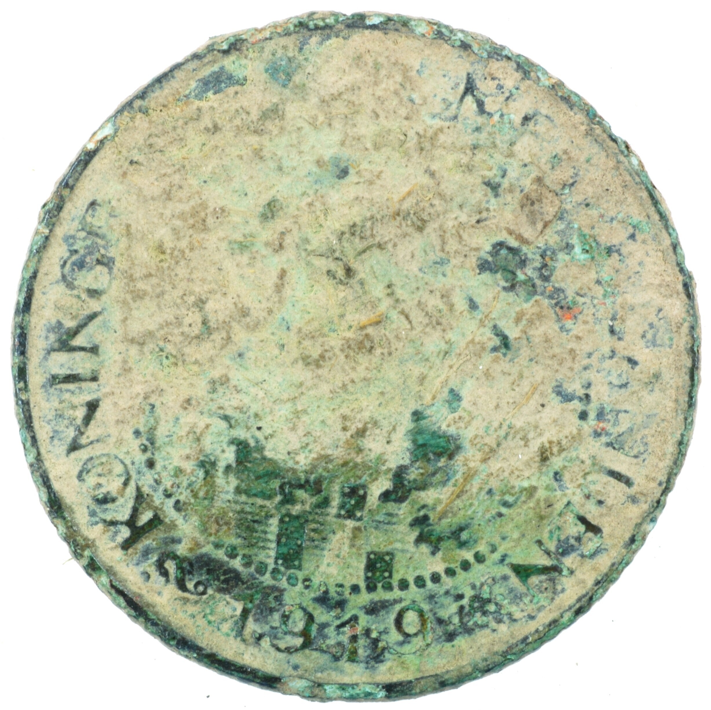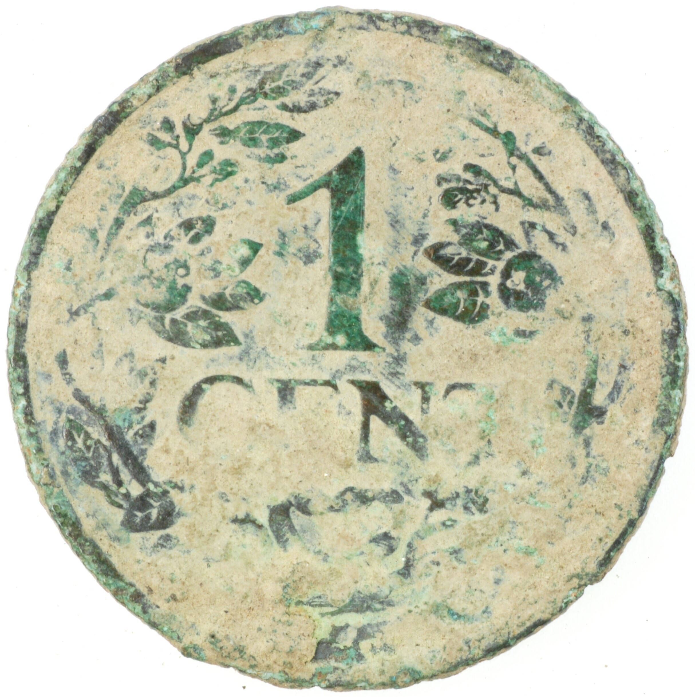 Cent; Nederland Koninkrijk (1813-heden); Wilhelmina (1890-1948); vz.: klimmende leeuw naar links met zwaard en pijlenbundel op een veld van azuur met zeventien blokken binnen parelcirkel, met omschrift (zeepaardje) KONINGR[IJK DER] NE[DERL]ANDEN (mercuriusstaf) 1918; kz.: binnen een krans van twee samengebonden oranjetakken in twee regels: 1 / CENT; muntplaats: Utrecht; 2.16 gram; referentie: Schulman 981