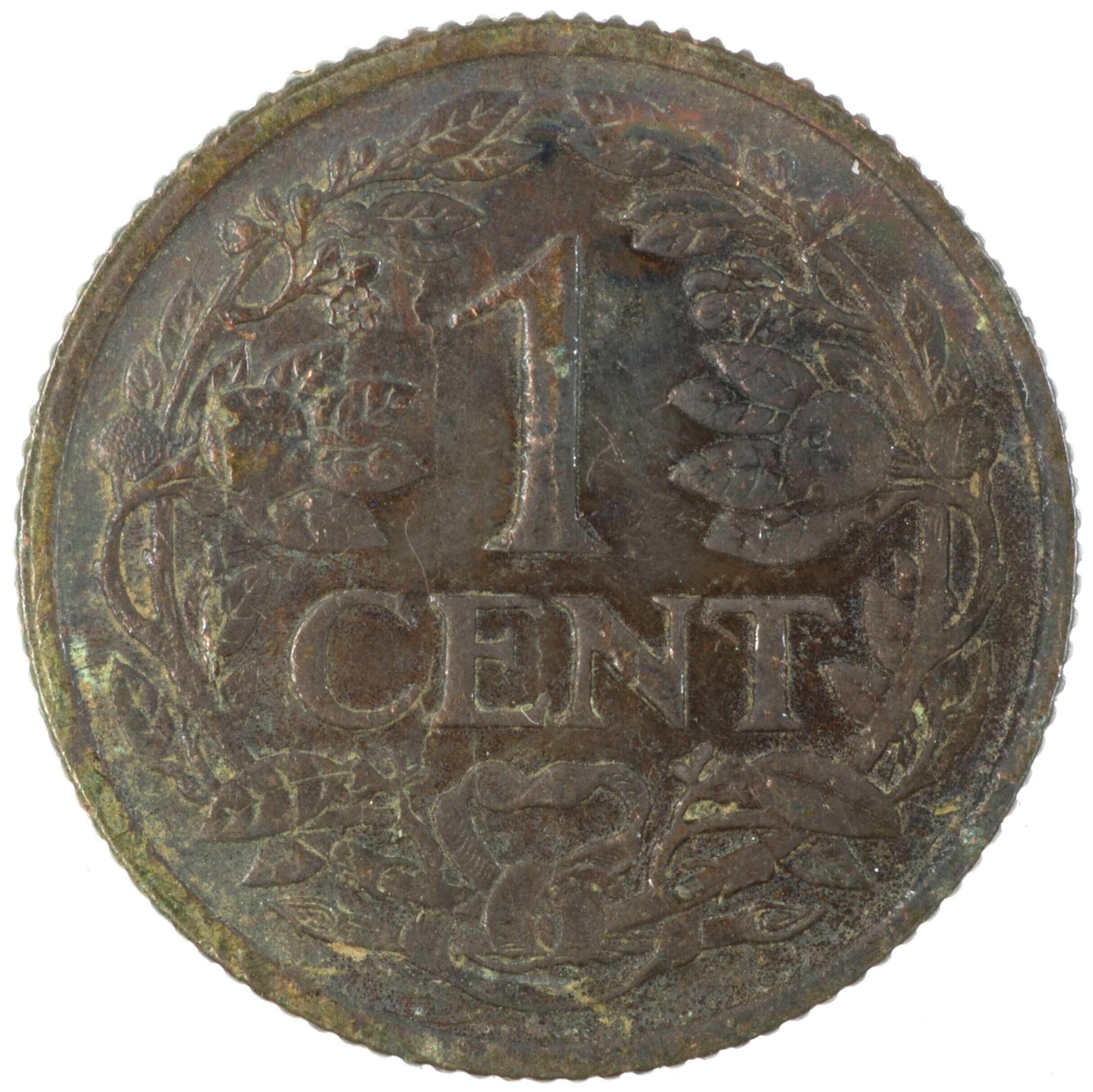 Cent; Nederland Koninkrijk (1813-heden); Wilhelmina (1890-1948); vz.: klimmende leeuw naar links met zwaard en pijlenbundel op een veld van azuur met zeventien blokken binnen parelcirkel, met omschrift (zeepaardje) KONINGRIJK DER NEDERLANDEN (mercuriusstaf) 1920; kz.: binnen een krans van twee samengebonden oranjetakken in twee regels: 1 / CENT; muntplaats: Utrecht; 2.42 gram; referentie: Schulman 983