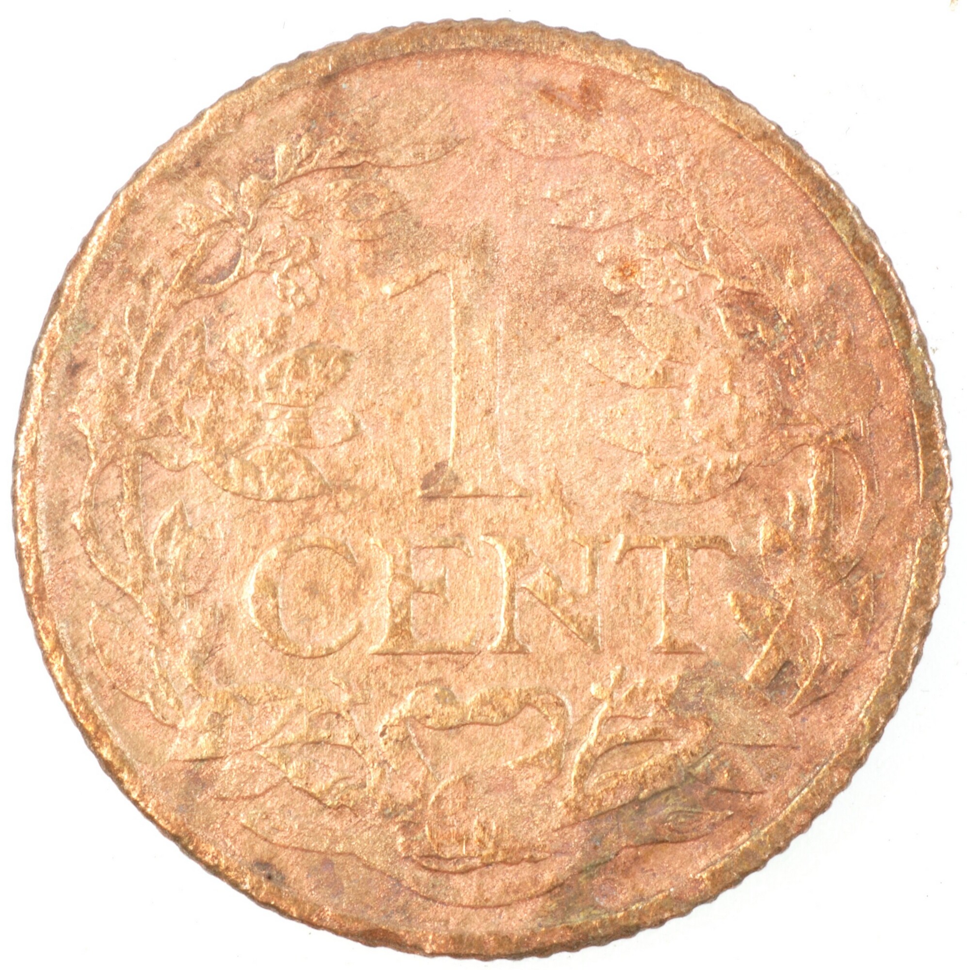 Cent; Nederland Koninkrijk (1813-heden); Wilhelmina (1890-1948); vz.: klimmende leeuw naar links met zwaard en pijlenbundel op een veld van azuur met zeventien blokken binnen parelcirkel, met omschrift (zeepaardje) KONINGRIJK DER NEDERLANDEN (mercuriusstaf) 1920; kz.: binnen een krans van twee samengebonden oranjetakken in twee regels: 1 / CENT; muntplaats: Utrecht; 2.25 gram; referentie: Schulman 983