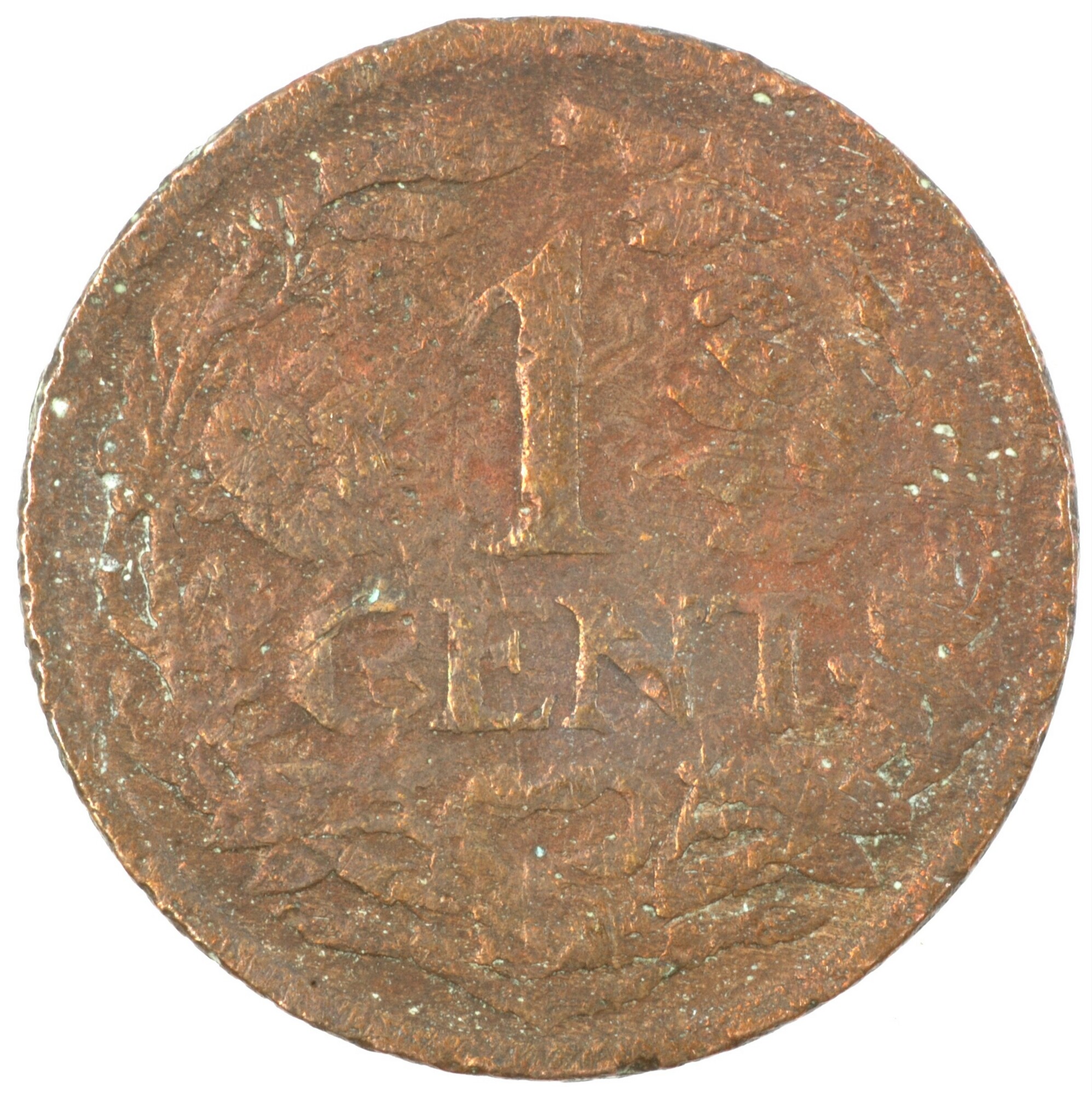 Cent; Nederland Koninkrijk (1813-heden); Wilhelmina (1890-1948); vz.: klimmende leeuw naar links met zwaard en pijlenbundel op een veld van azuur met zeventien blokken binnen parelcirkel, met omschrift (zeepaardje) KONINGRIJK DER NEDERLANDEN (mercuriusstaf) 1920; kz.: binnen een krans van twee samengebonden oranjetakken in twee regels: 1 / CENT; muntplaats: Utrecht; 2.30 gram; referentie: Schulman 983