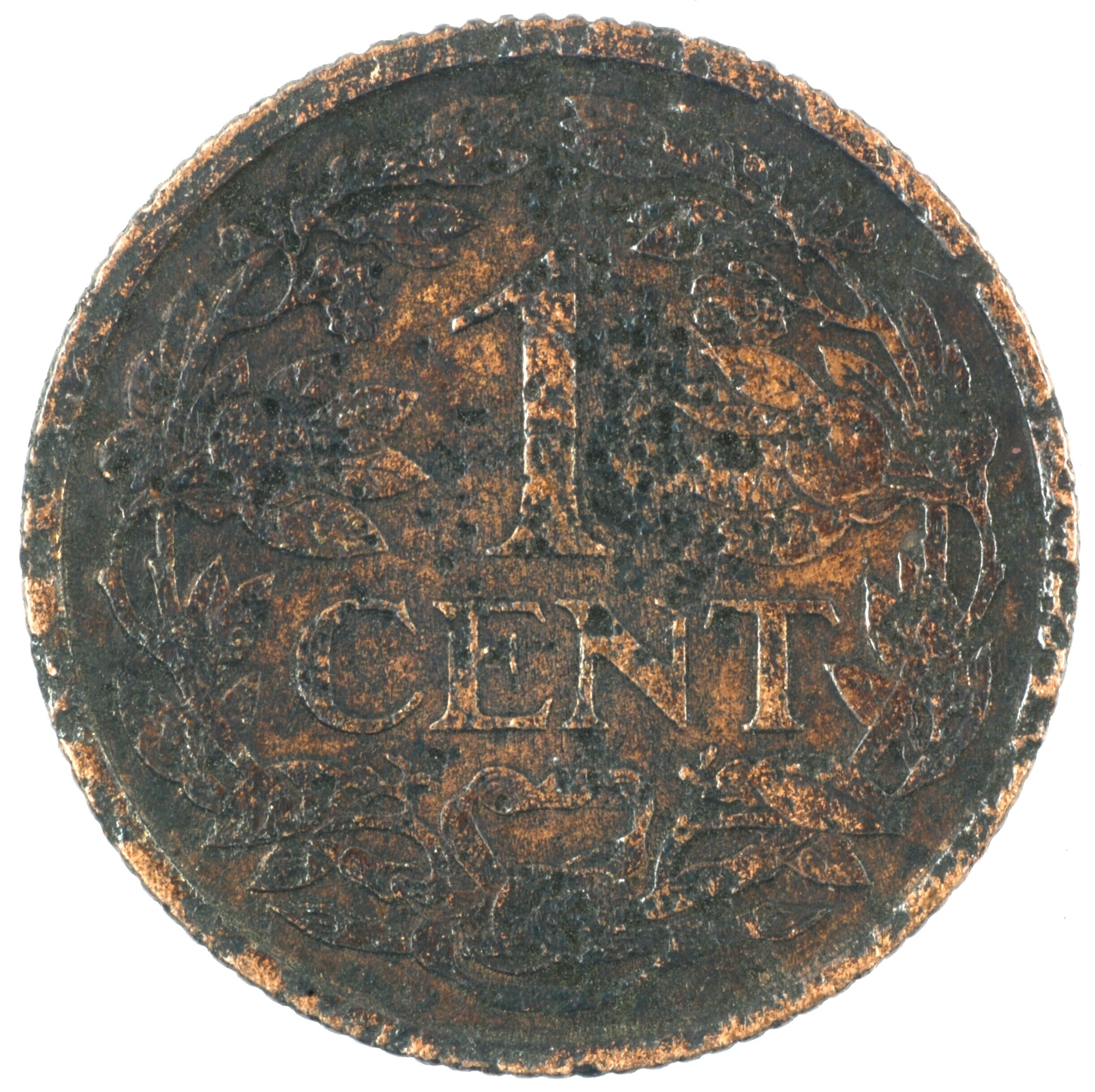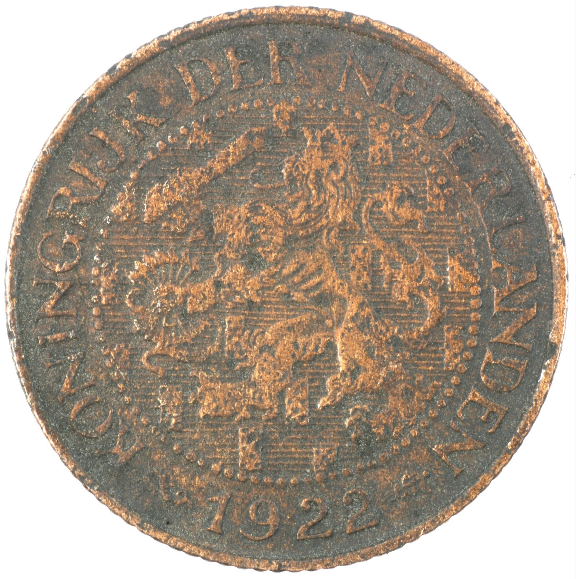 Cent; Nederland Koninkrijk (1813-heden); Wilhelmina (1890-1948); vz.: klimmende leeuw naar links met zwaard en pijlenbundel op een veld van azuur met zeventien blokken binnen parelcirkel, met omschrift (zeepaardje) KONINGRIJK DER NEDERLANDEN (mercuriusstaf) 1922; kz.: binnen een krans van twee samengebonden oranjetakken in twee regels: 1 / CENT; muntplaats: Utrecht; 2.35 gram; referentie: Schulman 985