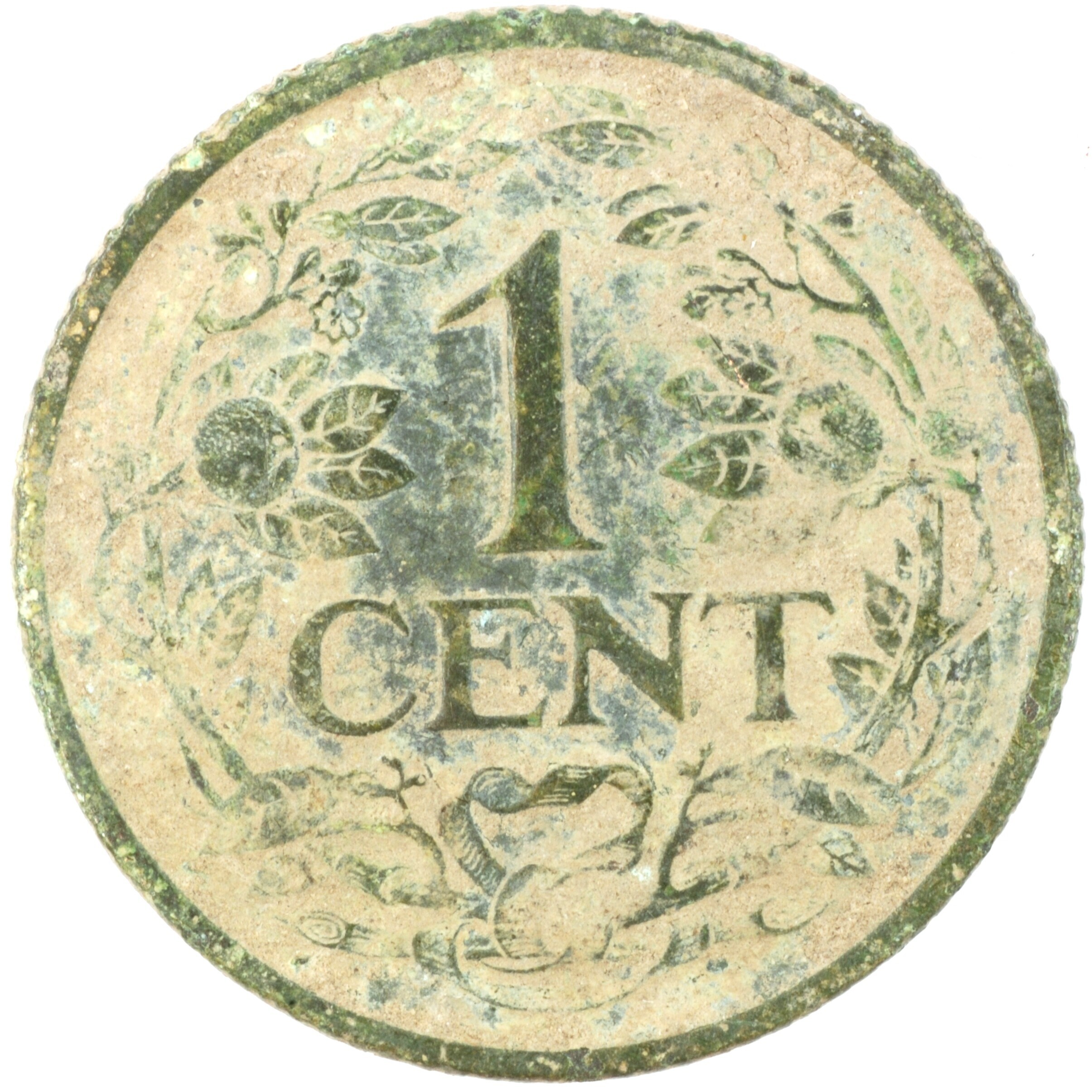 Cent; Nederland Koninkrijk (1813-heden); Wilhelmina (1890-1948); vz.: klimmende leeuw naar links met zwaard en pijlenbundel op een veld van azuur met zeventien blokken binnen parelcirkel, met omschrift (zeepaardje) KONINGRIJK DER NEDERLANDEN (mercuriusstaf) 1922; kz.: binnen een krans van twee samengebonden oranjetakken in twee regels: 1 / CENT; muntplaats: Utrecht; 2.38 gram; referentie: Schulman 985