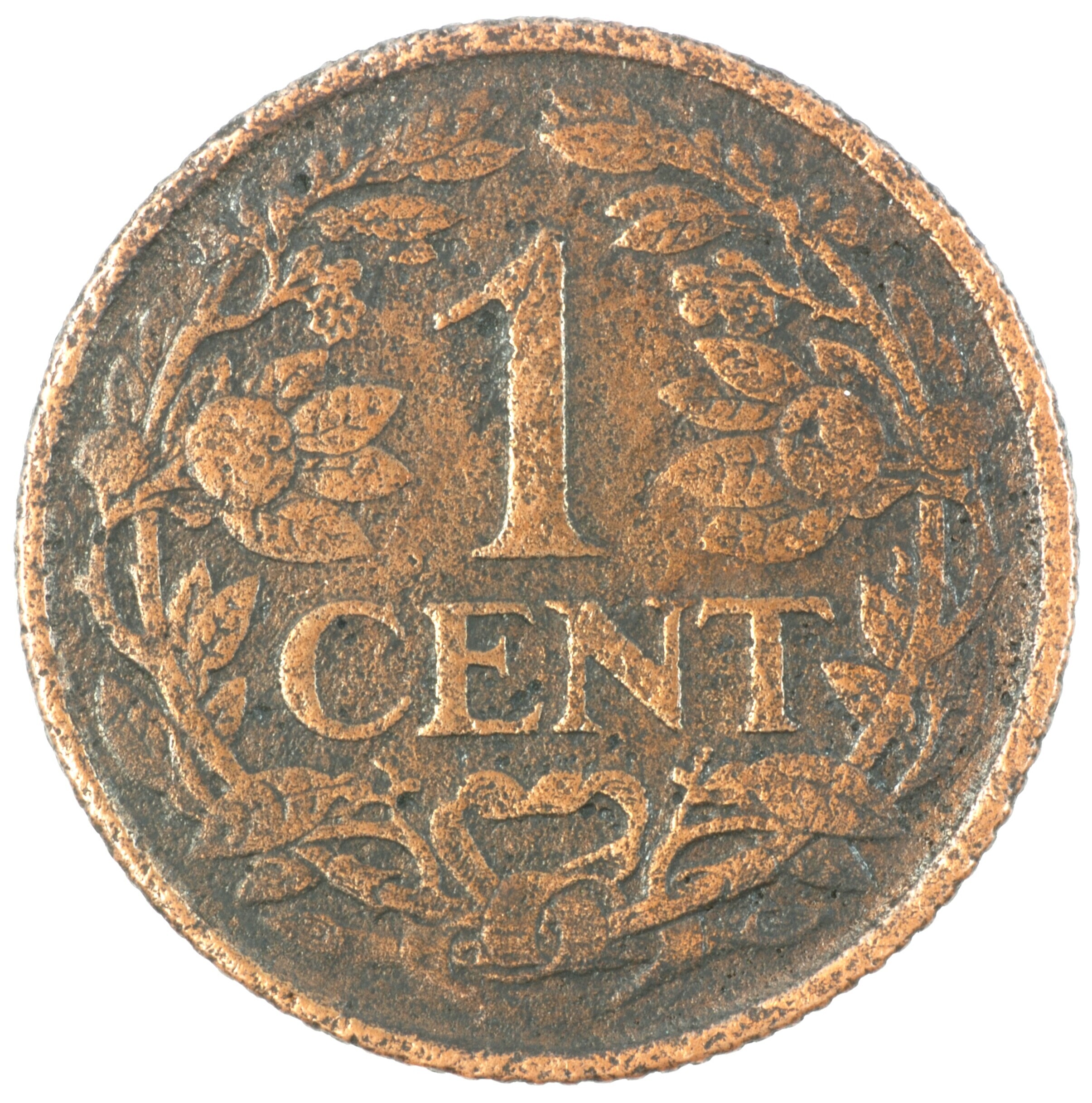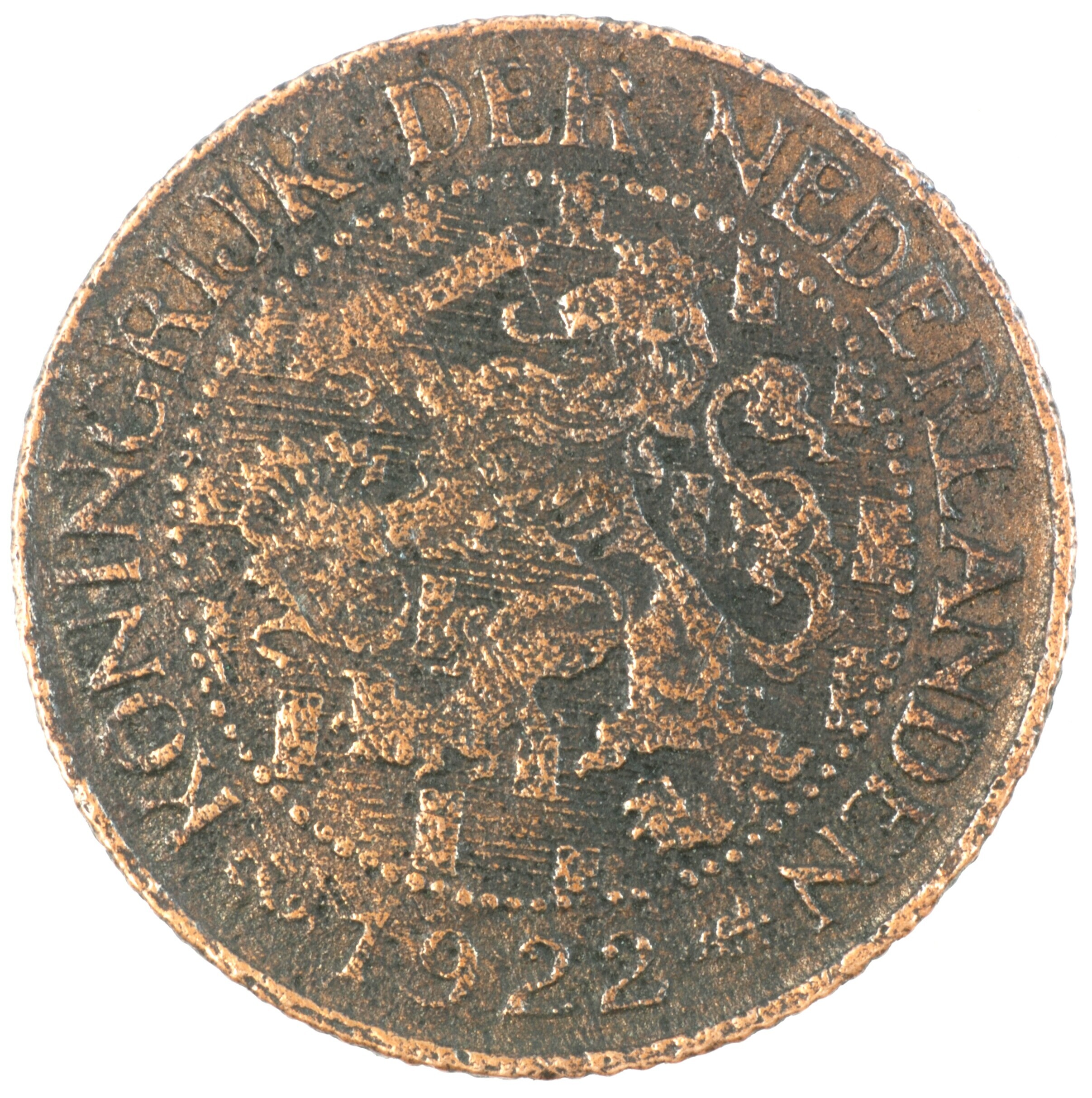 Cent; Nederland Koninkrijk (1813-heden); Wilhelmina (1890-1948); vz.: klimmende leeuw naar links met zwaard en pijlenbundel op een veld van azuur met zeventien blokken binnen parelcirkel, met omschrift (zeepaardje) KONINGRIJK DER NEDERLANDEN (mercuriusstaf) 1922; kz.: binnen een krans van twee samengebonden oranjetakken in twee regels: 1 / CENT; muntplaats: Utrecht; 2.25 gram; referentie: Schulman 985