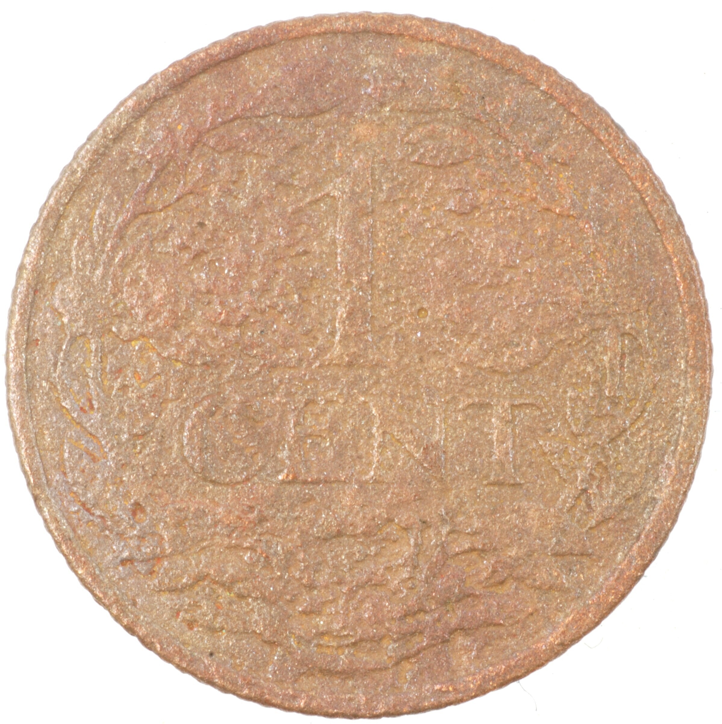 Cent; Nederland Koninkrijk (1813-heden); Wilhelmina (1890-1948); vz.: klimmende leeuw naar links met zwaard en pijlenbundel op een veld van azuur met zeventien blokken binnen parelcirkel, met omschrift (zeepaardje) KONINGRIJK DER NEDERLANDEN (mercuriusstaf) 1922; kz.: binnen een krans van twee samengebonden oranjetakken in twee regels: 1 / CENT; muntplaats: Utrecht; 2.11 gram; referentie: Schulman 985