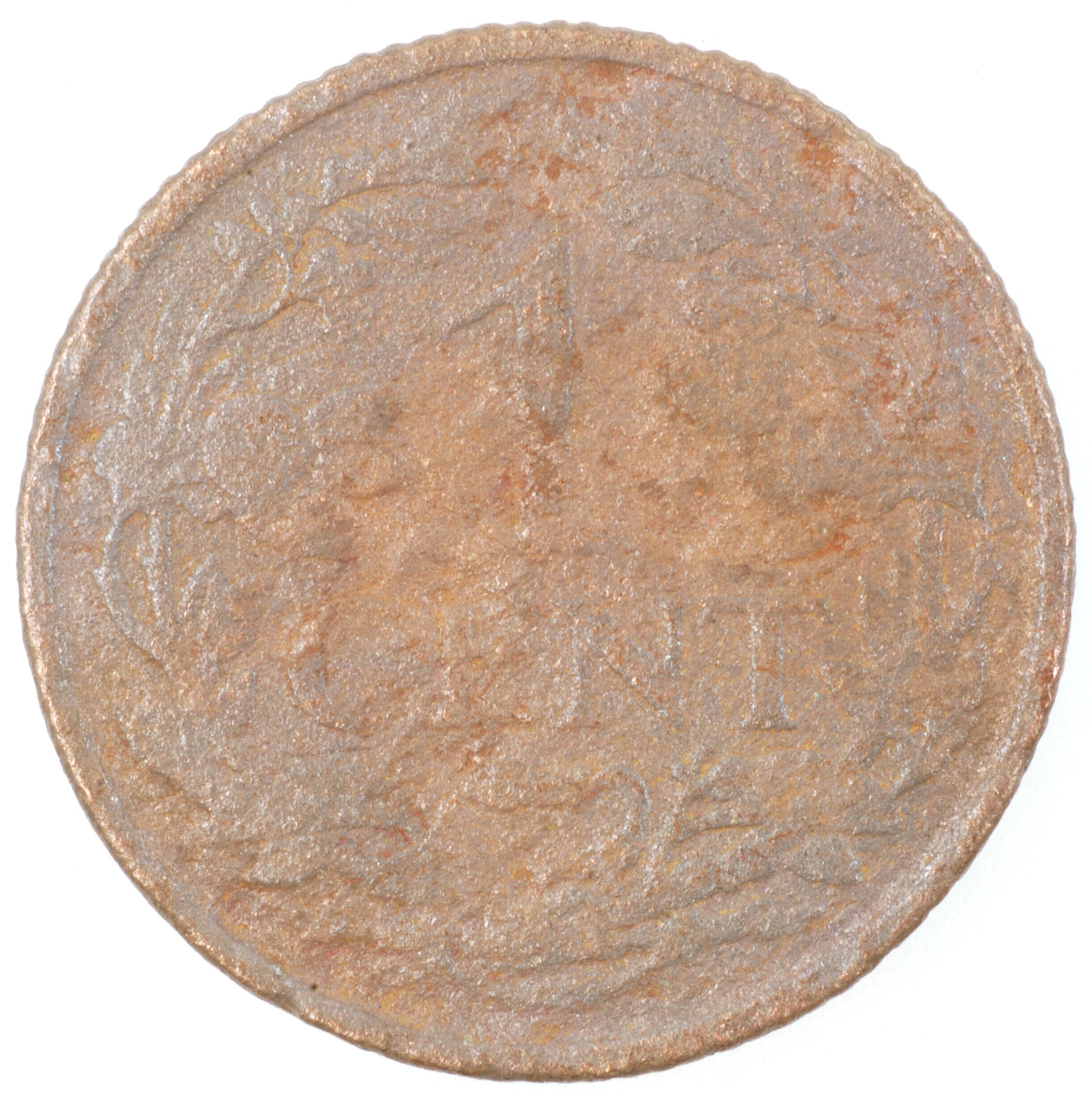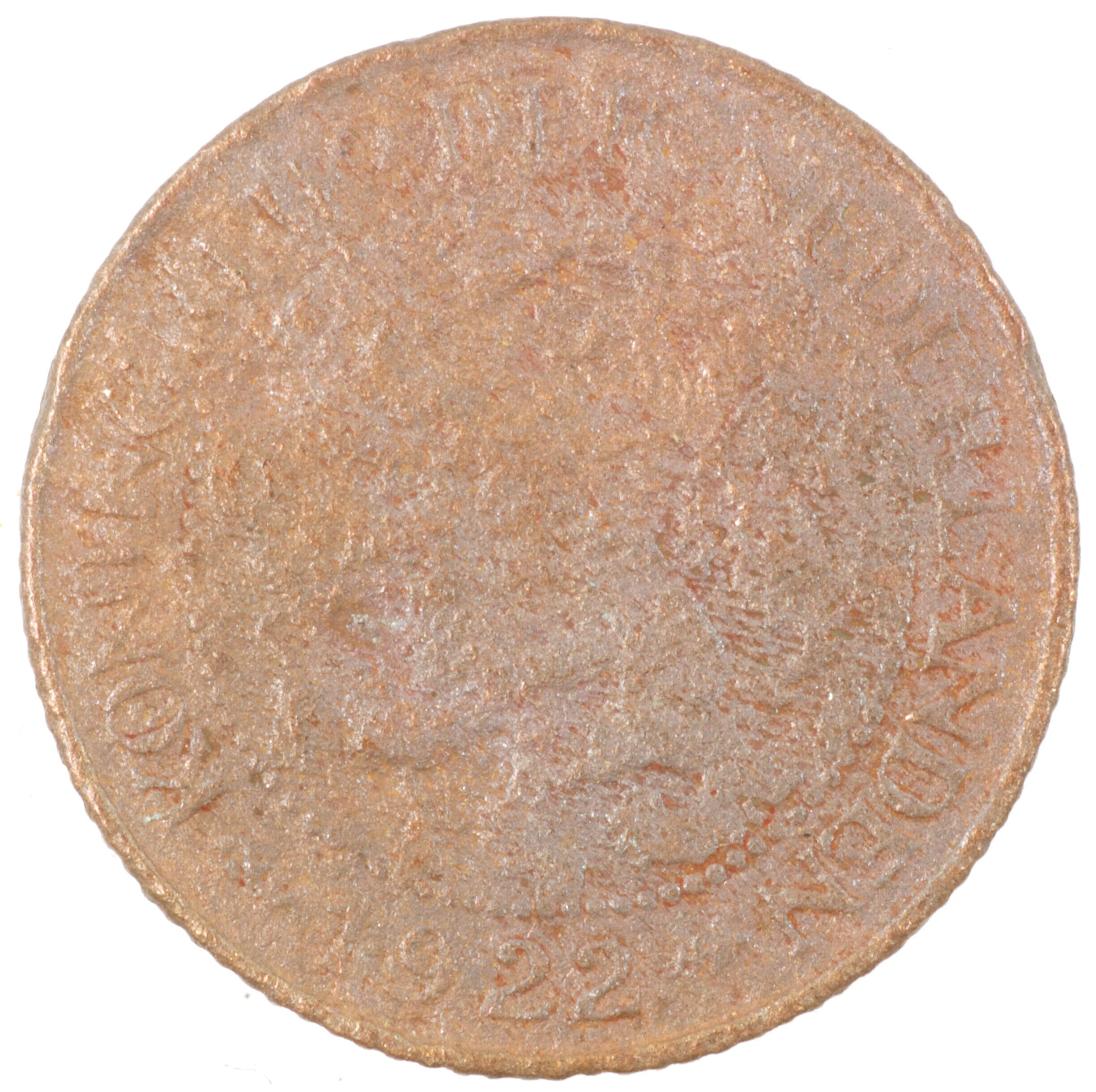 Cent; Nederland Koninkrijk (1813-heden); Wilhelmina (1890-1948); vz.: klimmende leeuw naar links met zwaard en pijlenbundel op een veld van azuur met zeventien blokken binnen parelcirkel, met omschrift (zeepaardje) KONINGRIJK DER NEDERLANDEN (mercuriusstaf) 1922; kz.: binnen een krans van twee samengebonden oranjetakken in twee regels: 1 / CENT; muntplaats: Utrecht; 2.13 gram; referentie: Schulman 985