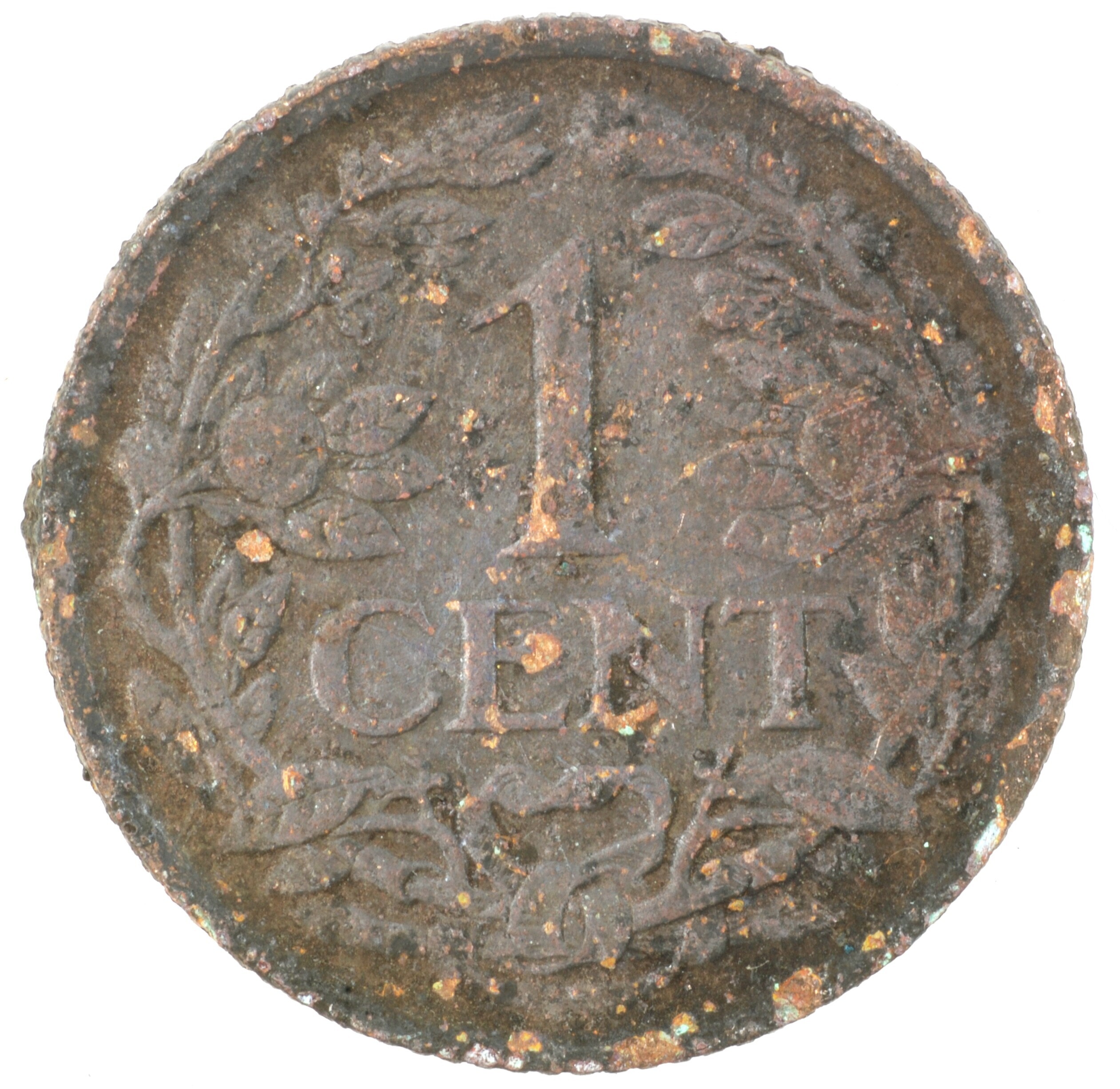 Cent; Nederland Koninkrijk (1813-heden); Wilhelmina (1890-1948); vz.: klimmende leeuw naar links met zwaard en pijlenbundel op een veld van azuur met zeventien blokken binnen parelcirkel, met omschrift (zeepaardje) KONINGRIJK DER NEDERLANDEN (mercuriusstaf) 1922; kz.: binnen een krans van twee samengebonden oranjetakken in twee regels: 1 / CENT; muntplaats: Utrecht; 2.52 gram; referentie: Schulman 985