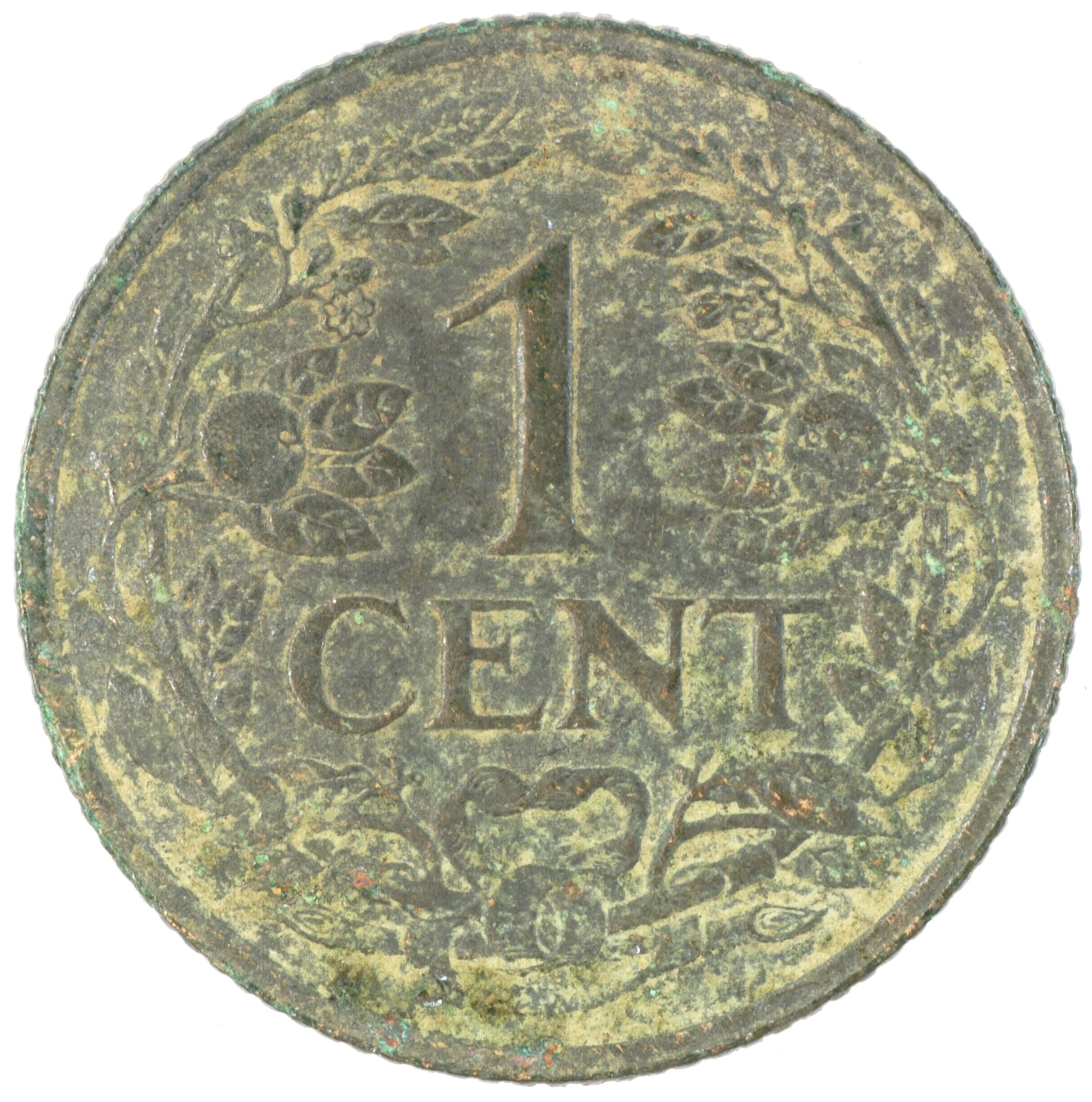 Cent; Nederland Koninkrijk (1813-heden); Wilhelmina (1890-1948); vz.: klimmende leeuw naar links met zwaard en pijlenbundel op een veld van azuur met zeventien blokken binnen parelcirkel, met omschrift (zeepaardje) KONINGRIJK DER NEDERLANDEN (mercuriusstaf) 1925; kz.: binnen een krans van twee samengebonden oranjetakken in twee regels: 1 / CENT; muntplaats: Utrecht; 2.38 gram; referentie: Schulman 987