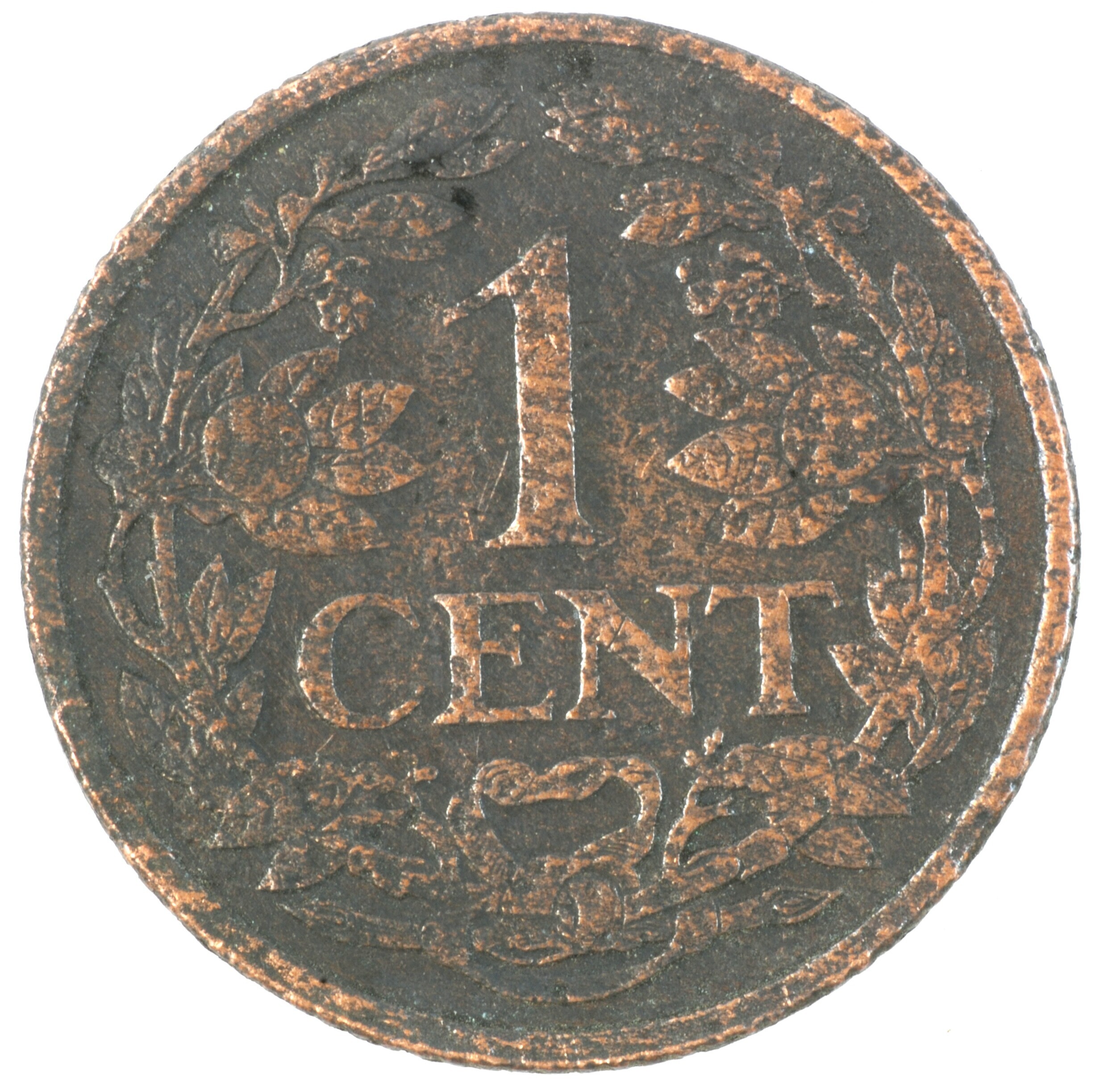 Cent; Nederland Koninkrijk (1813-heden); Wilhelmina (1890-1948); vz.: klimmende leeuw naar links met zwaard en pijlenbundel op een veld van azuur met zeventien blokken binnen parelcirkel, met omschrift (zeepaardje) KONINGRIJK DER NEDERLANDEN (mercuriusstaf) 1925; kz.: binnen een krans van twee samengebonden oranjetakken in twee regels: 1 / CENT; muntplaats: Utrecht; 2.38 gram; referentie: Schulman 987