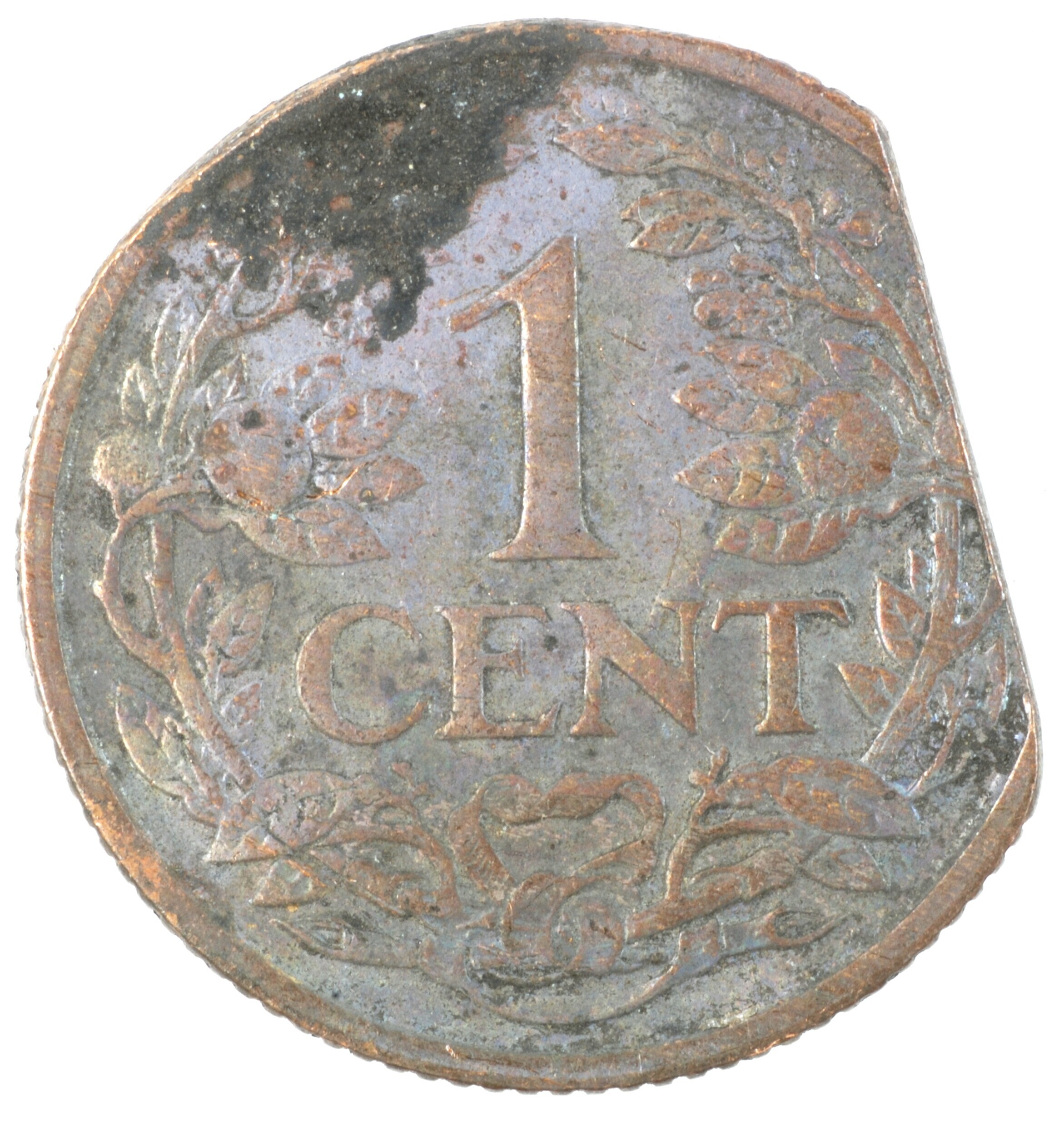 Cent; Nederland Koninkrijk (1813-heden); Wilhelmina (1890-1948); vz.: klimmende leeuw naar links met zwaard en pijlenbundel op een veld van azuur met zeventien blokken binnen parelcirkel, met omschrift (zeepaardje) KONINGRIJK DER NEDERLANDEN (mercuriusstaf) 1925; kz.: binnen een krans van twee samengebonden oranjetakken in twee regels: 1 / CENT; muntplaats: Utrecht; 2.31 gram; referentie: Schulman 987