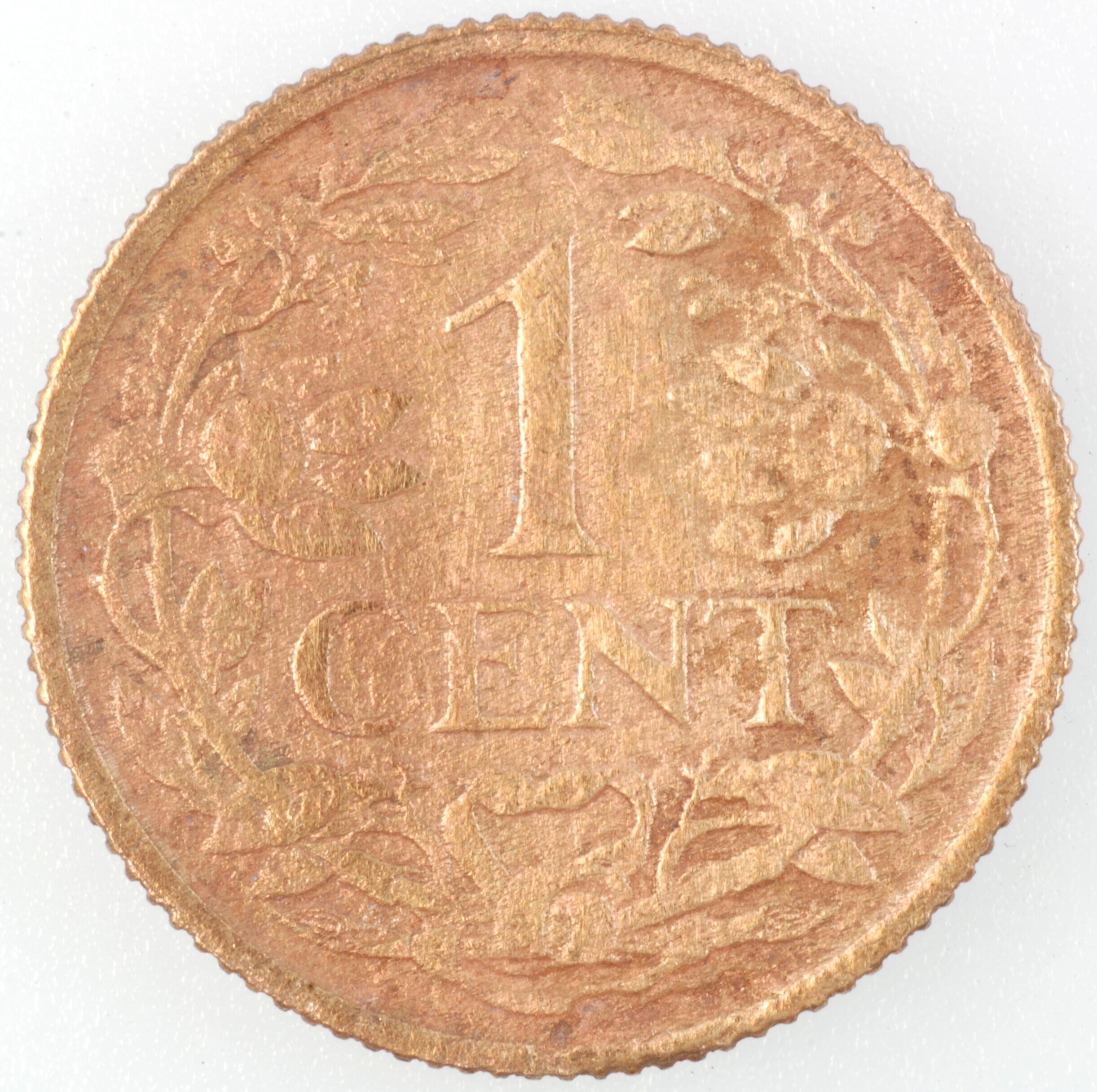 Cent; Nederland Koninkrijk (1813-heden); Wilhelmina (1890-1948); vz.: klimmende leeuw naar links met zwaard en pijlenbundel op een veld van azuur met zeventien blokken binnen parelcirkel, met omschrift (zeepaardje) KONINGRIJK DER NEDERLANDEN (mercuriusstaf) 1925; kz.: binnen een krans van twee samengebonden oranjetakken in twee regels: 1 / CENT; muntplaats: Utrecht; 2.09 gram; referentie: Schulman 987