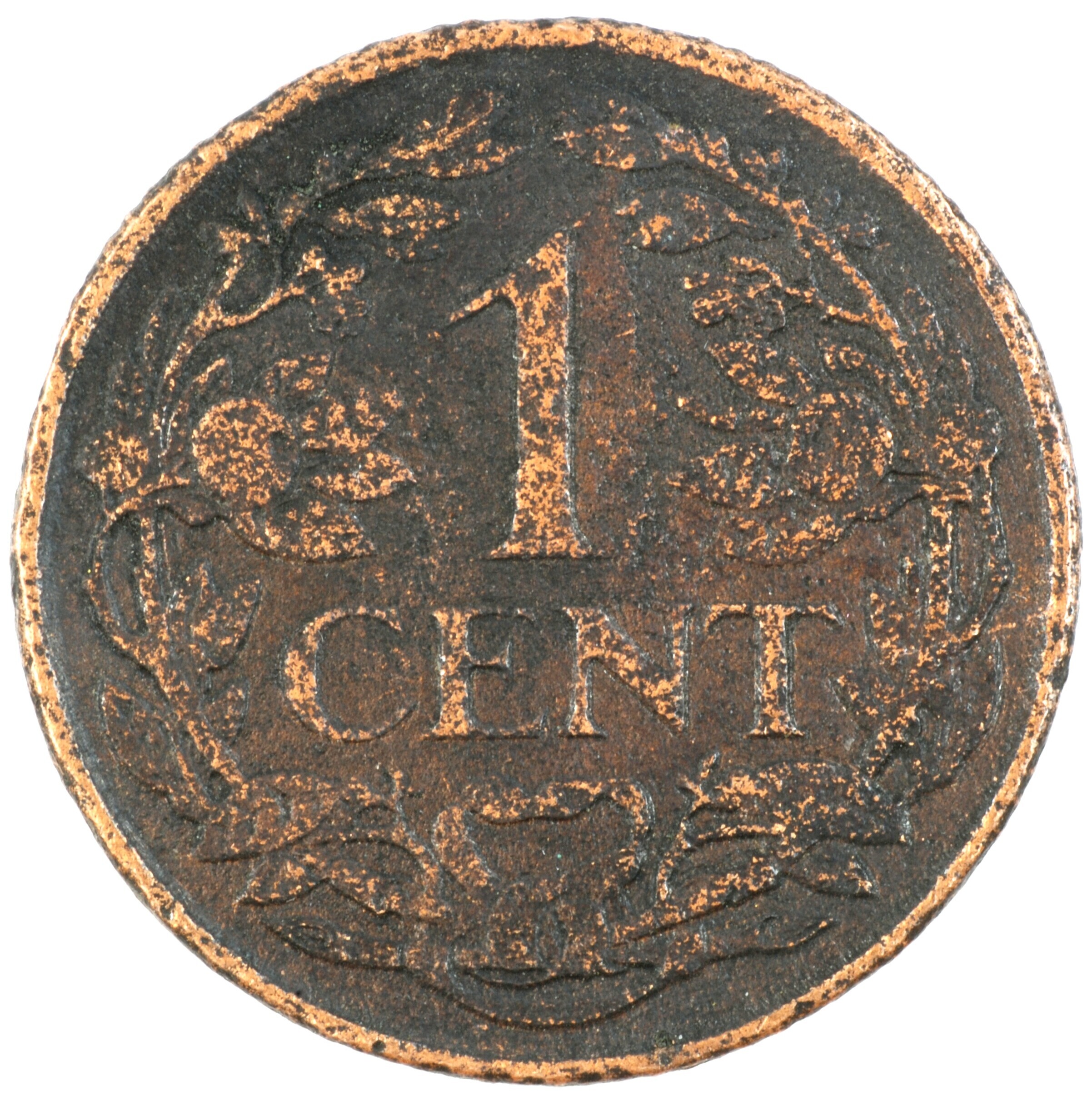 Cent; Nederland Koninkrijk (1813-heden); Wilhelmina (1890-1948); vz.: klimmende leeuw naar links met zwaard en pijlenbundel op een veld van azuur met zeventien blokken binnen parelcirkel, met omschrift (zeepaardje) KONINGRIJK DER NEDERLANDEN (mercuriusstaf) 1927; kz.: binnen een krans van twee samengebonden oranjetakken in twee regels: 1 / CENT; muntplaats: Utrecht; 2.09 gram; referentie: Schulman 989