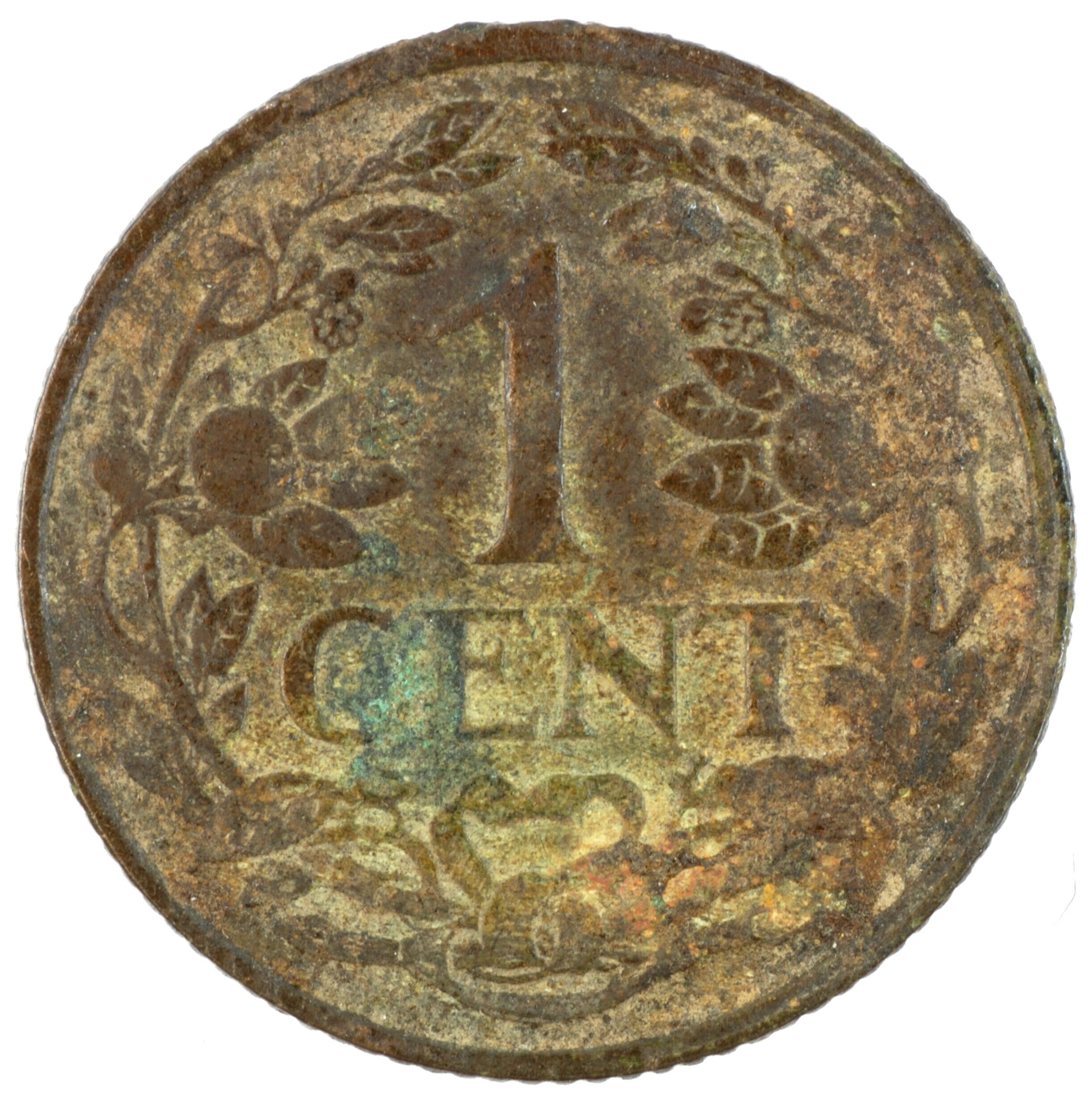 Cent; Nederland Koninkrijk (1813-heden); Wilhelmina (1890-1948); vz.: klimmende leeuw naar links met zwaard en pijlenbundel op een veld van azuur met zeventien blokken binnen parelcirkel, met omschrift (zeepaardje) KONINGRIJK DER NEDERLANDEN (mercuriusstaf) 1927; kz.: binnen een krans van twee samengebonden oranjetakken in twee regels: 1 / CENT; muntplaats: Utrecht; 2.44 gram; referentie: Schulman 989