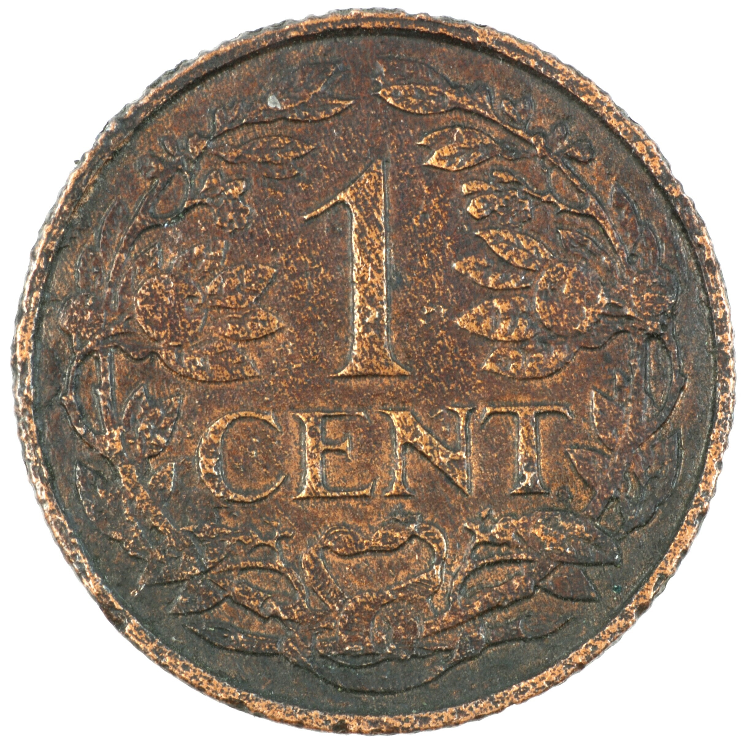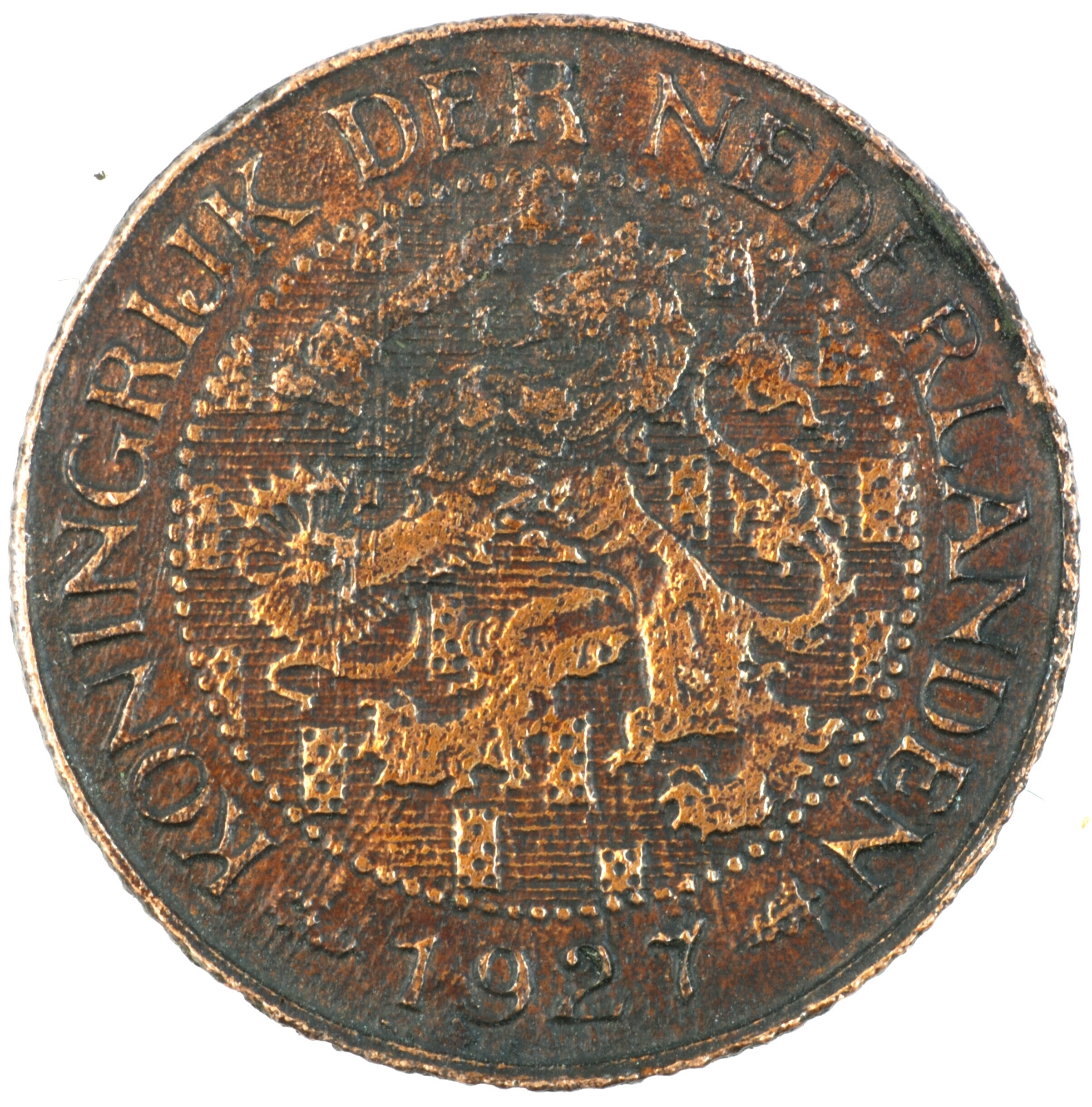 Cent; Nederland Koninkrijk (1813-heden); Wilhelmina (1890-1948); vz.: klimmende leeuw naar links met zwaard en pijlenbundel op een veld van azuur met zeventien blokken binnen parelcirkel, met omschrift (zeepaardje) KONINGRIJK DER NEDERLANDEN (mercuriusstaf) 1927; kz.: binnen een krans van twee samengebonden oranjetakken in twee regels: 1 / CENT; muntplaats: Utrecht; 2.06 gram; referentie: Schulman 989