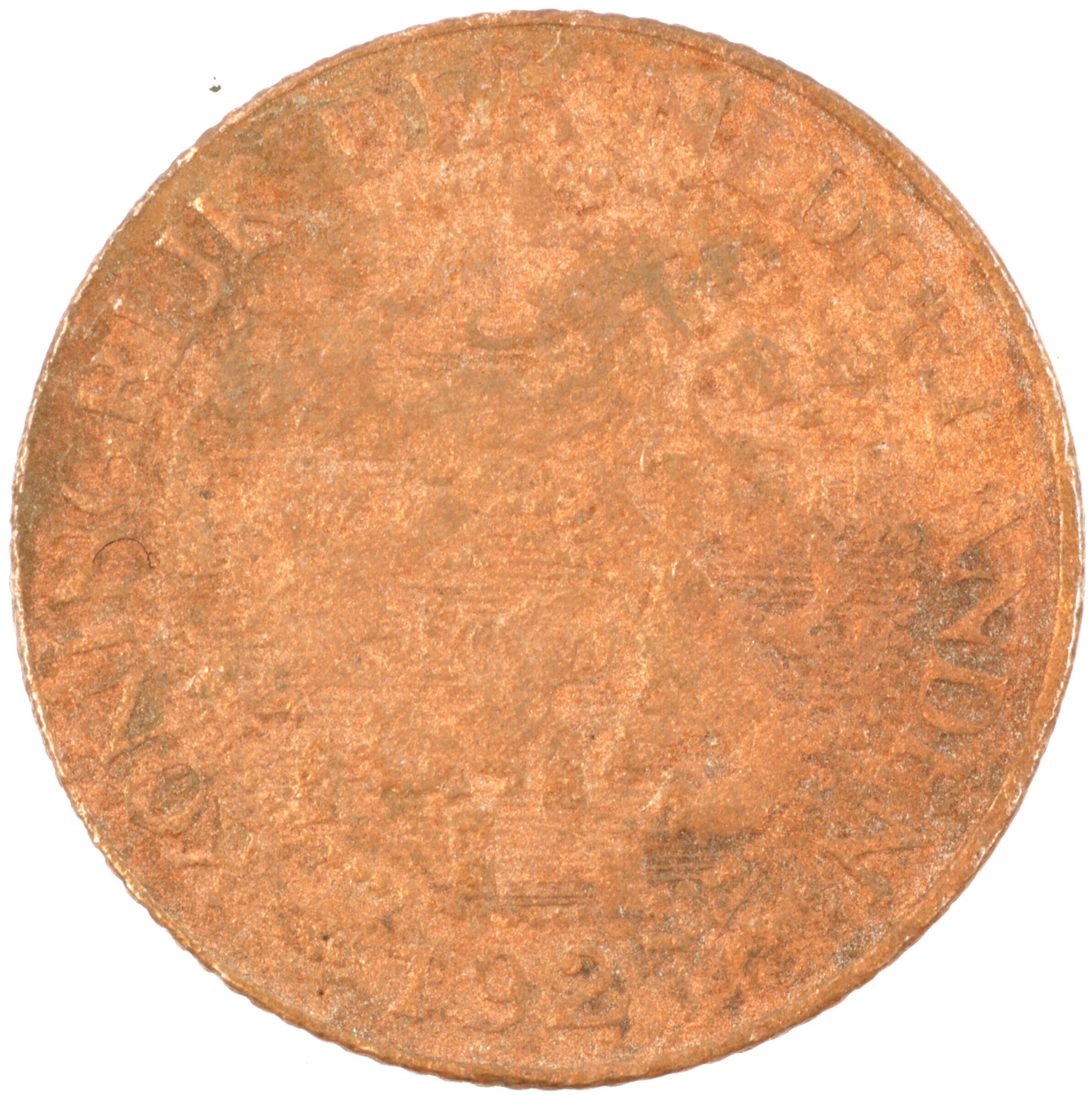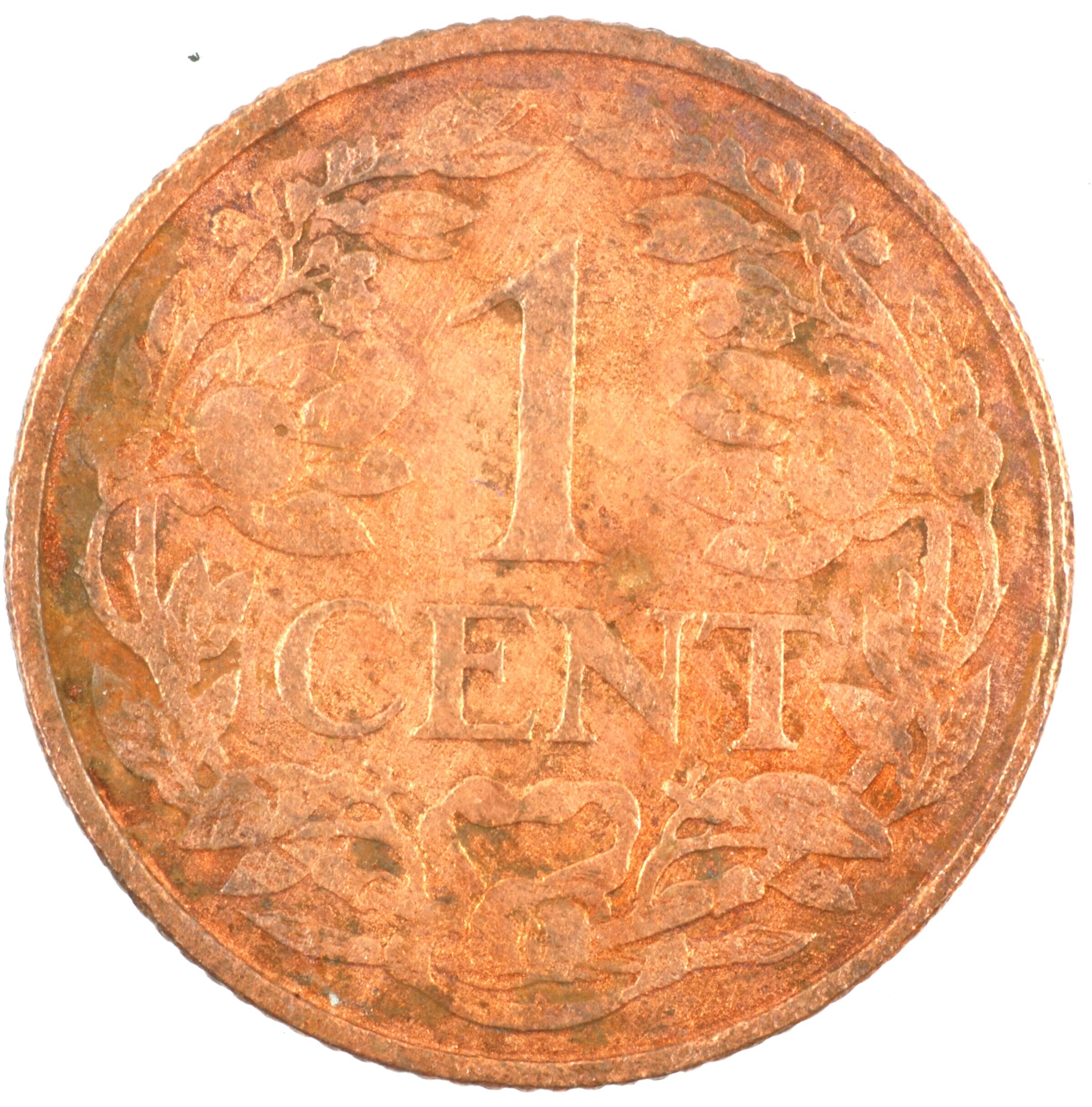 Cent; Nederland Koninkrijk (1813-heden); Wilhelmina (1890-1948); vz.: klimmende leeuw naar links met zwaard en pijlenbundel op een veld van azuur met zeventien blokken binnen parelcirkel, met omschrift (zeepaardje) KONINGRIJK DER NEDERLANDEN (mercuriusstaf) 1927; kz.: binnen een krans van twee samengebonden oranjetakken in twee regels: 1 / CENT; muntplaats: Utrecht; 2.31 gram; referentie: Schulman 989