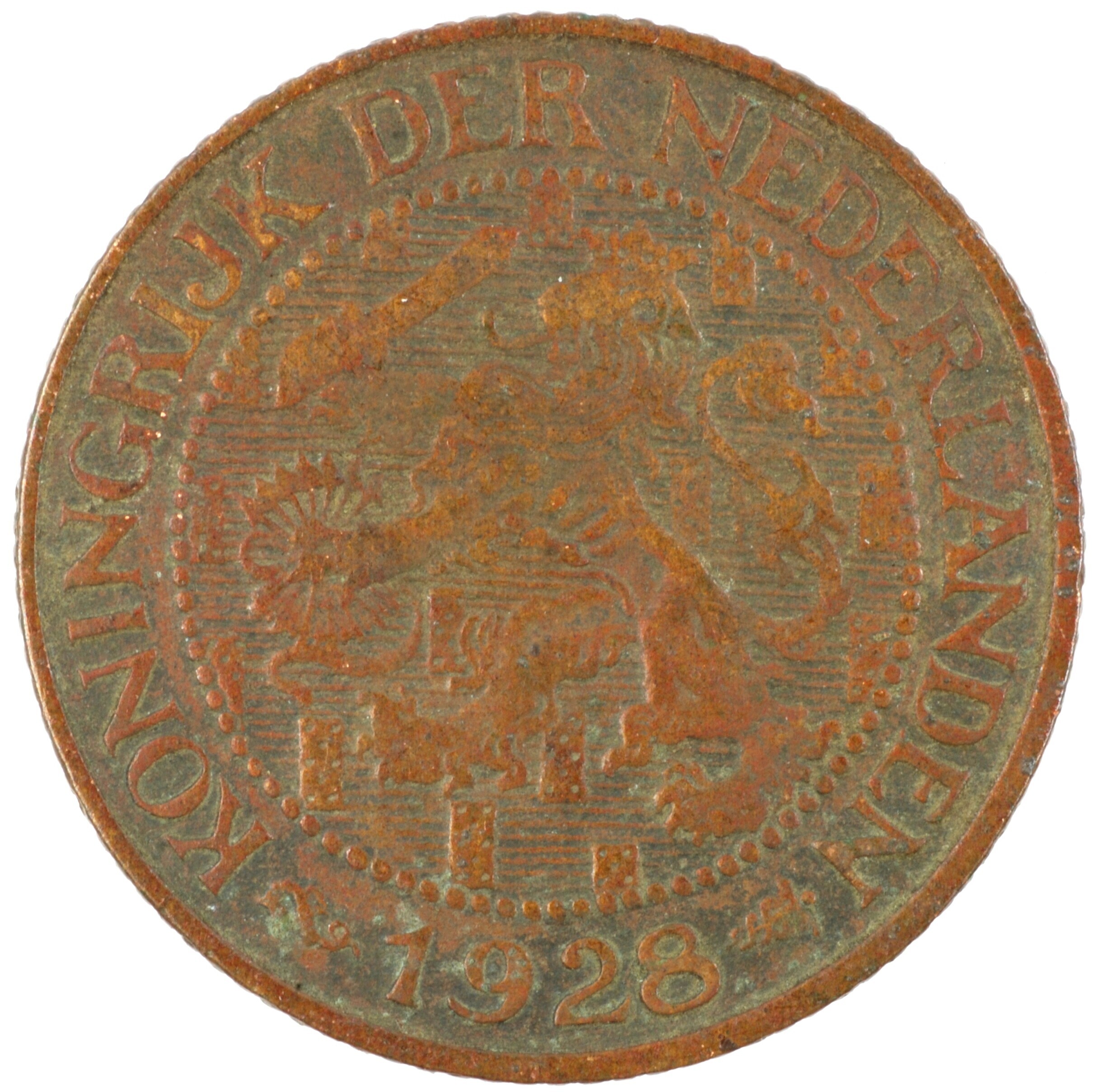 Cent; Nederland Koninkrijk (1813-heden); Wilhelmina (1890-1948); vz.: klimmende leeuw naar links met zwaard en pijlenbundel op een veld van azuur met zeventien blokken binnen parelcirkel, met omschrift (zeepaardje) KONINGRIJK DER NEDERLANDEN (mercuriusstaf) 1928; kz.: binnen een krans van twee samengebonden oranjetakken in twee regels: 1 / CENT; muntplaats: Utrecht; 2.47 gram; referentie: Schulman 990