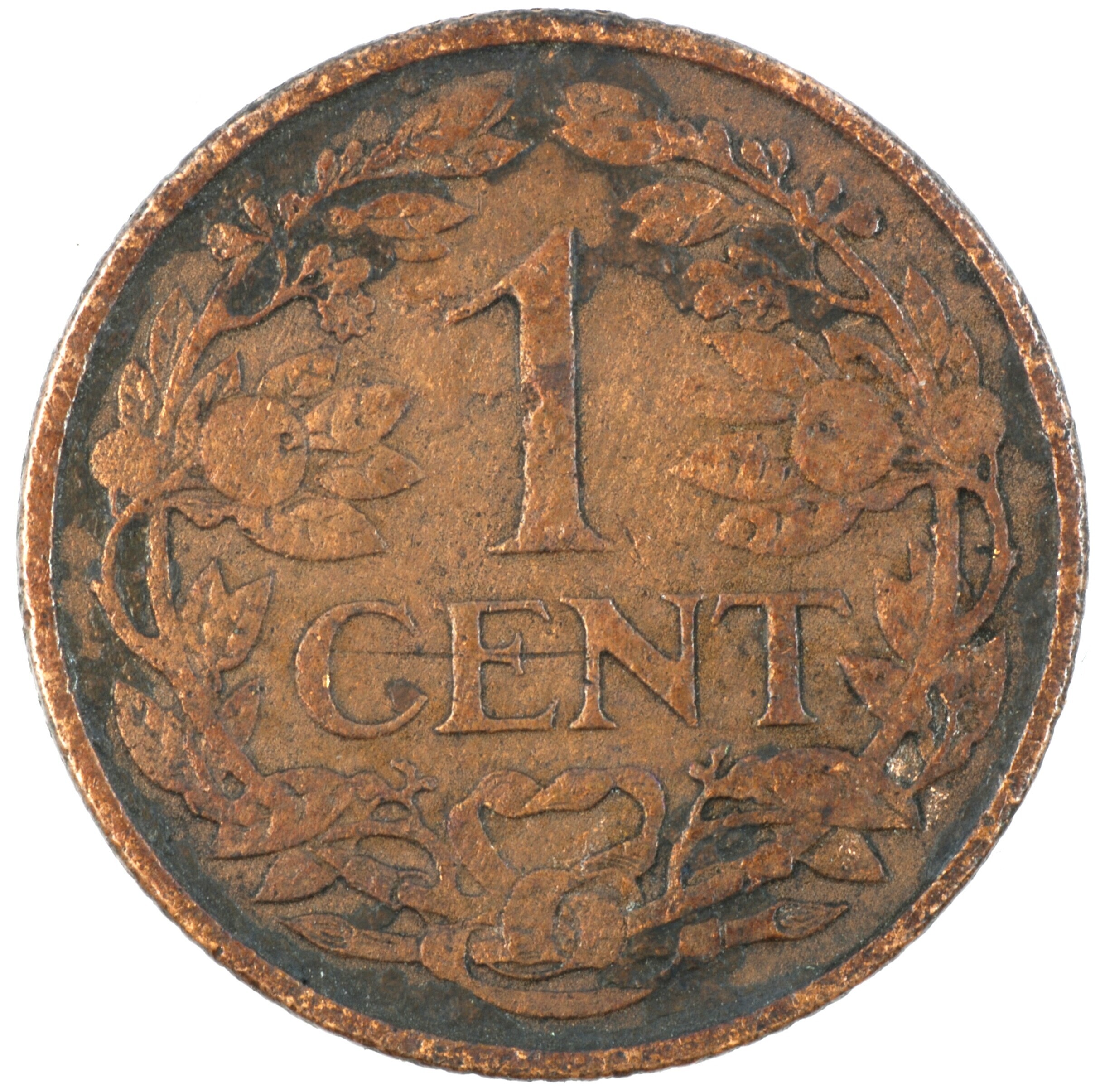 Cent; Nederland Koninkrijk (1813-heden); Wilhelmina (1890-1948); vz.: klimmende leeuw naar links met zwaard en pijlenbundel op een veld van azuur met zeventien blokken binnen parelcirkel, met omschrift (zeepaardje) KONINGRIJK DER NEDERLANDEN (mercuriusstaf) 1928; kz.: binnen een krans van twee samengebonden oranjetakken in twee regels: 1 / CENT; muntplaats: Utrecht; 2.26 gram; referentie: Schulman 990