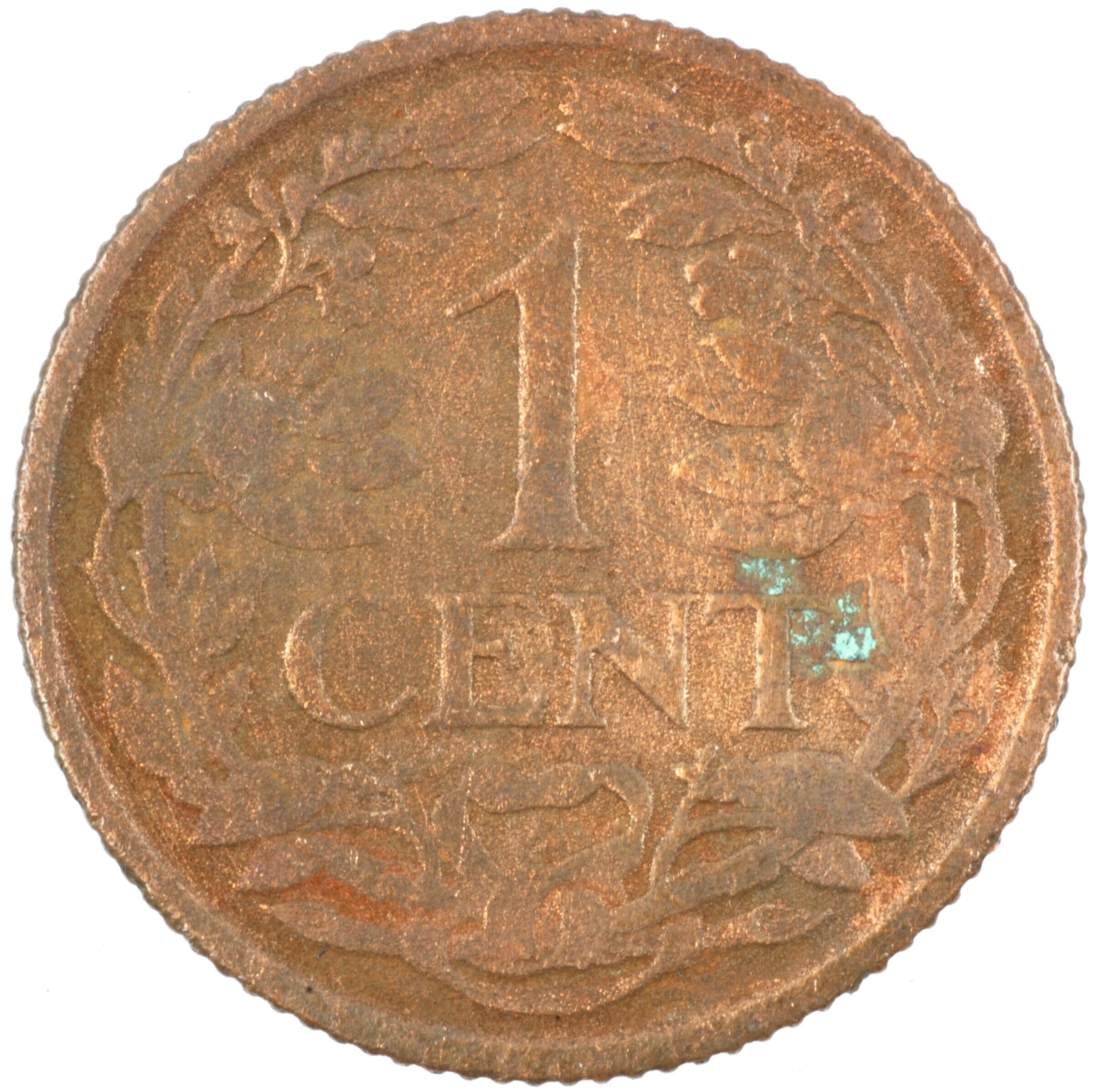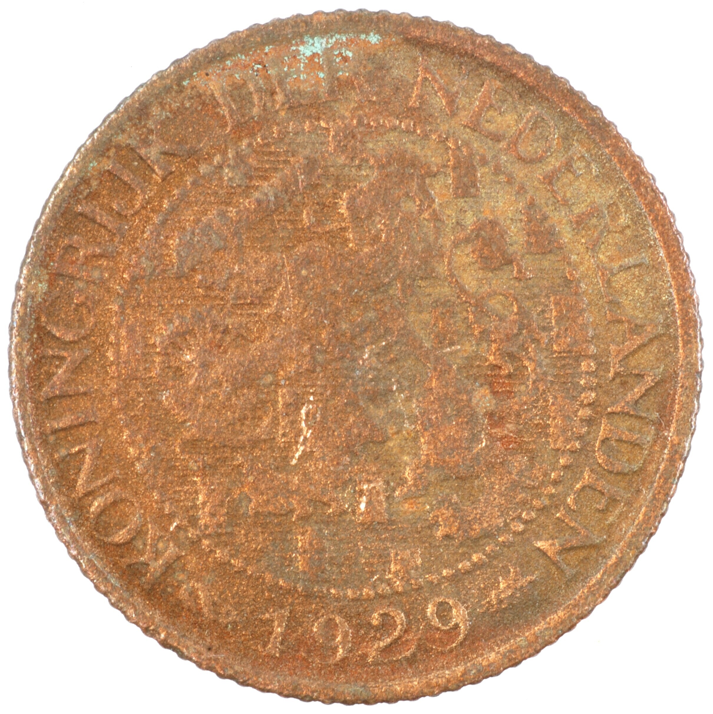 Cent; Nederland Koninkrijk (1813-heden); Wilhelmina (1890-1948); vz.: klimmende leeuw naar links met zwaard en pijlenbundel op een veld van azuur met zeventien blokken binnen parelcirkel, met omschrift (zeepaardje) KONINGRIJK DER NEDERLANDEN (mercuriusstaf) 1929; kz.: binnen een krans van twee samengebonden oranjetakken in twee regels: 1 / CENT; muntplaats: Utrecht; 2.24 gram; referentie: Schulman 991