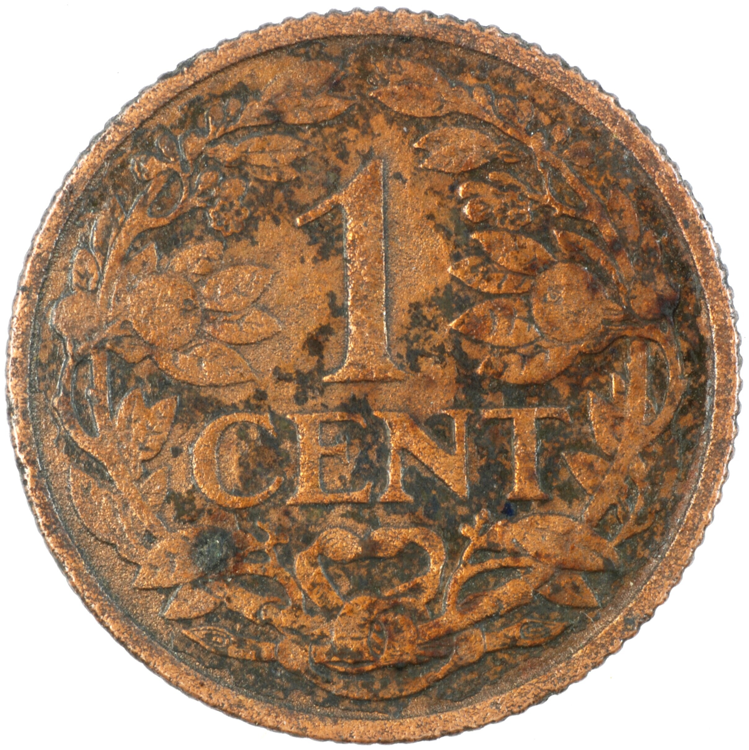 Cent; Nederland Koninkrijk (1813-heden); Wilhelmina (1890-1948); vz.: klimmende leeuw naar links met zwaard en pijlenbundel op een veld van azuur met zeventien blokken binnen parelcirkel, met omschrift (zeepaardje) KONINGRIJK DER NEDERLANDEN (mercuriusstaf) 1929; kz.: binnen een krans van twee samengebonden oranjetakken in twee regels: 1 / CENT; muntplaats: Utrecht; 2.33 gram; referentie: Schulman 991