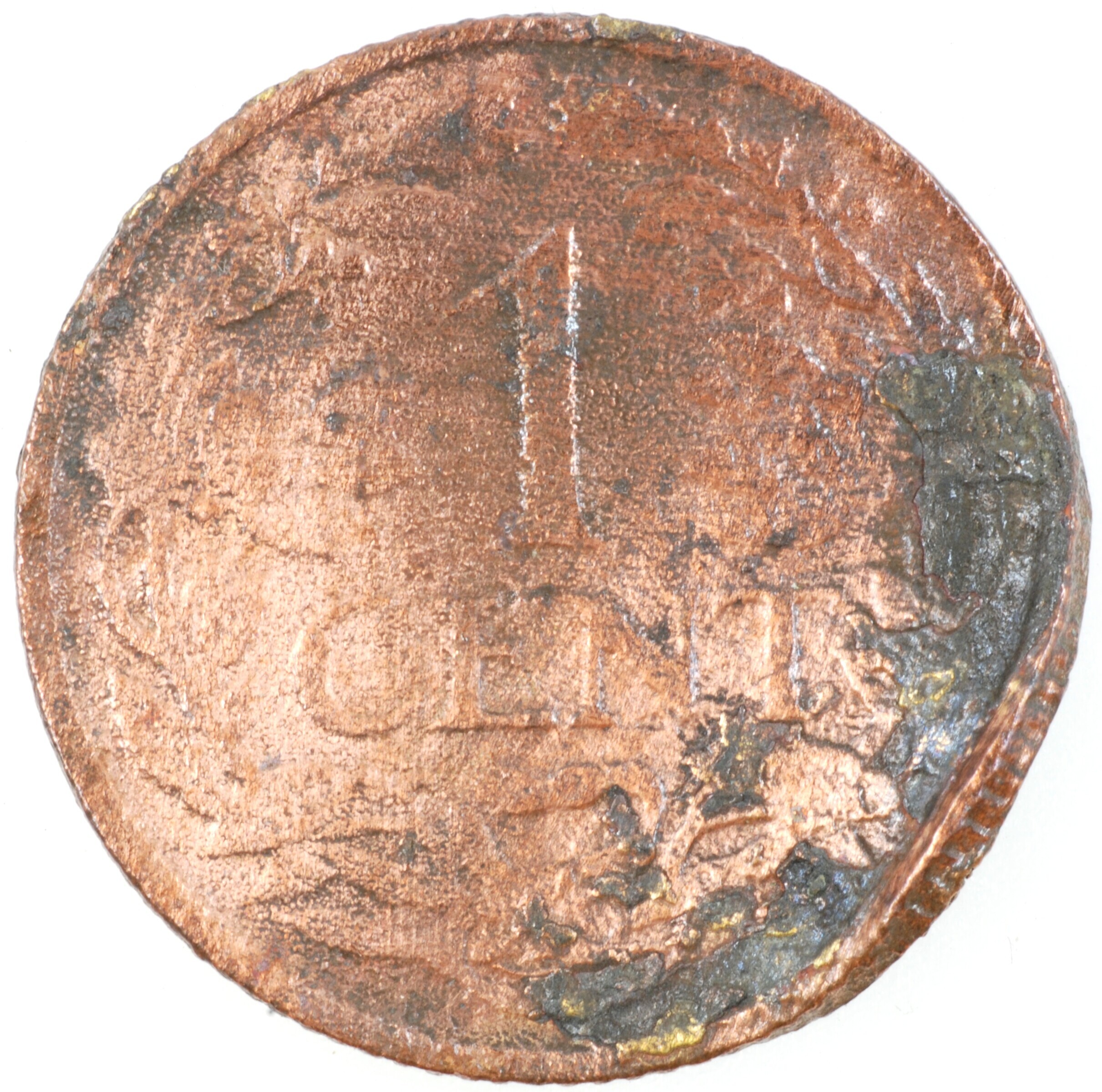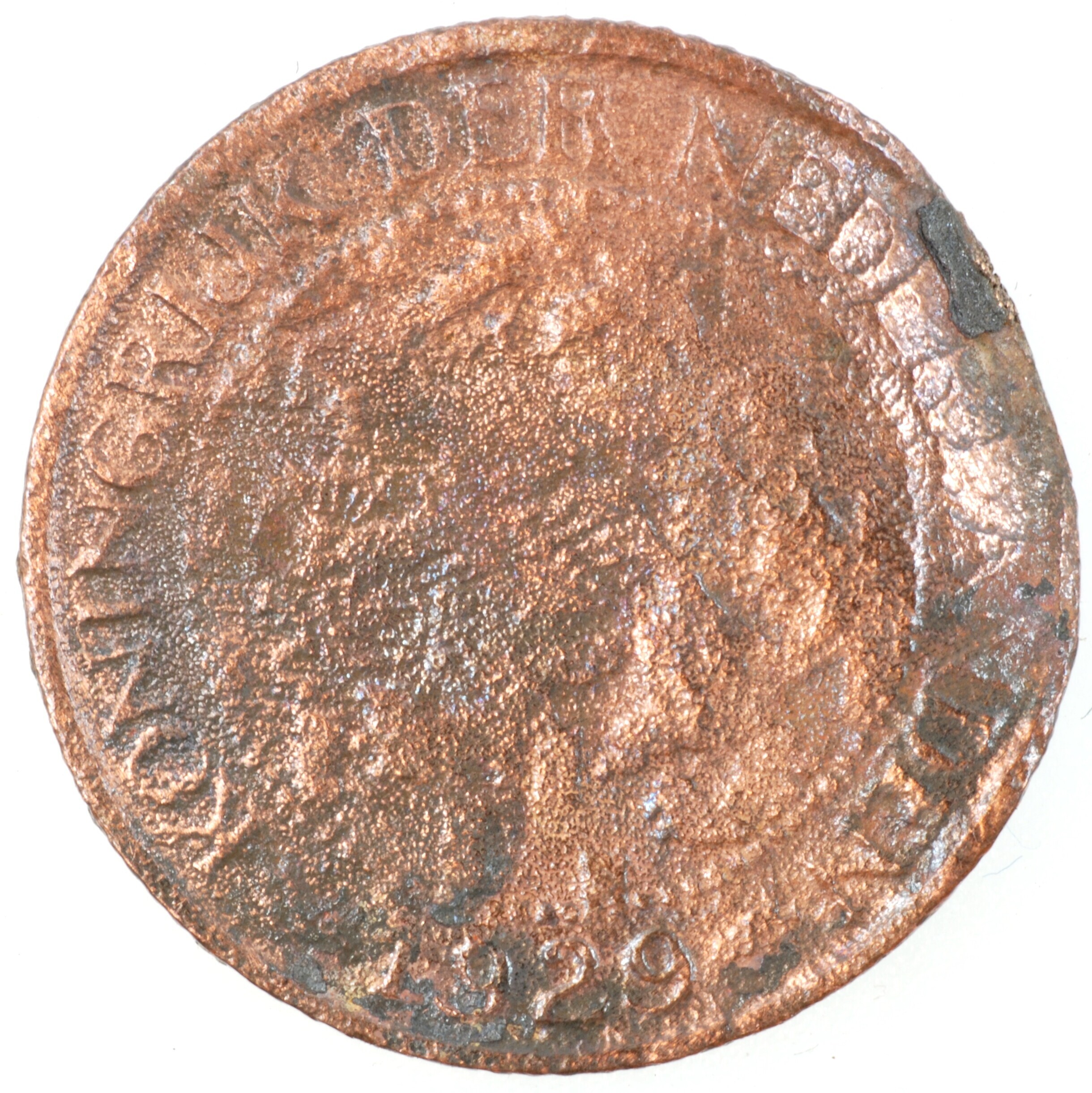 Cent; Nederland Koninkrijk (1813-heden); Wilhelmina (1890-1948); vz.: klimmende leeuw naar links met zwaard en pijlenbundel op een veld van azuur met zeventien blokken binnen parelcirkel, met omschrift (zeepaardje) KONINGRIJK DER NEDERLANDEN (mercuriusstaf) 1929; kz.: binnen een krans van twee samengebonden oranjetakken in twee regels: 1 / CENT; muntplaats: Utrecht; 1.99 gram; referentie: Schulman 991
