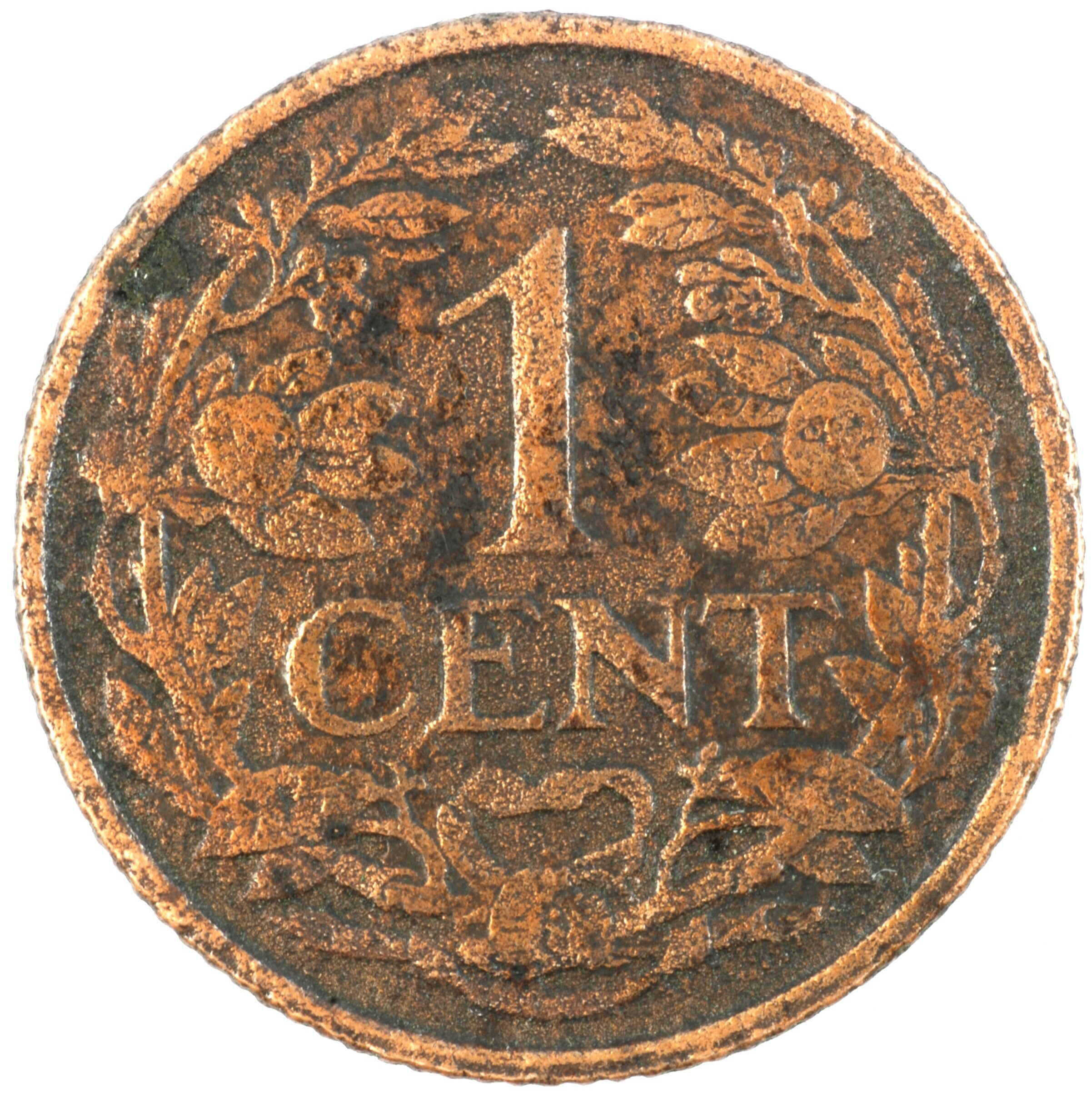 Cent; Nederland Koninkrijk (1813-heden); Wilhelmina (1890-1948); vz.: klimmende leeuw naar links met zwaard en pijlenbundel op een veld van azuur met zeventien blokken binnen parelcirkel, met omschrift (druiventros) KONINGRIJK DER NEDERLANDEN (mercuriusstaf) 1937; kz.: binnen een krans van twee samengebonden oranjetakken in twee regels: 1 / CENT; muntplaats: Utrecht; 2.34 gram; referentie: Schulman 994