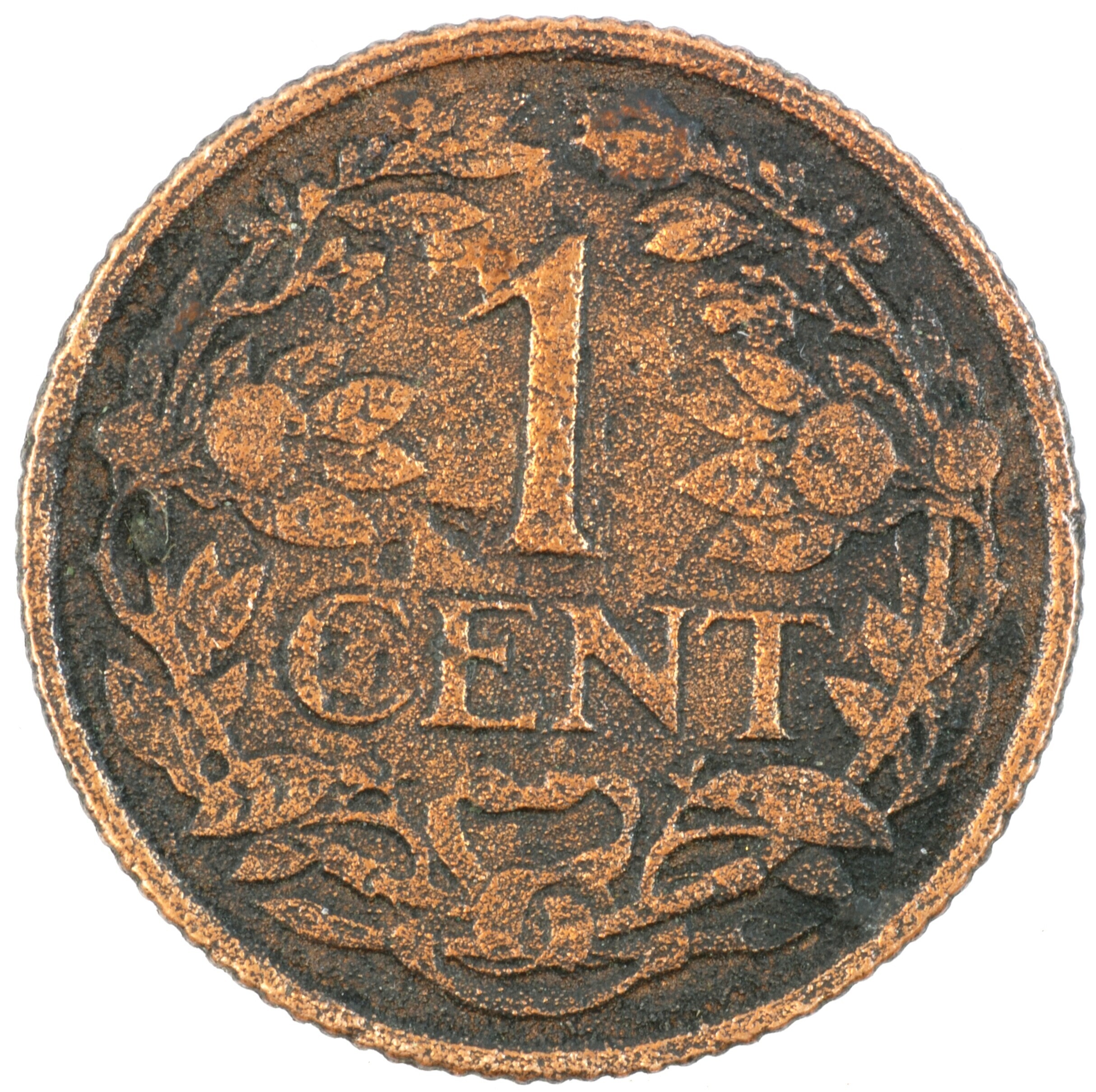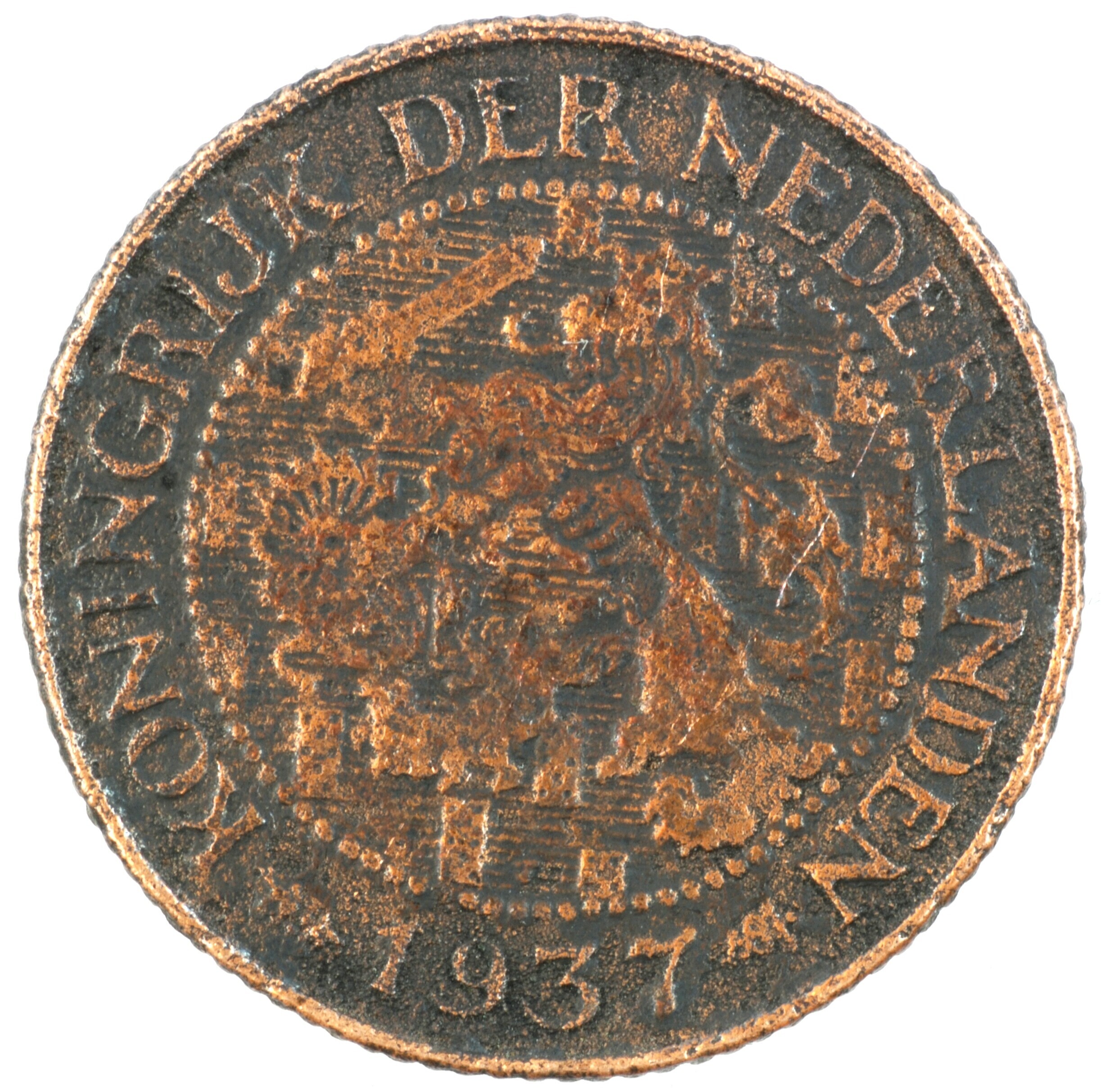 Cent; Nederland Koninkrijk (1813-heden); Wilhelmina (1890-1948); vz.: klimmende leeuw naar links met zwaard en pijlenbundel op een veld van azuur met zeventien blokken binnen parelcirkel, met omschrift (druiventros) KONINGRIJK DER NEDERLANDEN (mercuriusstaf) 1937; kz.: binnen een krans van twee samengebonden oranjetakken in twee regels: 1 / CENT; muntplaats: Utrecht; 2.16 gram; referentie: Schulman 994