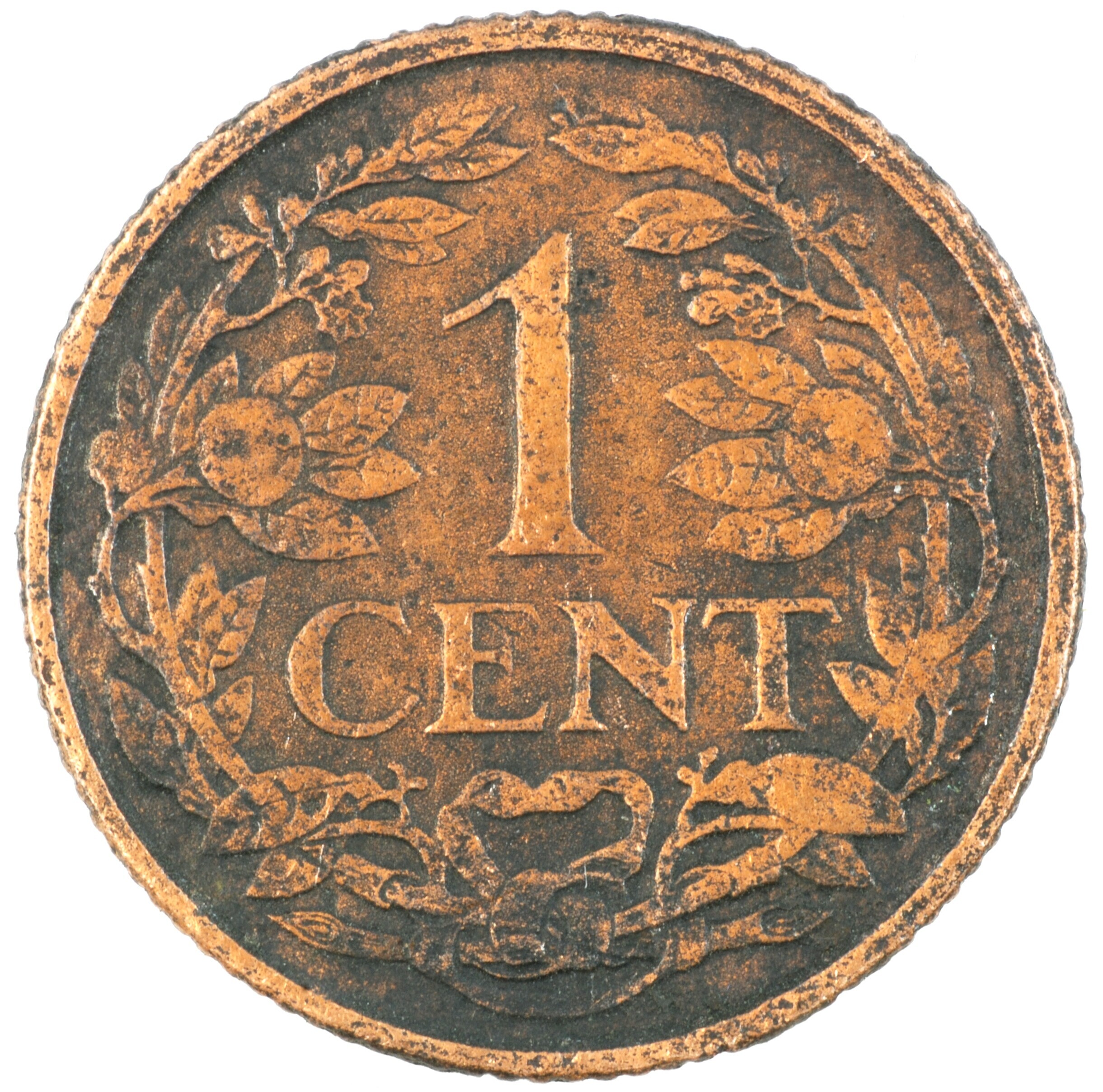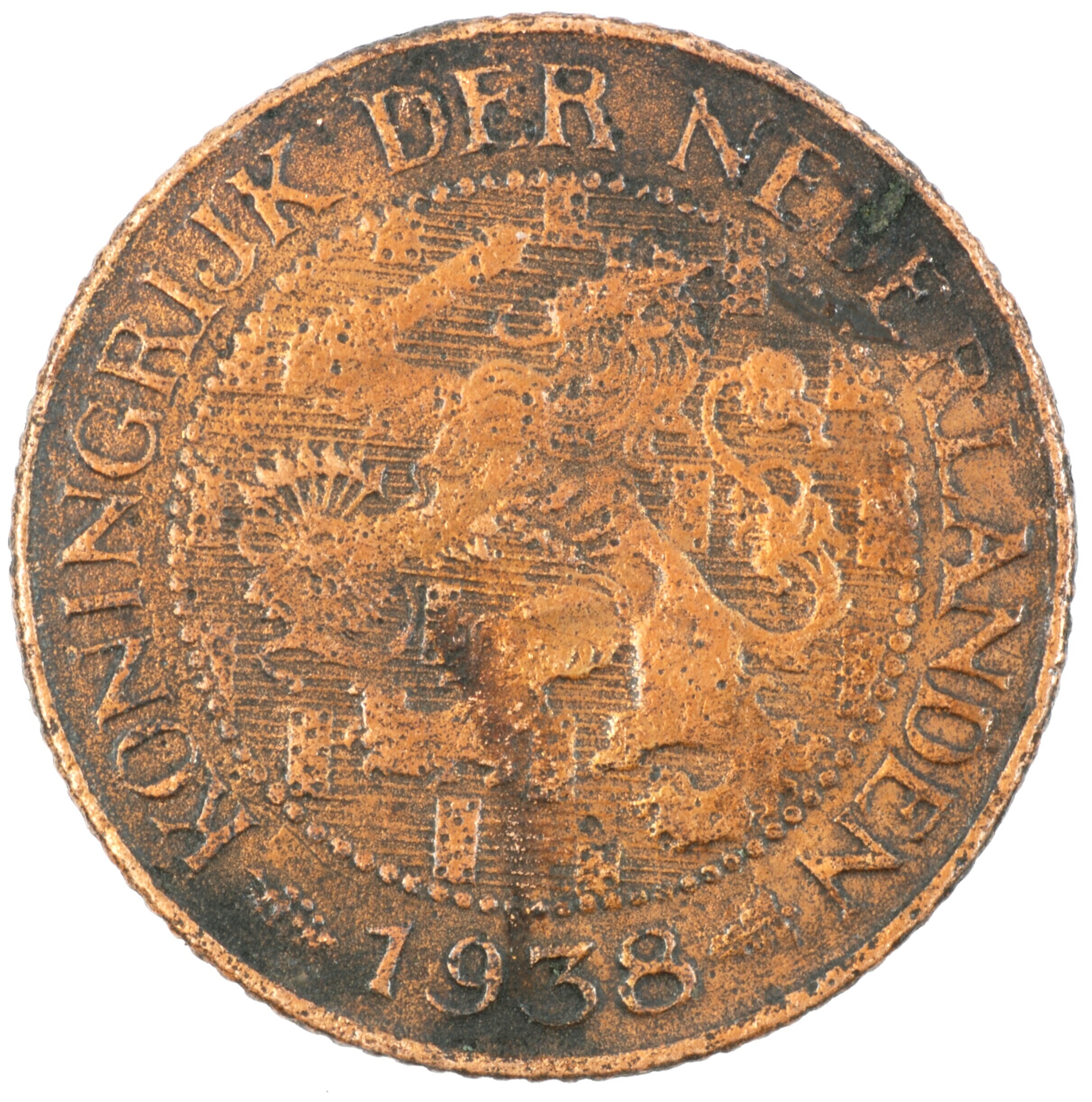 Cent; Nederland Koninkrijk (1813-heden); Wilhelmina (1890-1948); vz.: klimmende leeuw naar links met zwaard en pijlenbundel op een veld van azuur met zeventien blokken binnen parelcirkel, met omschrift (druiventros) KONINGRIJK DER NEDERLANDEN (mercuriusstaf) 1938; kz.: binnen een krans van twee samengebonden oranjetakken in twee regels: 1 / CENT; muntplaats: Utrecht; 2.17 gram; referentie: Schulman 995