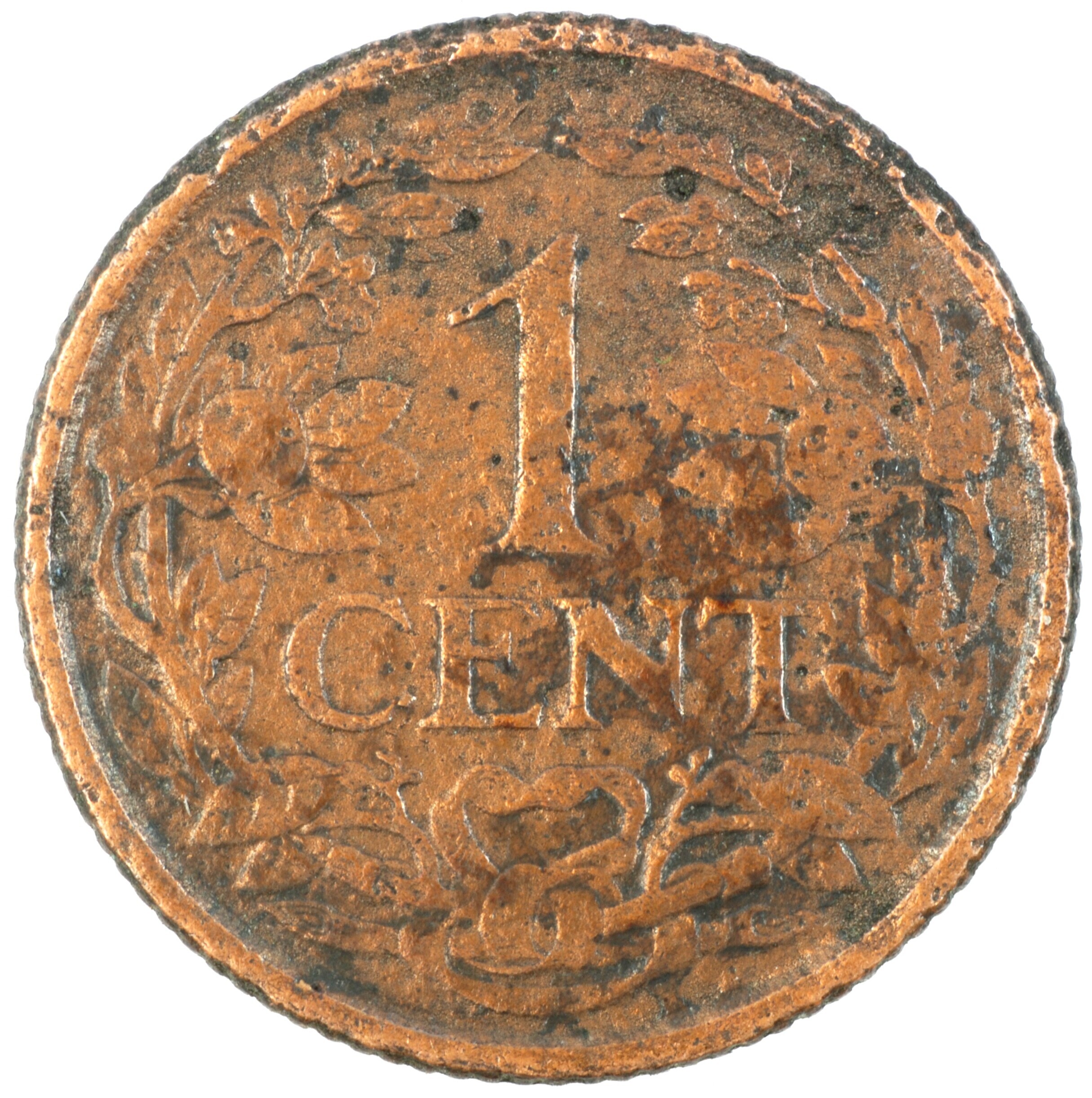 Cent; Nederland Koninkrijk (1813-heden); Wilhelmina (1890-1948); vz.: klimmende leeuw naar links met zwaard en pijlenbundel op een veld van azuur met zeventien blokken binnen parelcirkel, met omschrift (druiventros) KONINGRIJK DER NEDERLANDEN (mercuriusstaf) 1938; kz.: binnen een krans van twee samengebonden oranjetakken in twee regels: 1 / CENT; muntplaats: Utrecht; 2.38 gram; referentie: Schulman 995