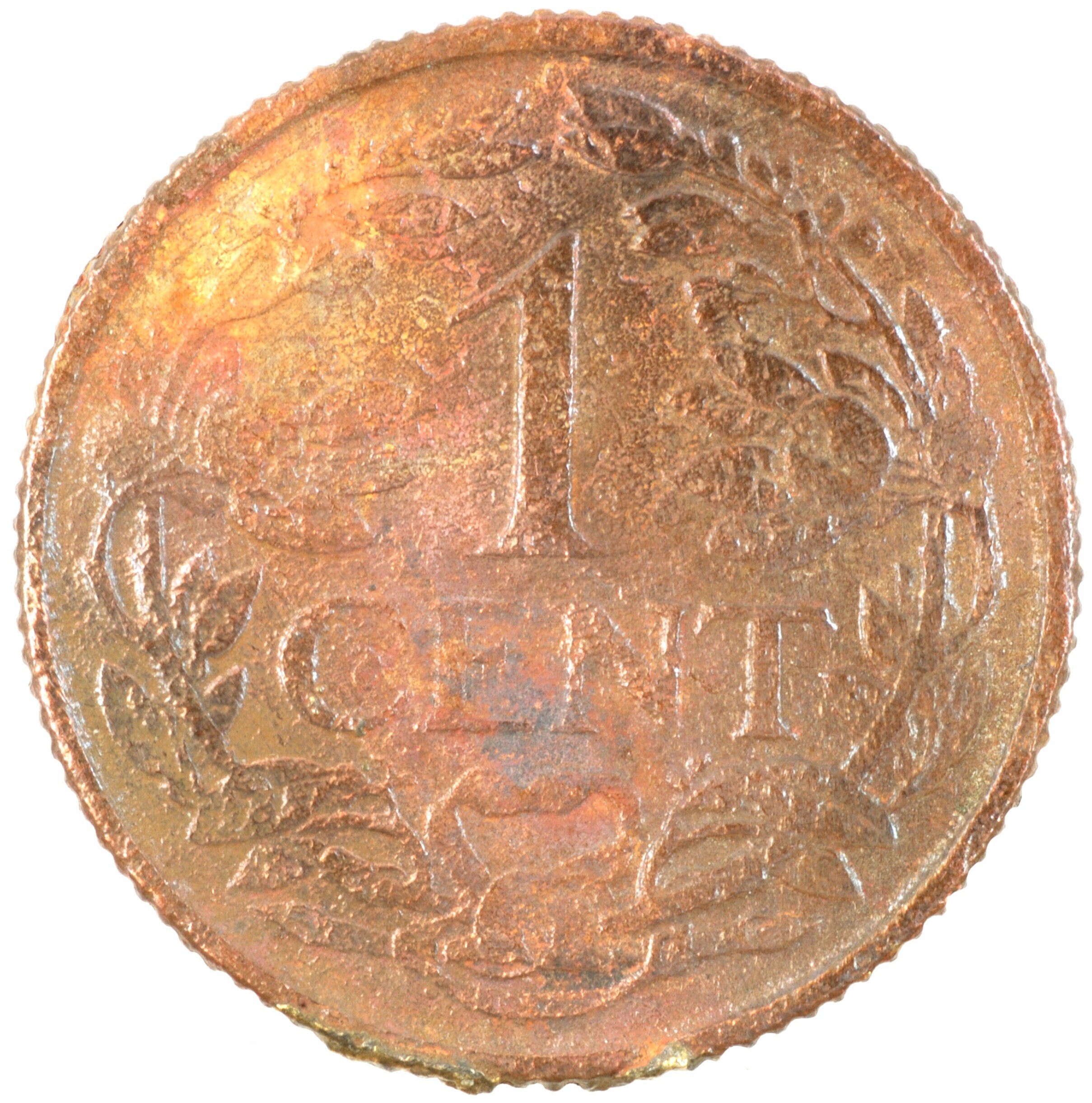Cent; Nederland Koninkrijk (1813-heden); Wilhelmina (1890-1948); vz.: klimmende leeuw naar links met zwaard en pijlenbundel op een veld van azuur met zeventien blokken binnen parelcirkel, met omschrift (druiventros) KONINGRIJK DER NEDERLANDEN (mercuriusstaf) 1938; kz.: binnen een krans van twee samengebonden oranjetakken in twee regels: 1 / CENT; muntplaats: Utrecht; 2.24 gram; referentie: Schulman 995
