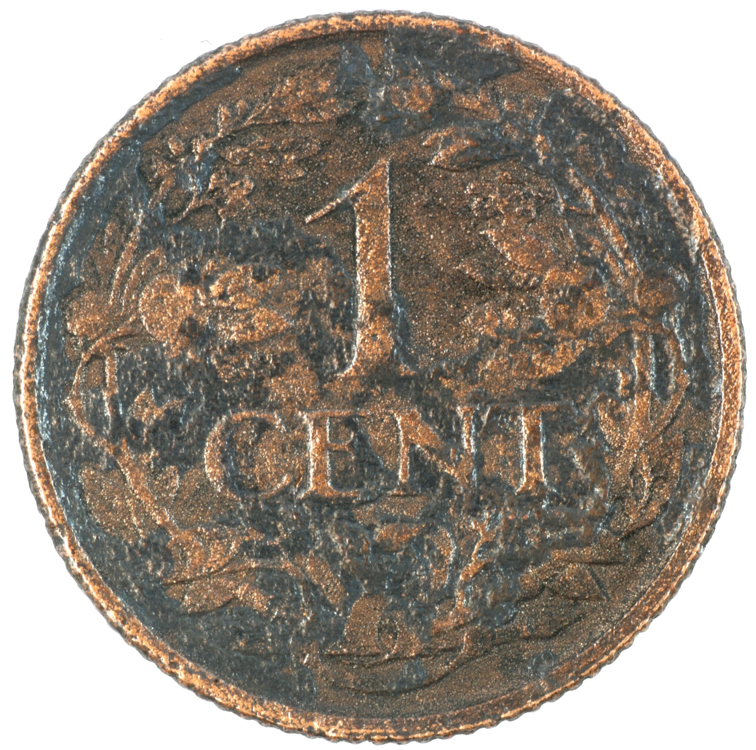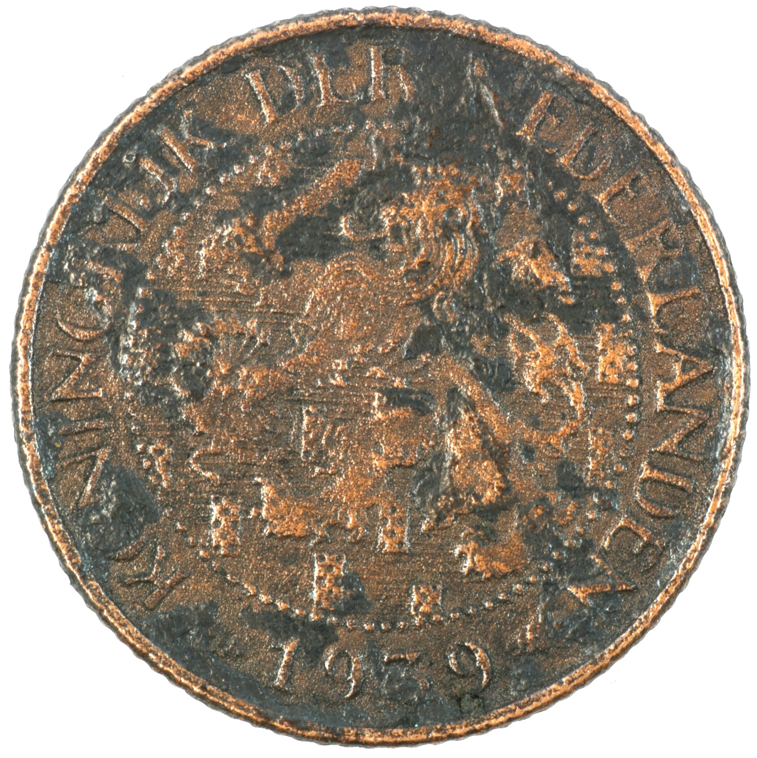 Cent; Nederland Koninkrijk (1813-heden); Wilhelmina (1890-1948); vz.: klimmende leeuw naar links met zwaard en pijlenbundel op een veld van azuur met zeventien blokken binnen parelcirkel, met omschrift (druiventros) KONINGRIJK DER NEDERLANDEN (mercuriusstaf) 1939; kz.: binnen een krans van twee samengebonden oranjetakken in twee regels: 1 / CENT; muntplaats: Utrecht; 2.21 gram; referentie: Schulman 996