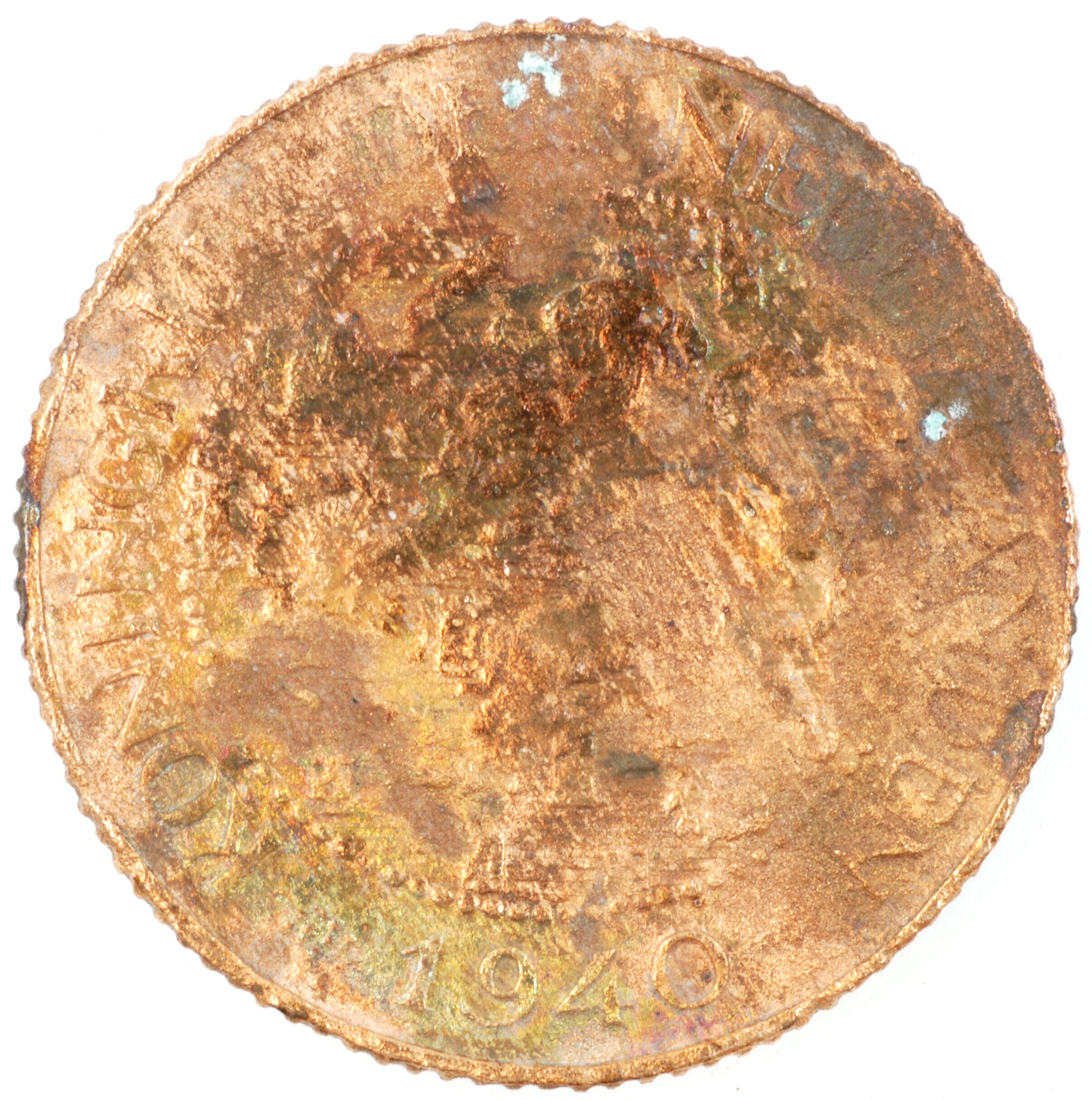 Cent; Nederland Koninkrijk (1813-heden); Wilhelmina (1890-1948); vz.: klimmende leeuw naar links met zwaard en pijlenbundel op een veld van azuur met zeventien blokken binnen parelcirkel, met omschrift (druiventros) KONINGRIJK DER NEDERLANDEN (mercuriusstaf) 1940; kz.: binnen een krans van twee samengebonden oranjetakken in twee regels: 1 / CENT; muntplaats: Utrecht; 2.21 gram; referentie: Schulman 997