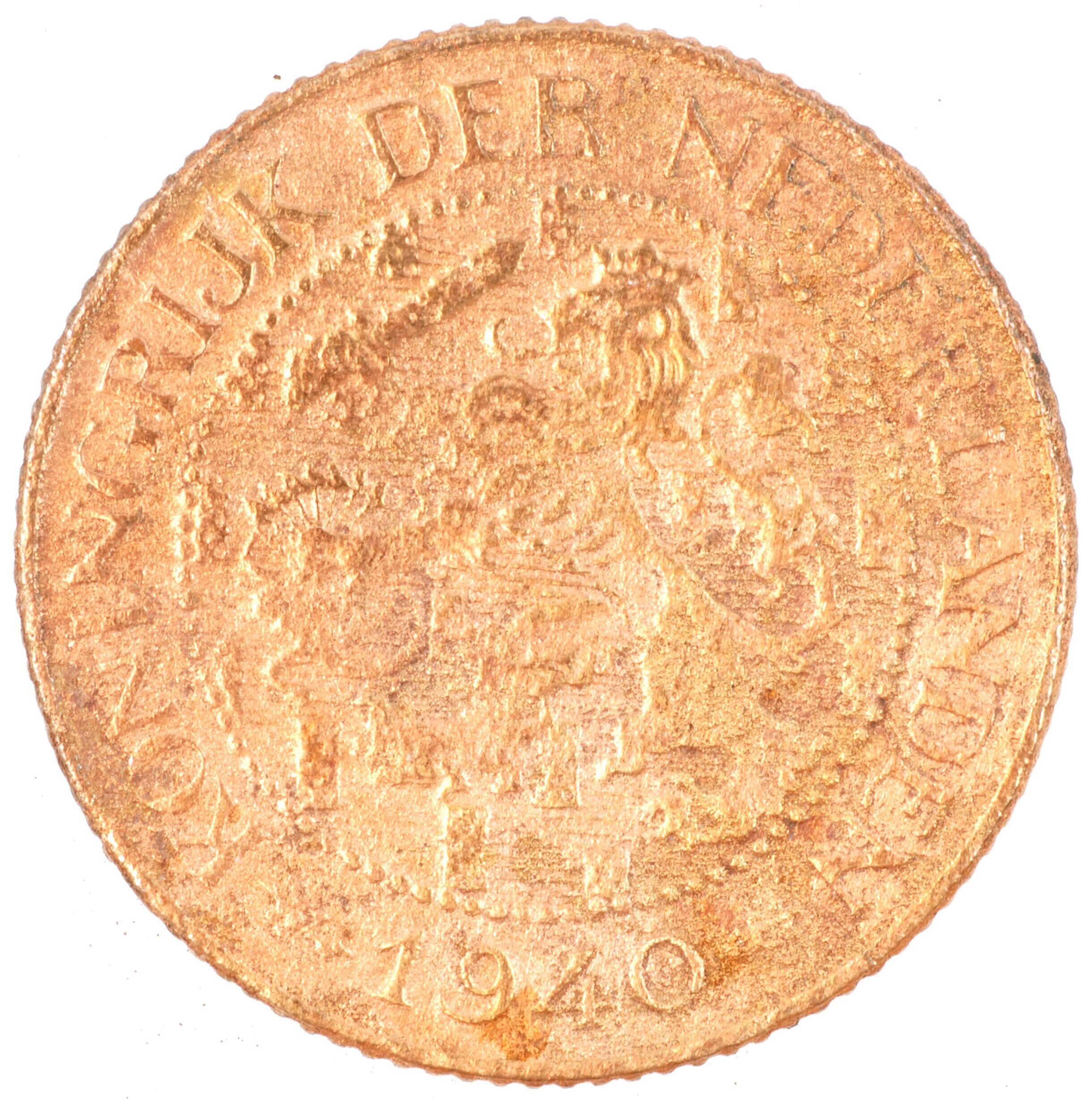 Cent; Nederland Koninkrijk (1813-heden); Wilhelmina (1890-1948); vz.: klimmende leeuw naar links met zwaard en pijlenbundel op een veld van azuur met zeventien blokken binnen parelcirkel, met omschrift (druiventros) KONINGRIJK DER NEDERLANDEN (mercuriusstaf) 1940; kz.: binnen een krans van twee samengebonden oranjetakken in twee regels: 1 / CENT; muntplaats: Utrecht; 2.27 gram; referentie: Schulman 997