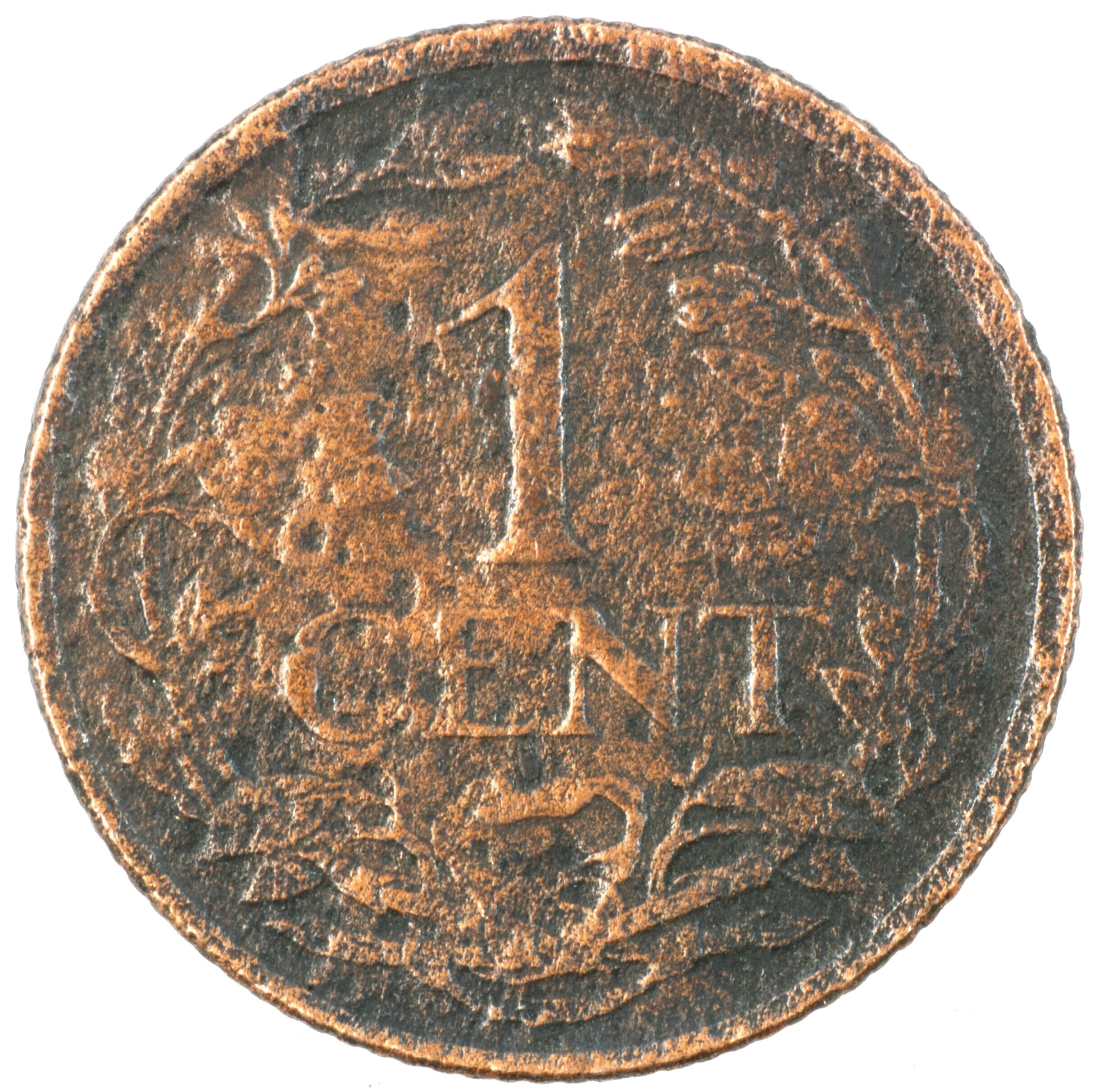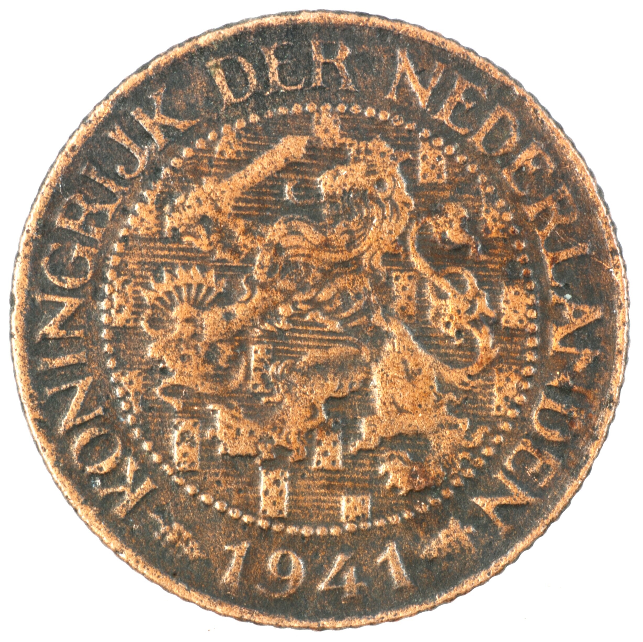 Cent; Nederland Koninkrijk (1813-heden); Wilhelmina (1890-1948); vz.: klimmende leeuw naar links met zwaard en pijlenbundel op een veld van azuur met zeventien blokken binnen parelcirkel, met omschrift (druiventros) KONINGRIJK DER NEDERLANDEN (mercuriusstaf) 1941; kz.: binnen een krans van twee samengebonden oranjetakken in twee regels: 1 / CENT; muntplaats: Utrecht; 2.26 gram; referentie: Schulman 998