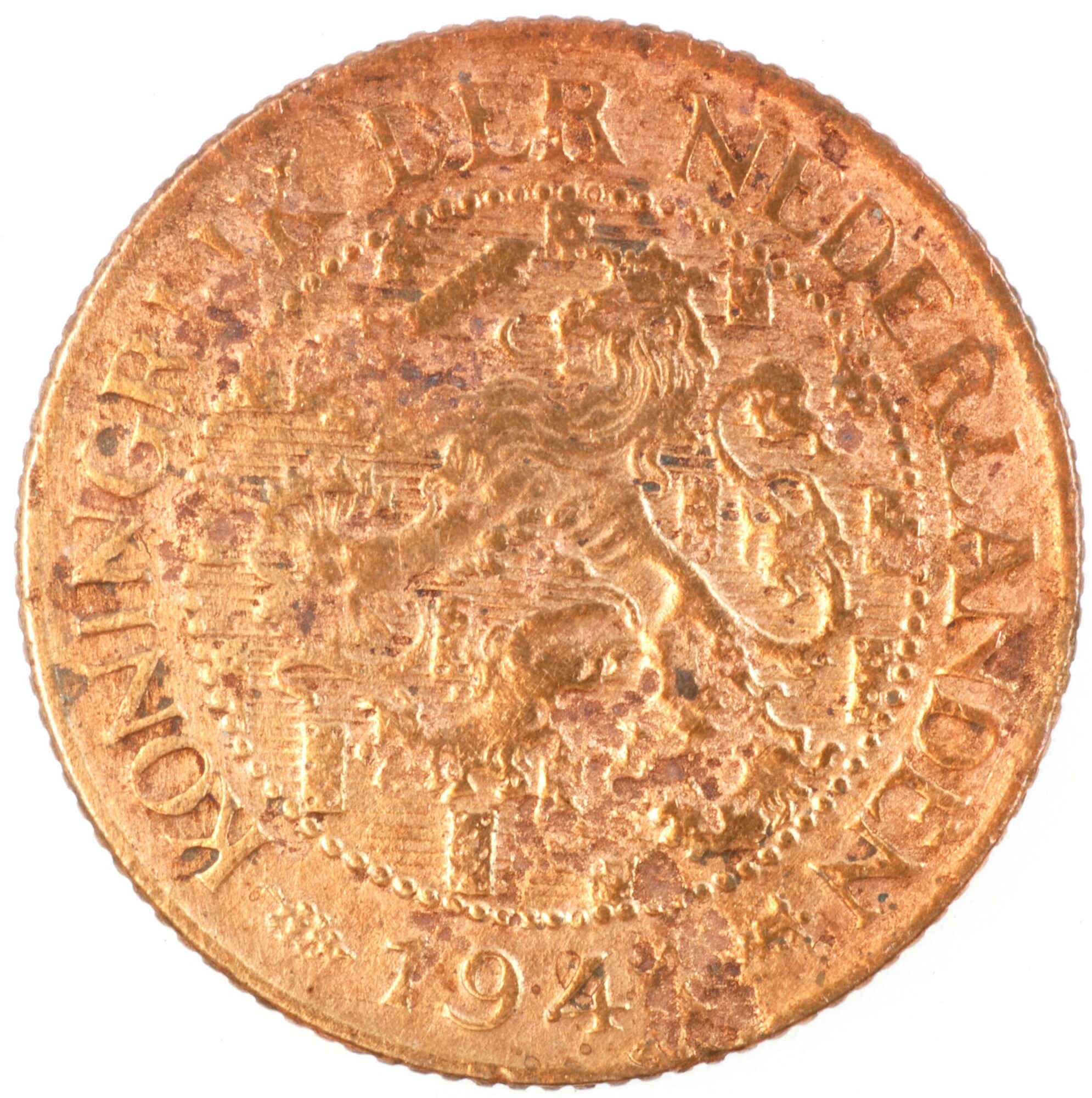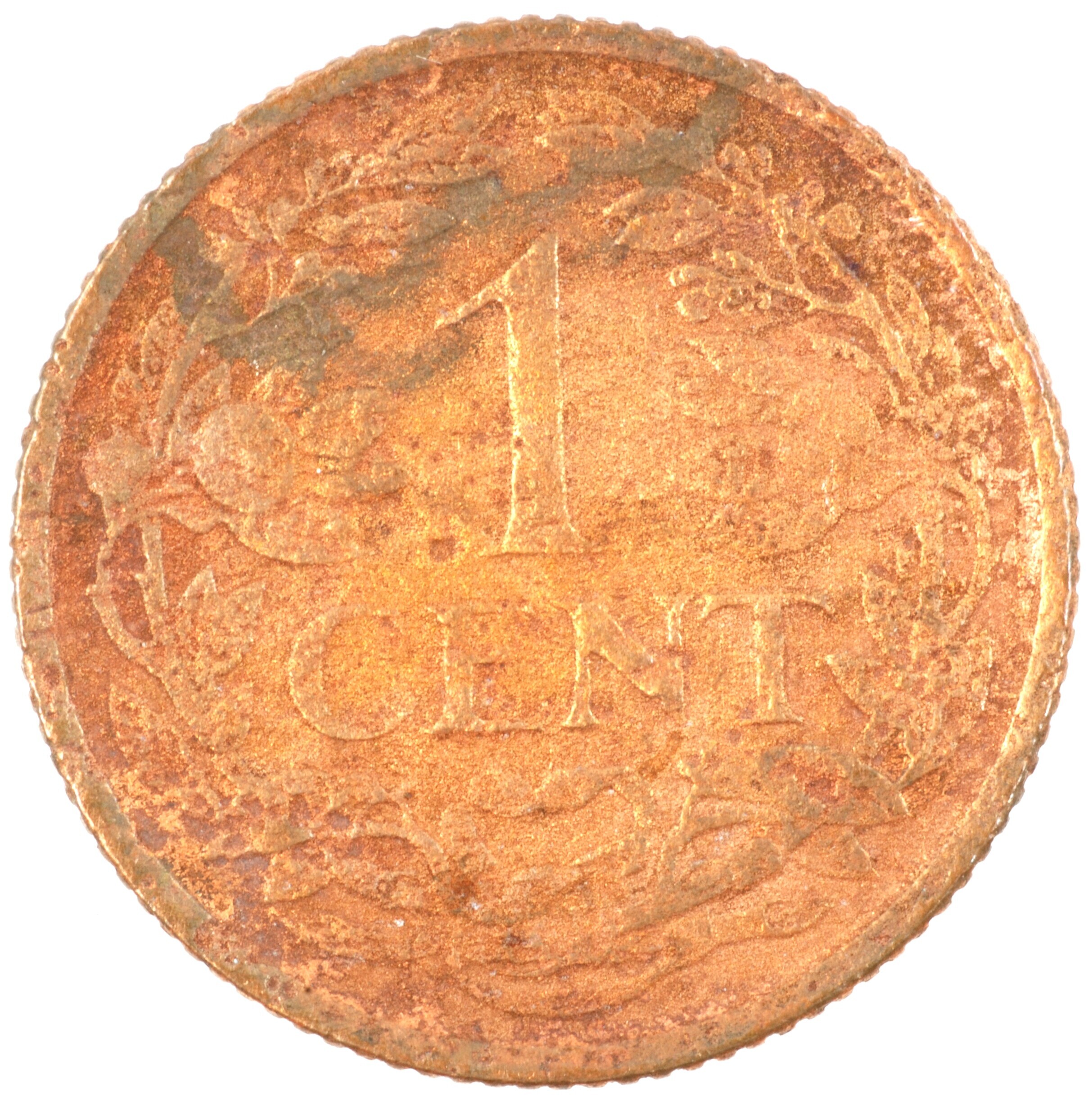 Cent; Nederland Koninkrijk (1813-heden); Wilhelmina (1890-1948); vz.: klimmende leeuw naar links met zwaard en pijlenbundel op een veld van azuur met zeventien blokken binnen parelcirkel, met omschrift (druiventros) KONINGRIJK DER NEDERLANDEN (mercuriusstaf) 1941; kz.: binnen een krans van twee samengebonden oranjetakken in twee regels: 1 / CENT; muntplaats: Utrecht; 2.38 gram; referentie: Schulman 998