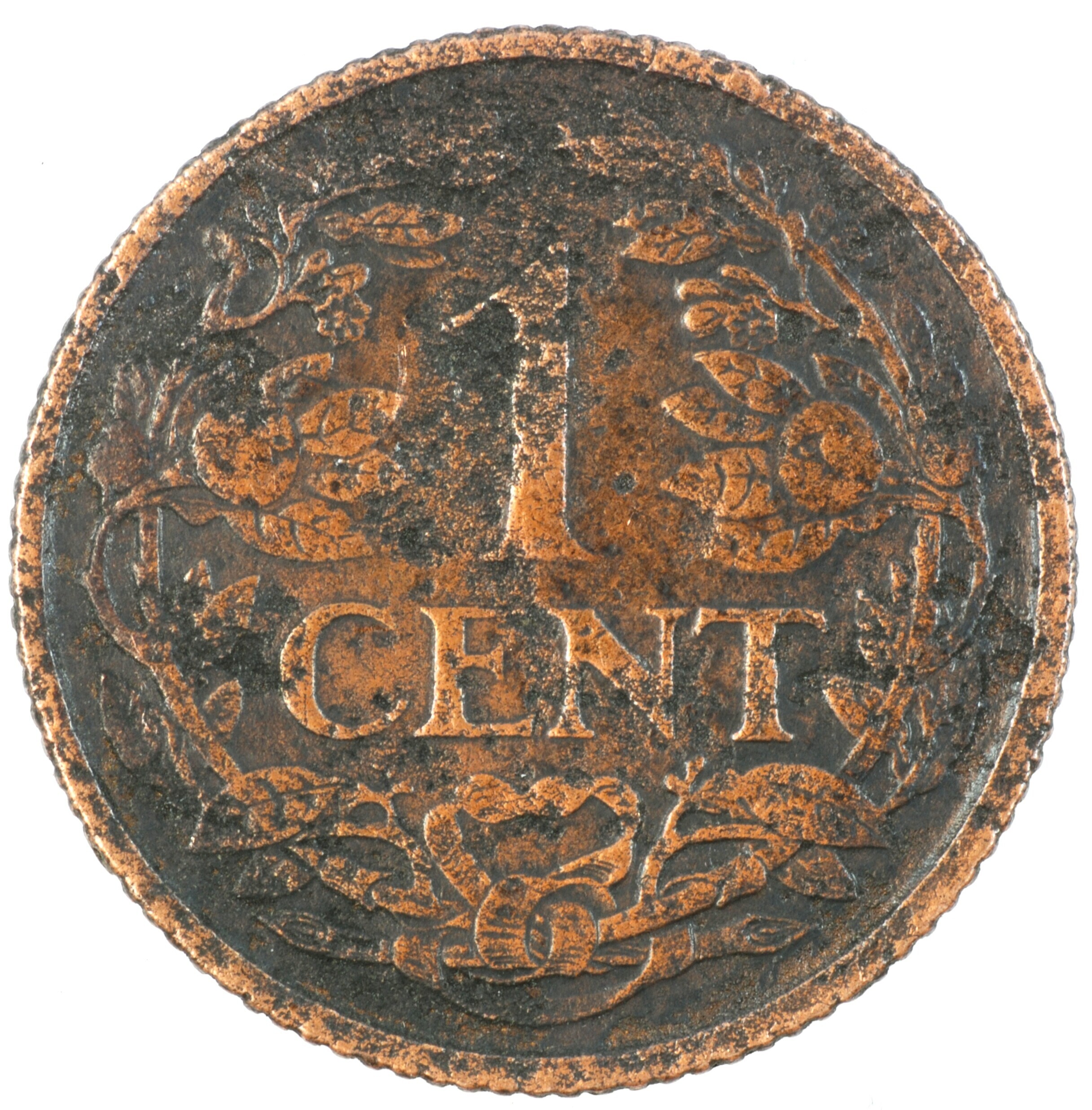 Cent; Nederland Koninkrijk (1813-heden); Wilhelmina (1890-1948); vz.: klimmende leeuw naar links met zwaard en pijlenbundel op een veld van azuur met zeventien blokken binnen parelcirkel, met omschrift (druiventros) KONINGRIJK DER NEDERLANDEN (mercuriusstaf) 1941; kz.: binnen een krans van twee samengebonden oranjetakken in twee regels: 1 / CENT; muntplaats: Utrecht; 2.38 gram; referentie: Schulman 998