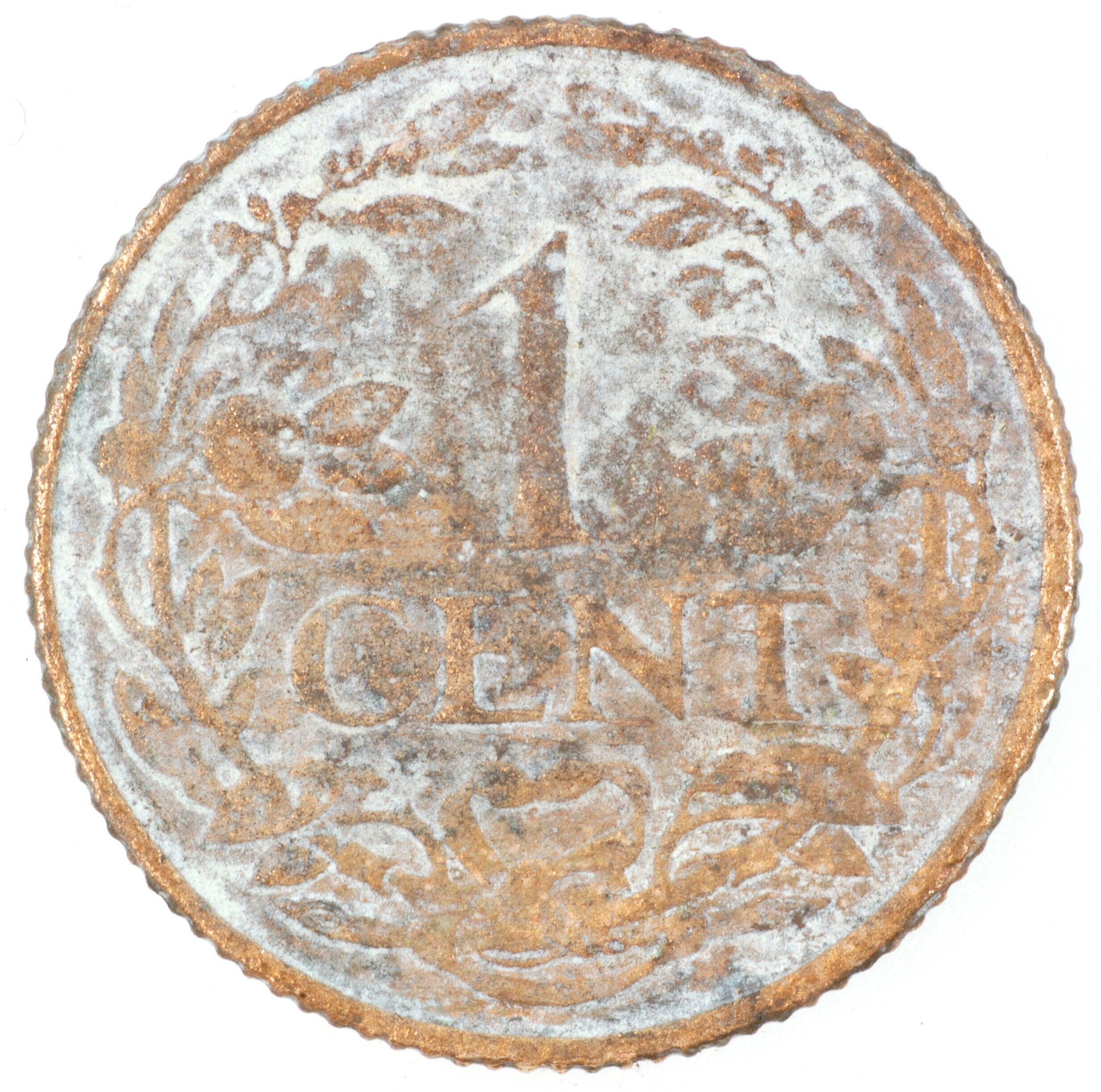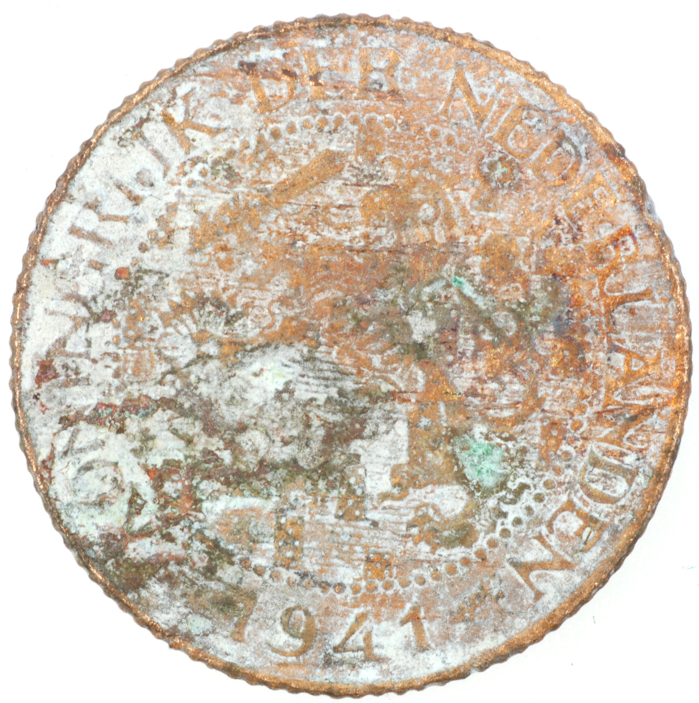 Cent; Nederland Koninkrijk (1813-heden); Wilhelmina (1890-1948); vz.: klimmende leeuw naar links met zwaard en pijlenbundel op een veld van azuur met zeventien blokken binnen parelcirkel, met omschrift (druiventros) KONINGRIJK DER NEDERLANDEN (mercuriusstaf) 1941; kz.: binnen een krans van twee samengebonden oranjetakken in twee regels: 1 / CENT; muntplaats: Utrecht; 2.21 gram; referentie: Schulman 998